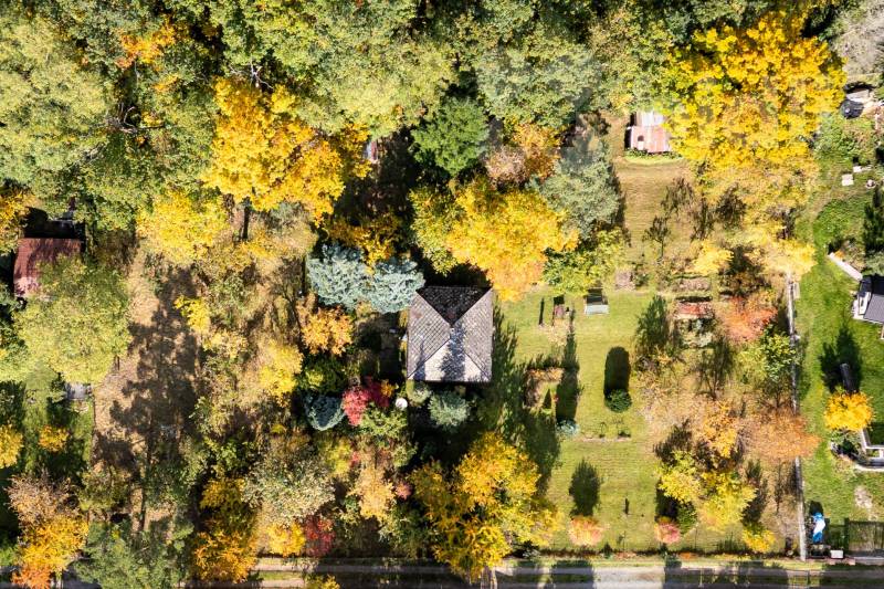 Vzrostlé ovocné stromy a další bujná zeleň.