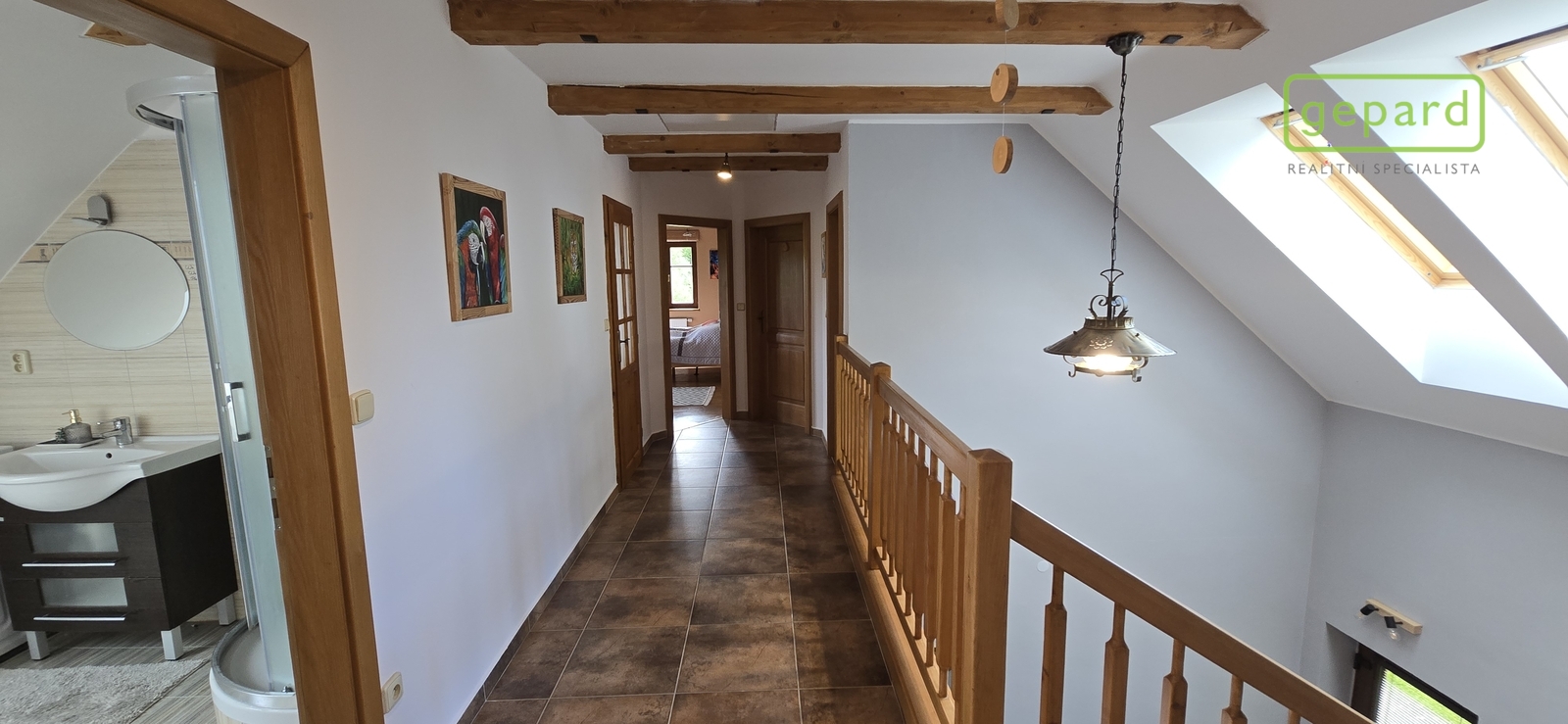 Dále posuvné dveře oddělující druhý byt se samostatným vstupem z protilehlé části domu, schodiště do patra, kde se z centrální chodby vstupuje do čtyřech podkrovních pokojům samostatné koupelny, malé kuchyně a technické místnosti.