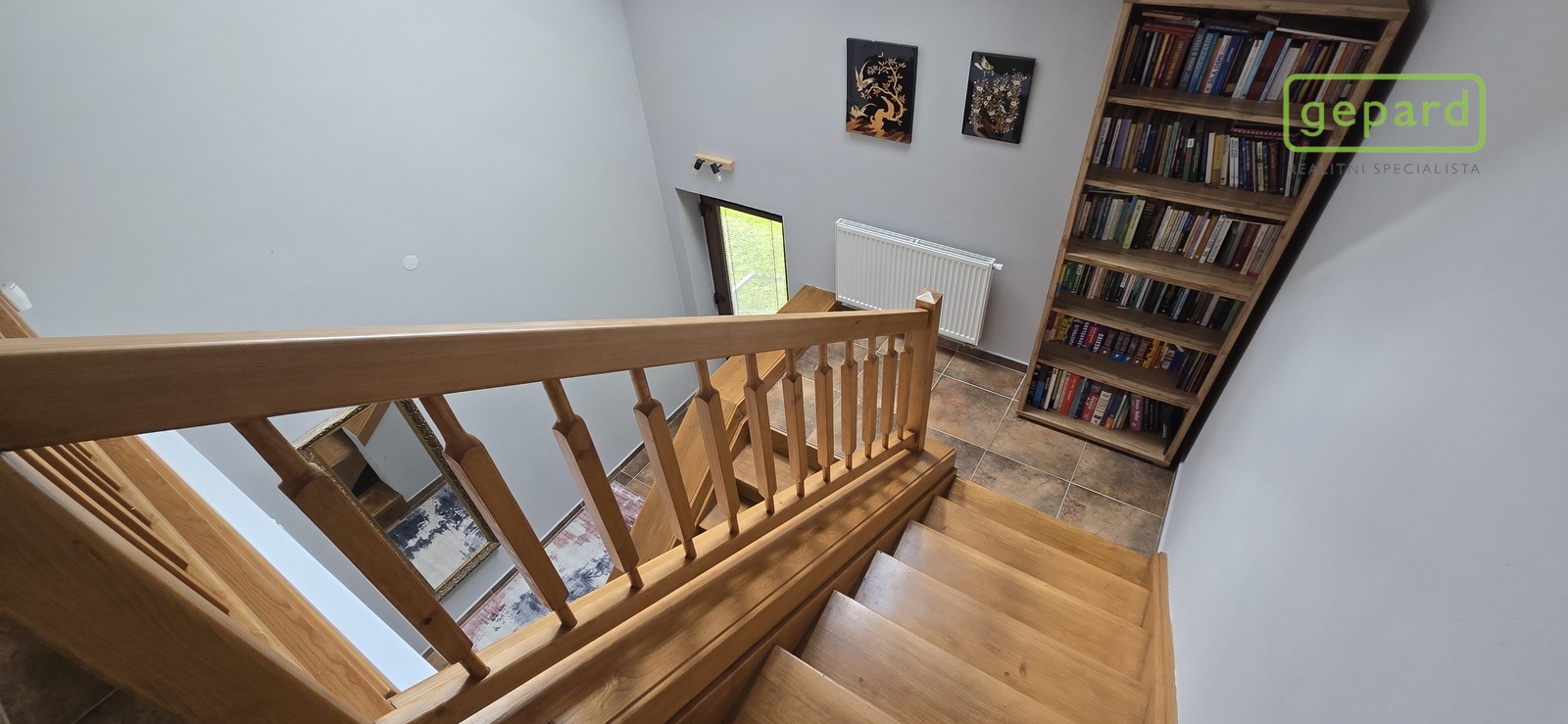 Podlahy a schodiště jsou dřevěné, na chodbách a koupelnách jsou dlažby. Vkusný interiér ve venkovském stylu, z oken jsou výhledy na okolní krajinu, velká zahrada osázená stromy zajišťuje vysokou míru soukromí.