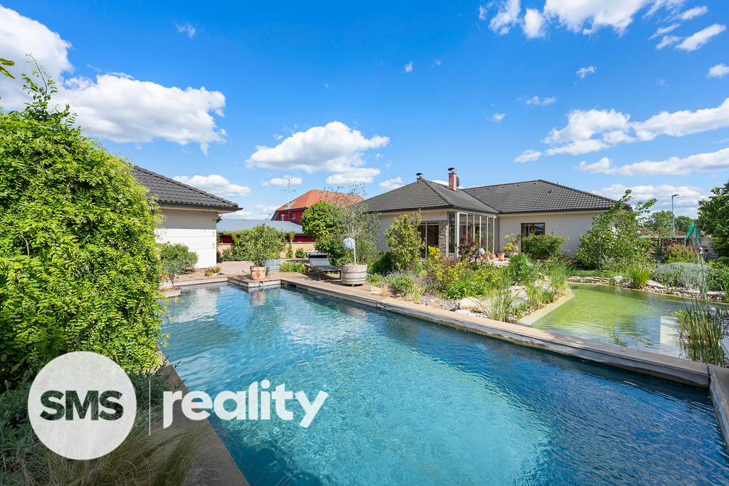 Zahrada byla pečlivě navržena zkušeným zahradním architektem a nabízí nejen naprosté soukromí, ale i vizuální harmonii v průběhu celého roku. Součástí je vyhřívaný bazén se slanou vodou, přírodní koupací jezírko a stylová sauna se zahradní sprchou pro dokonalý relax. Automatický závlahový systém je napojený na retenční nádrž a vlastní vrtanou studnu, což zajišťuje efektivní a ekologickou údržbu zahrady.