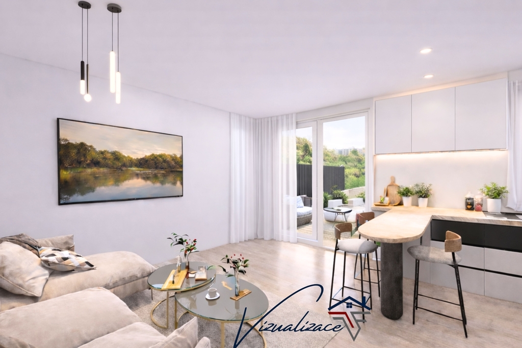 Dominantou bytu je prostorný obývací pokoj s kuchyňským koutem, ze kterého je přímý vstup na terasu a navazující zahradu. Právě tento prvek dělá z bytu výjimečné místo k bydlení – nabízí prostor pro relax, posezení s rodinou i bezpečné zázemí pro děti.