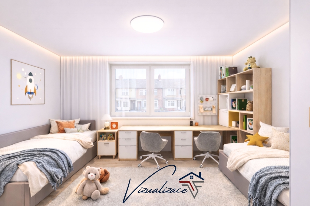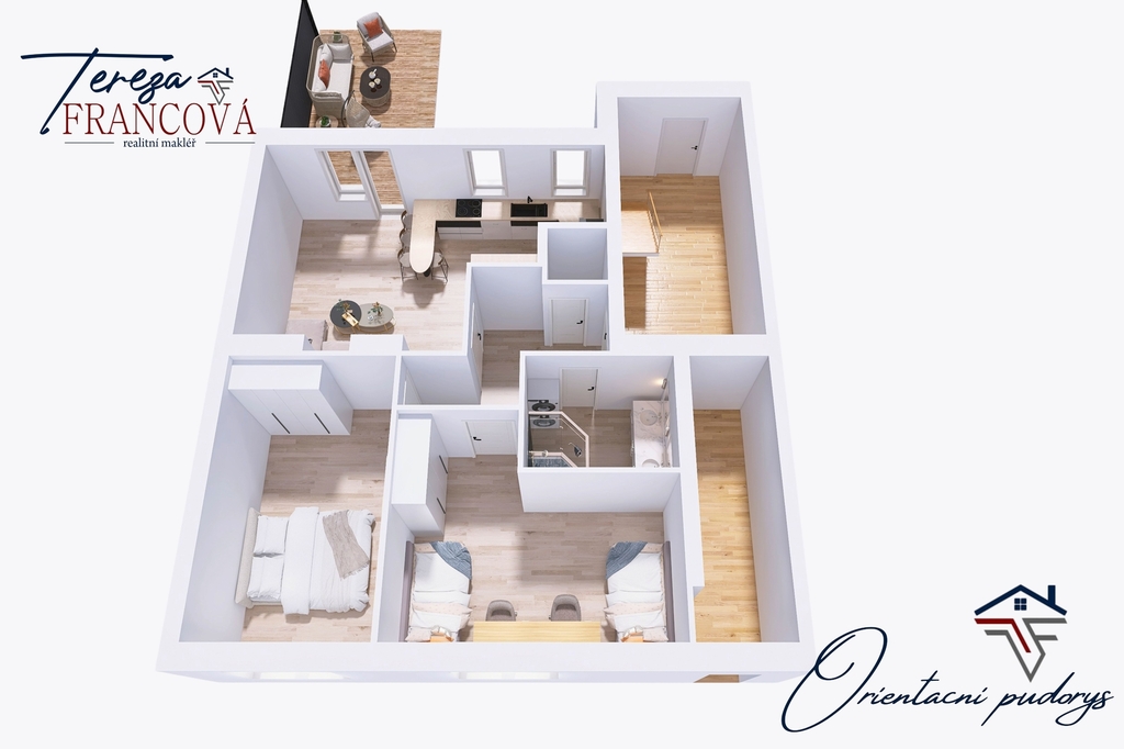 Byt dále disponuje dvěma samostatnými pokoji, koupelnou a dostatkem prostoru pro úložná řešení.
