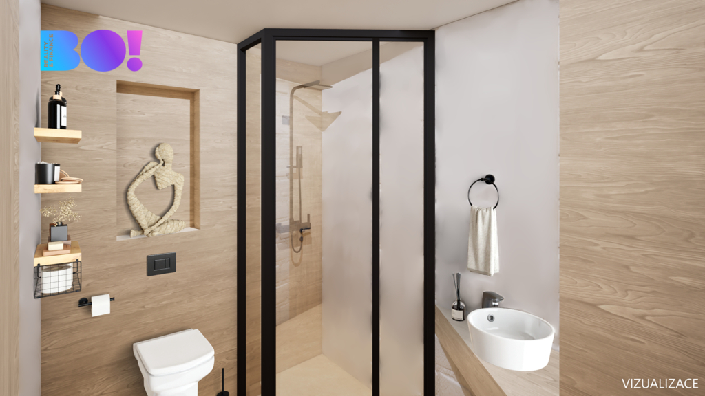 - V koupelnách navrženo designové obložení Barrisol, které dodává luxusní atmosféru.