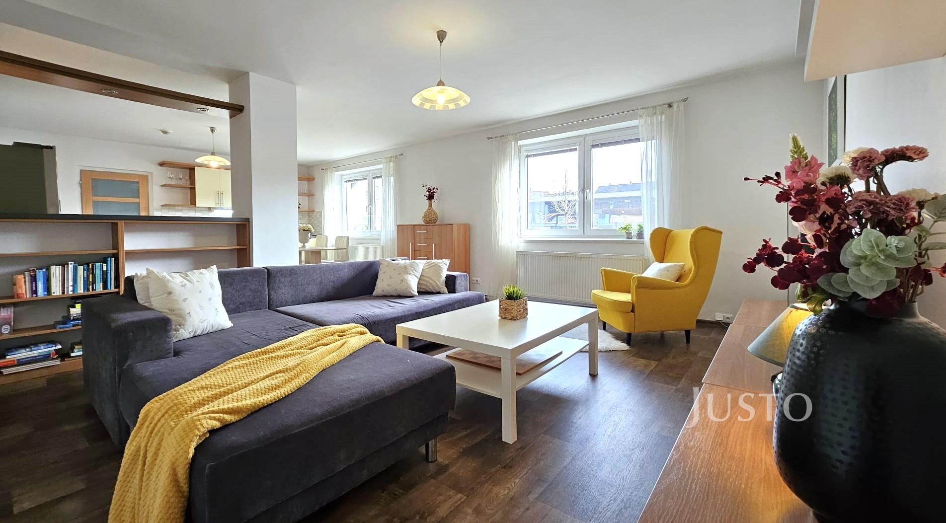 Užitná plocha domu činí 88,5 m² a nabízí prakticky řešený interiér. Dominantou domu je světlý obývací pokoj propojený s kuchyní, který je díky jižní orientaci krásně prosluněný po celý den a působí velmi vzdušně a příjemně. Kuchyň je od obývací části elegantně oddělena barovým pultem. Dvě ložnice jsou orientovány do klidného dvora na východ, což zajišťuje ničím nerušené soukromí.