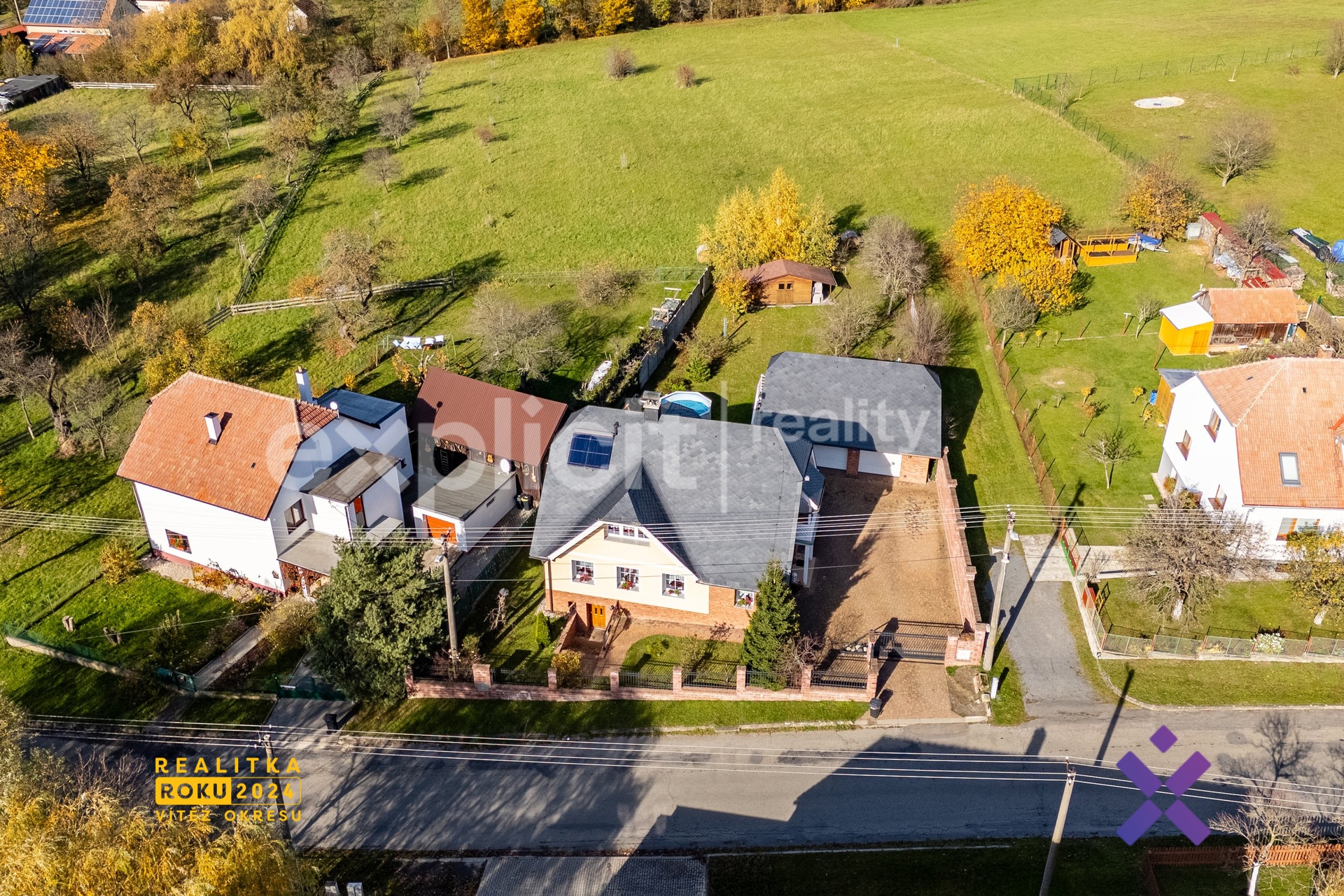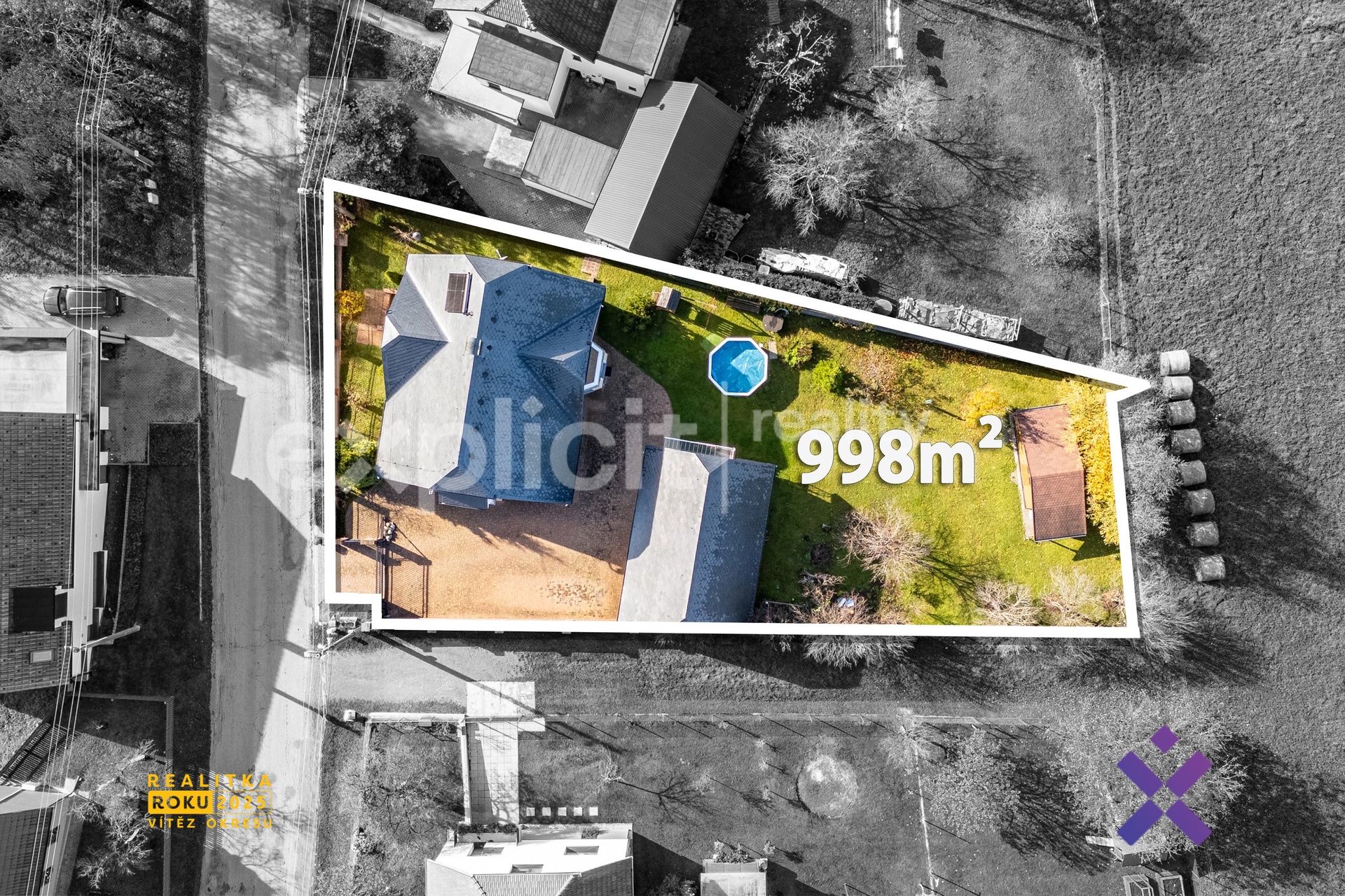Za domem se rozprostírá udržovaná zahrada s bazénem, zahradním domkem a dvojgaráží. V podkroví dvojgaráže je vybudována společenská místnost s kulečníkem a sprchou, ideální pro přátele, relax nebo zábavu.
