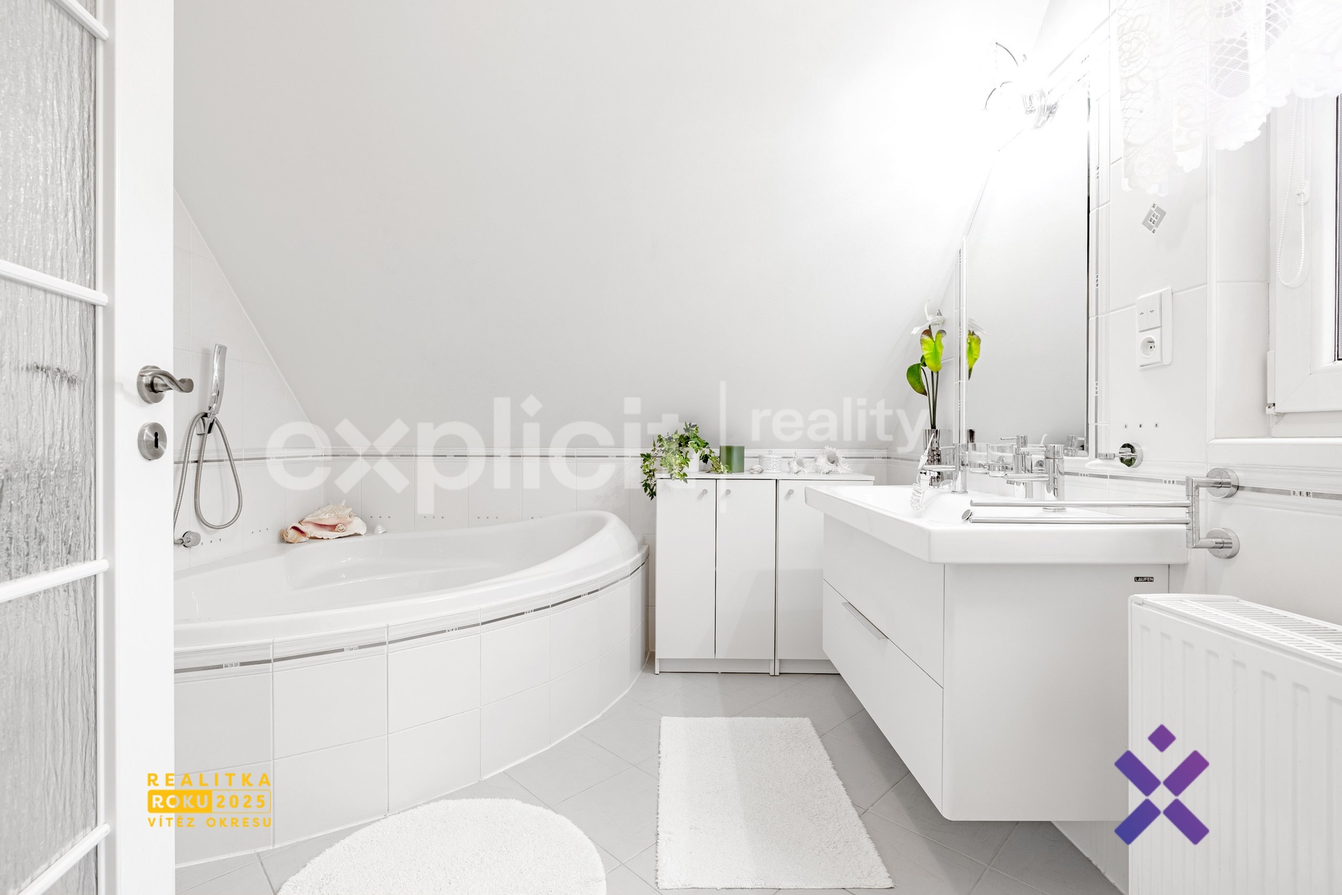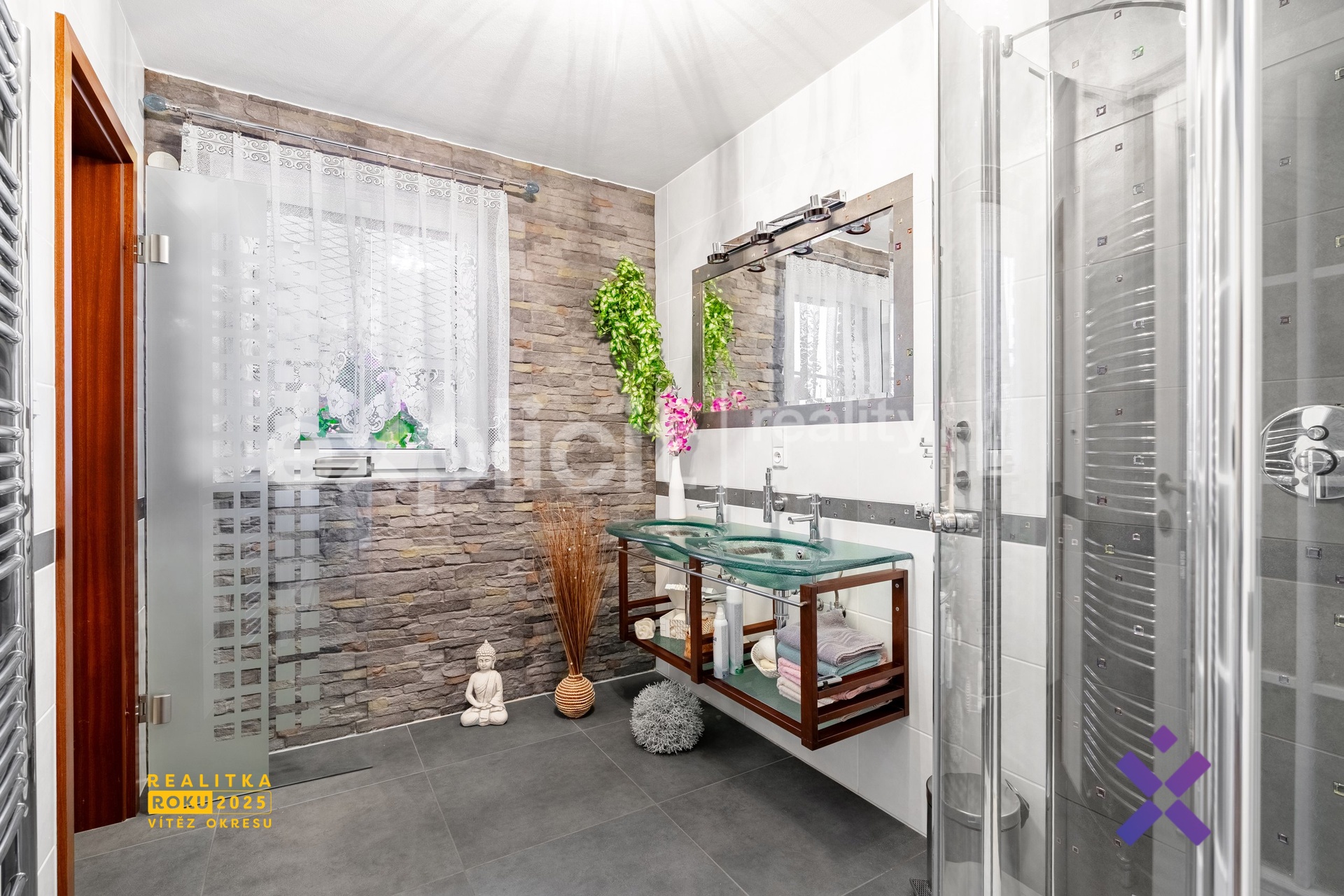 Po vstupu do domu vás přivítá prostorné zádveří, ze kterého je přístup do všech hlavních místností přízemí. Na pravé straně se nachází koupelna se sprchovým koutem, topným žebříkem a oddělenou toaletou. Zajímavostí koupelny jsou dvě skleněná umyvadla a lustr Swarovski. Na levé straně prádelna se sušárnou. Ve vedlejší místnosti je pracovna s koženou sedací soupravou a pracovním stolem, ideální pro práci z domova nebo přijímání hostů. Dále se v přízemí nachází šatna, spíž a technické zázemí, což zajišťuje praktický komfort každodenního života.