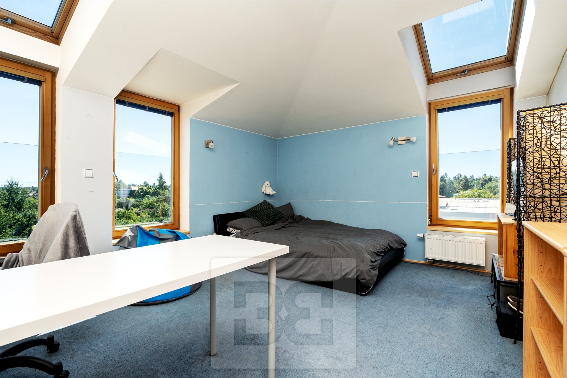 Prostorný, slunný byt o celkové ploše 135m2 se skládá z obývacího pokoje s kuchyňským koutem kompletně vybaveným značkovými spotřebiči, dále pak ze tří ložnic, koupelny s vanou, WC a sprchovacím koutem, samostatné toalety, vstupní haly a z technické místnosti. Byt je velice vzdušný a světlý díky střešním oknům ve všech místnostech. Obývací pokoj je situovaný směrem do ulice s krásným výhledem na náměstí/zámek. Součástí vybavení bytu jsou vestavěné skříně, klimatizace v každém pokoji, vstupní video-telefon.
