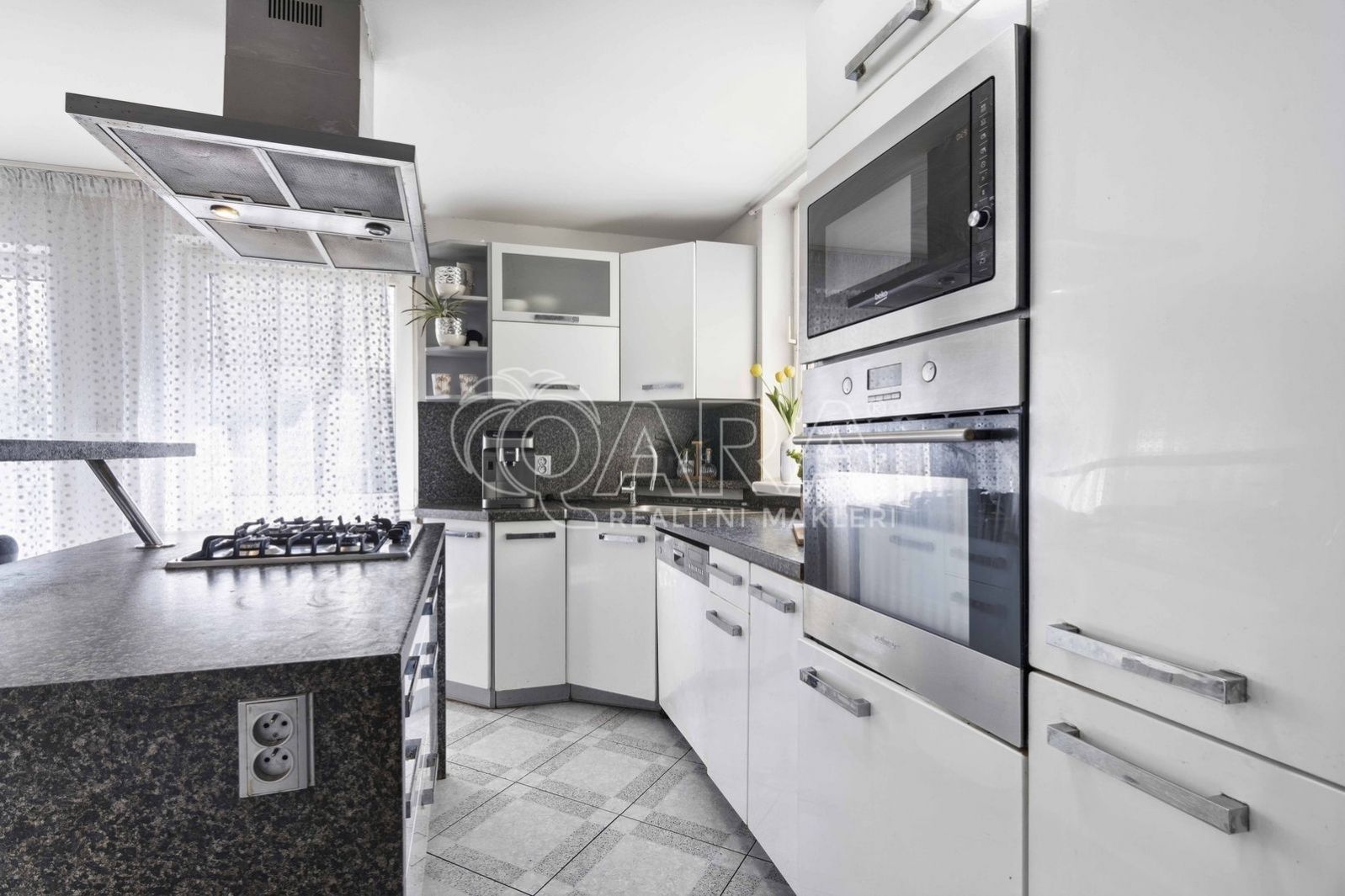 Druhou část domu o dispozici 3+kk tvoří obývací pokoj s kuchyňským koutem (cca 32 m2) a koupelnou s rohovou vanou a toaletou (cca 6 m2) a předsíň se schodištěm. Druhé nadzemní podlaží sestává ze dvou pokojů (cca 15,5 m2 a cca 17,5 m2)a koupelny se sprchovým koutem a toaletou (cca 6,2 m2). Ze dvou pokojů je vstup na společný balkon. V obývacím pokoji s kuchyňským koutem zavedeno podlahové vytápění, v ostatních prostorech instalovány radiátory.