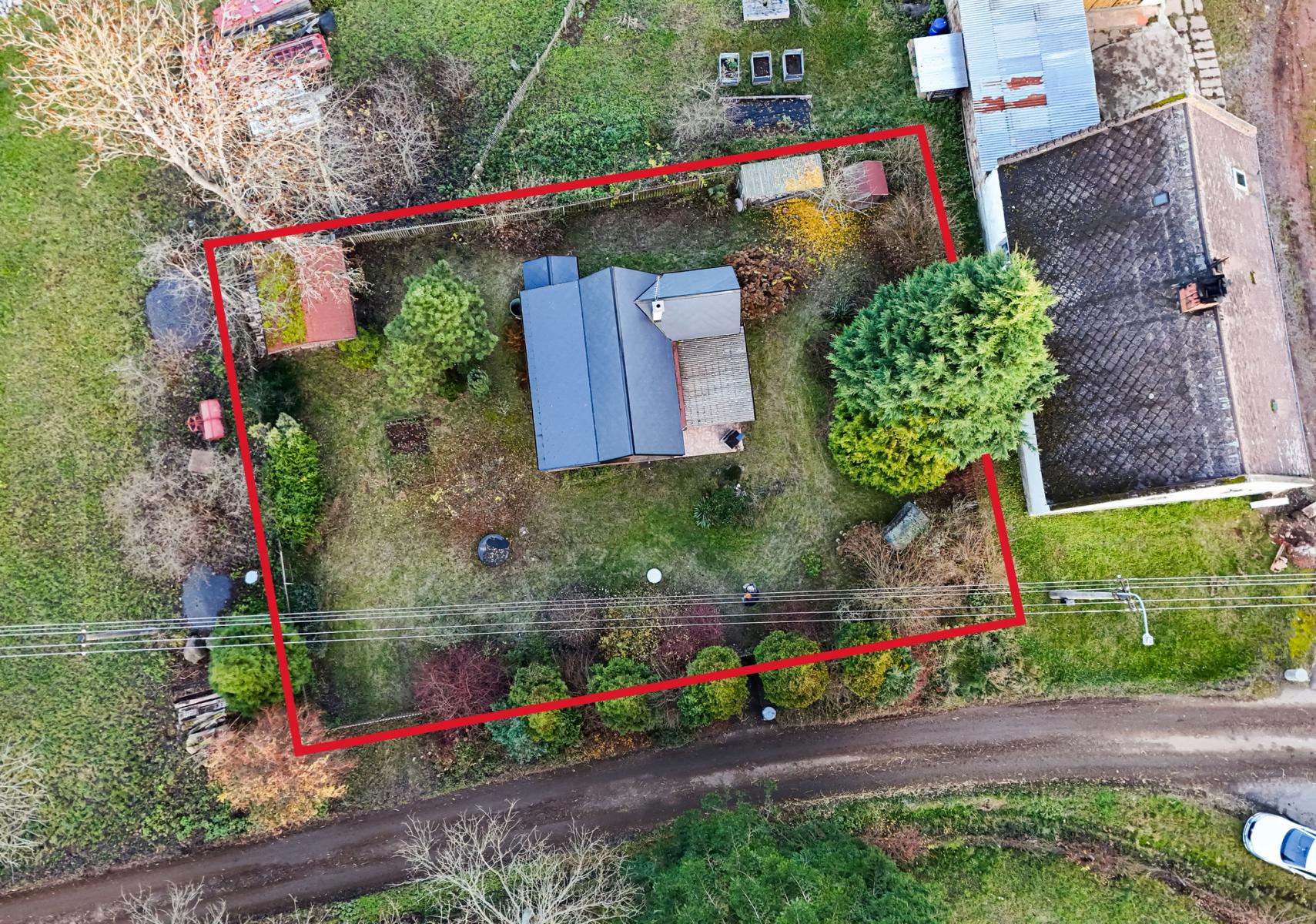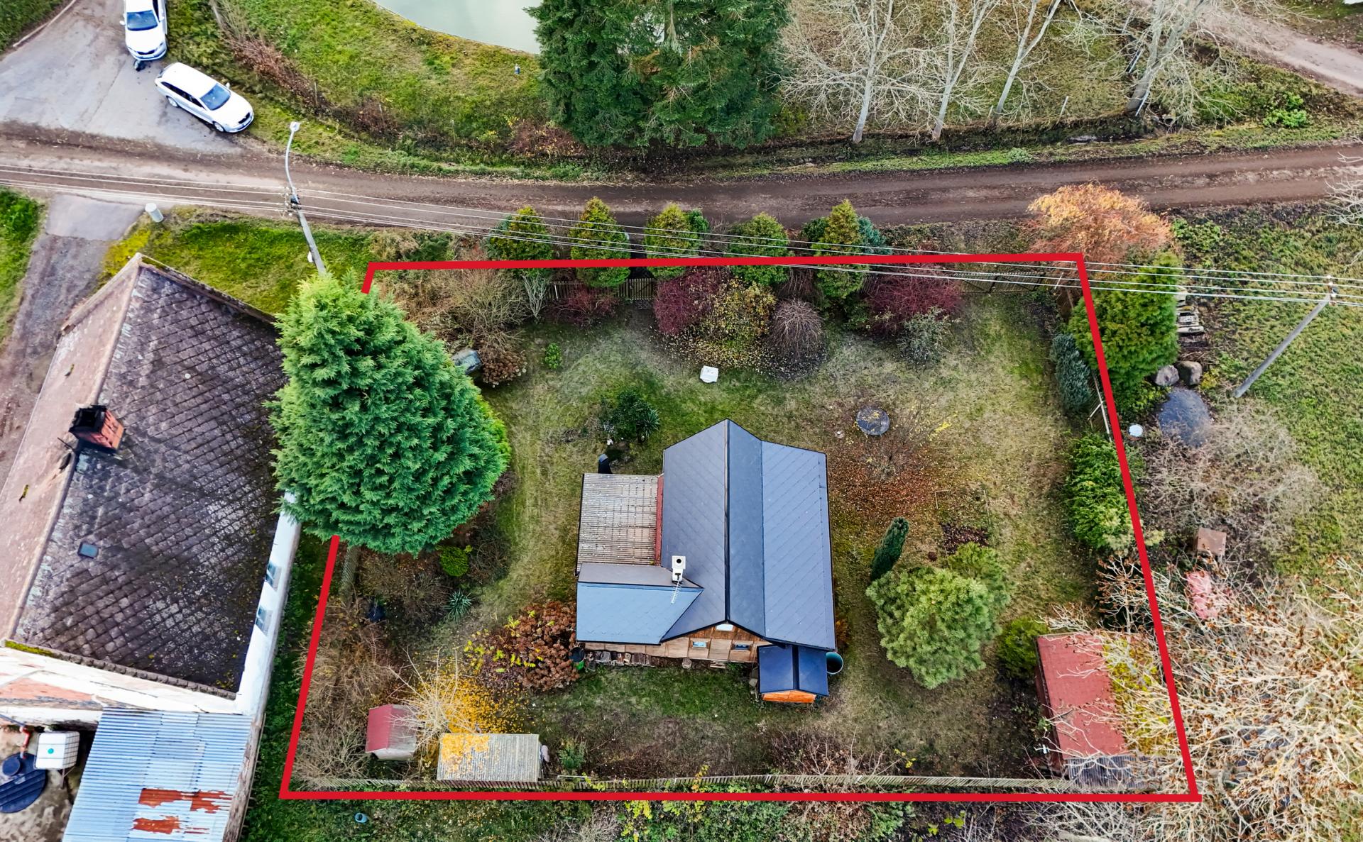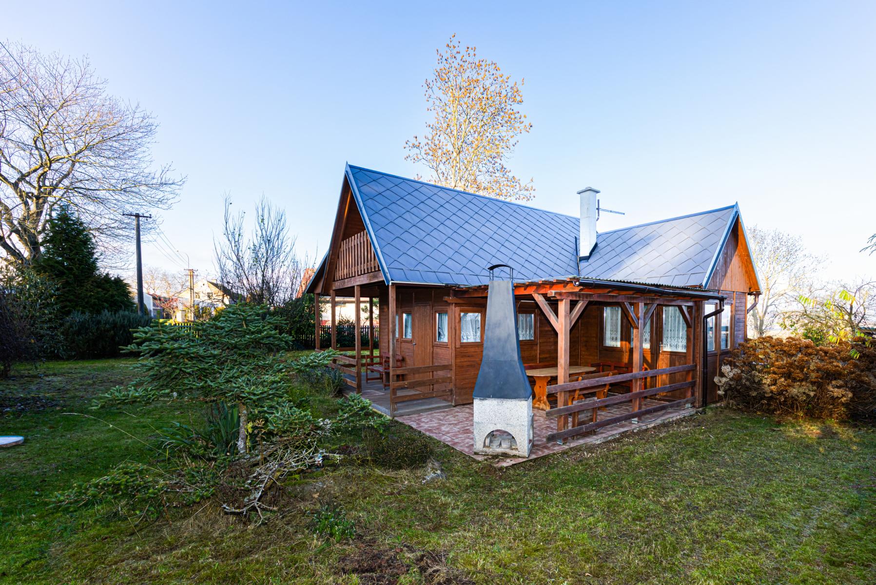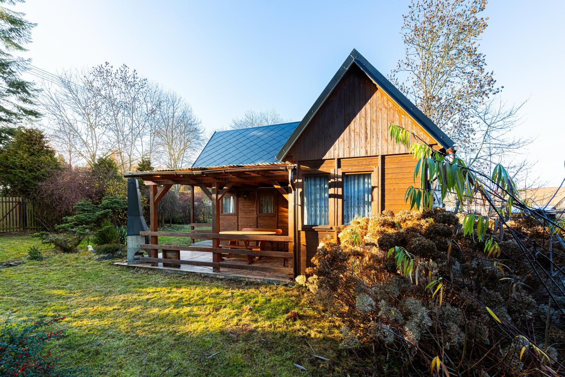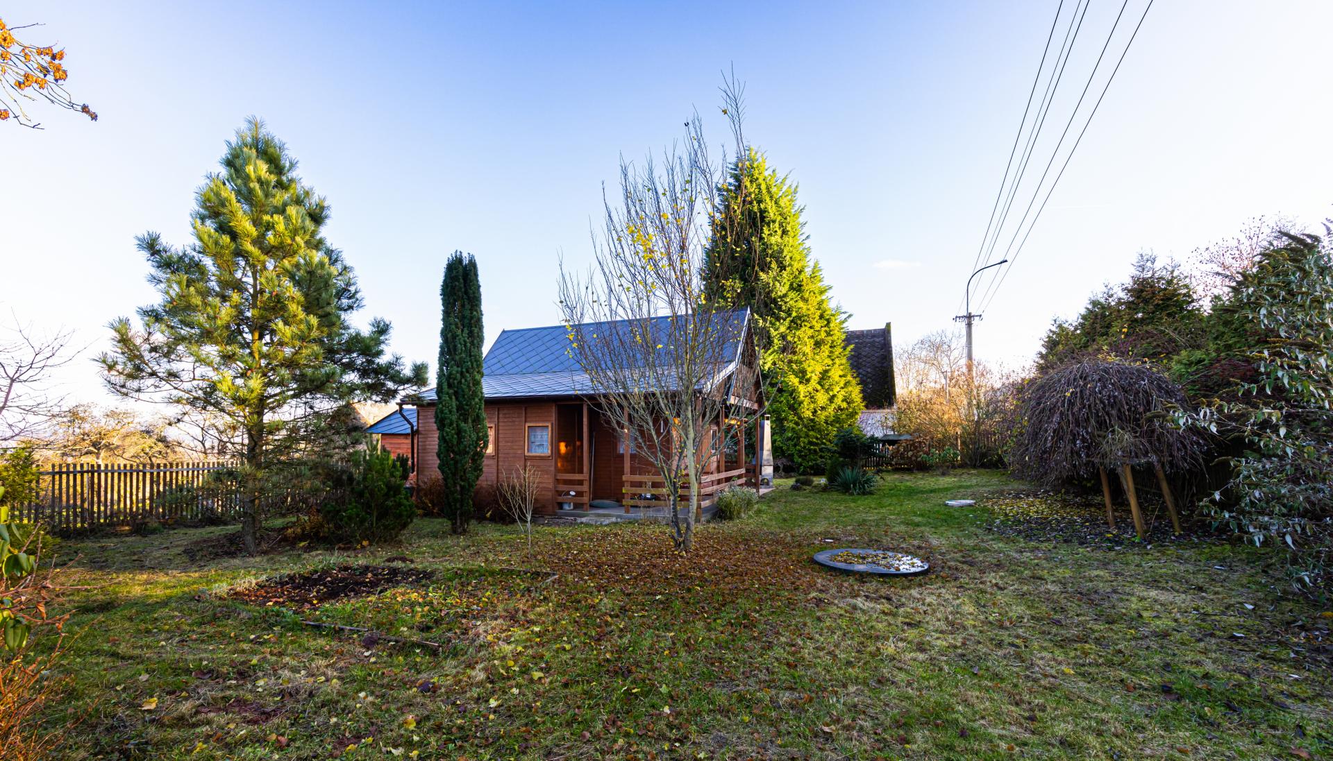 Na pozemku stojí také dřevěná chatka pro přespání, která je skvělá jako hostinský domek, dětský domek nebo prostor pro návštěvy.