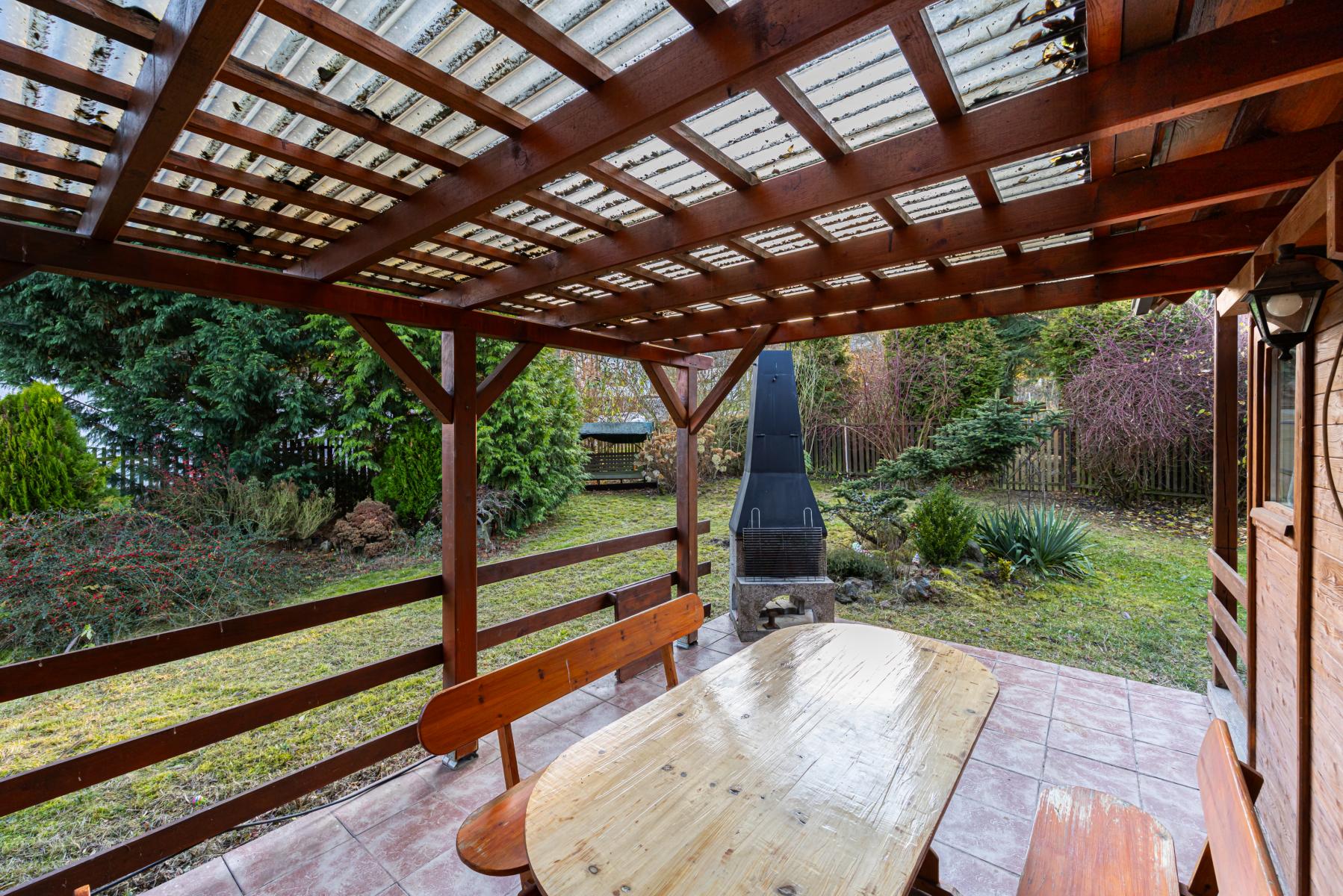 Zahrada je krásná, vzrostlá a udržovaná najdete zde túje, motýlí keře, hortenzie, další okrasné keře i jehličnany, nechybí zastřešené venkovní posezení, venkovní krb a zahradní domek na nářadí. Místo vybízí ke klidu a relaxaci.