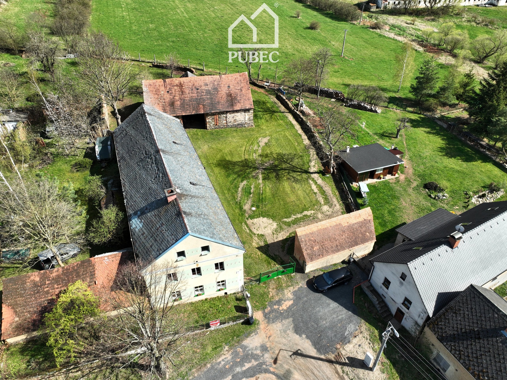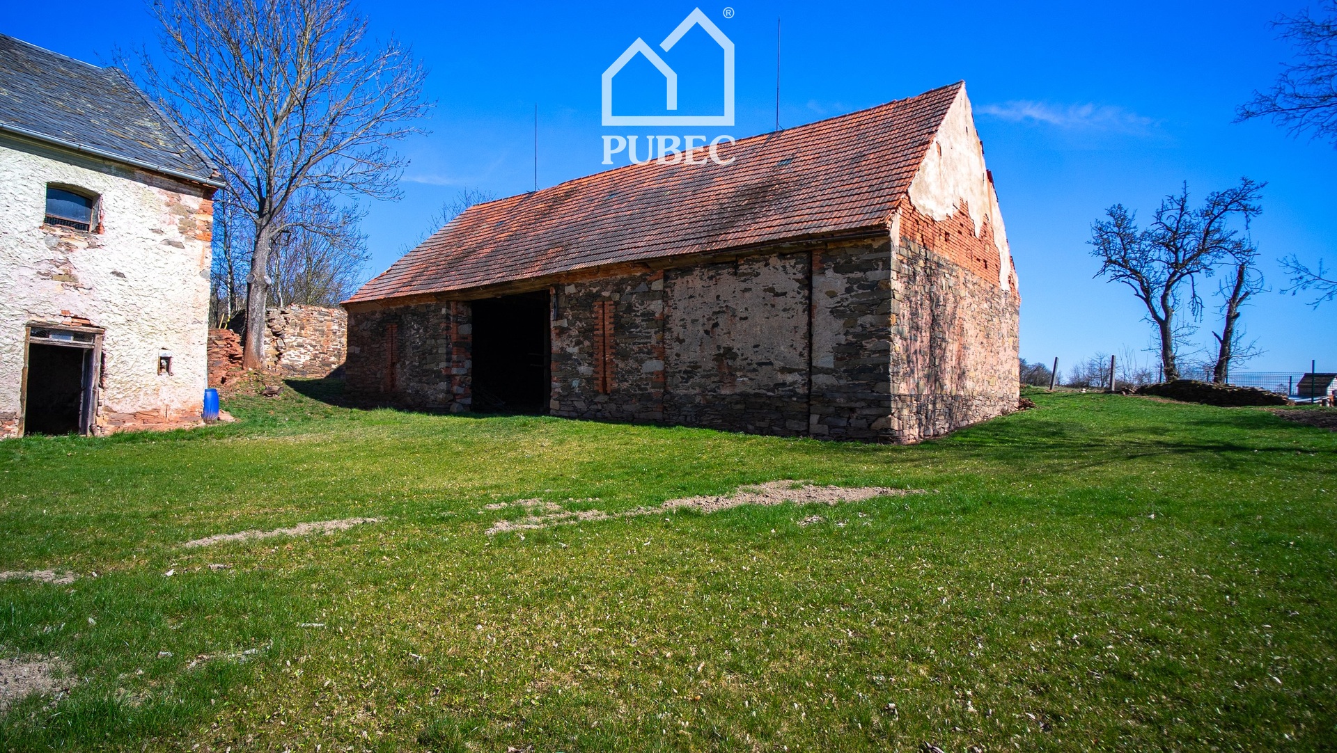 Velkorysý kompletně zasíťovaný pozemek s celkovou plochou 2.267 m² je členěn na rozlehlý dvůr, zahradu a sad. V přední části zahrady je původní obytná budova se stodolou určená k celkové přestavbě nebo demolici. Mezi dvorem, zahradou a sadem je samostatně stojící stodola.