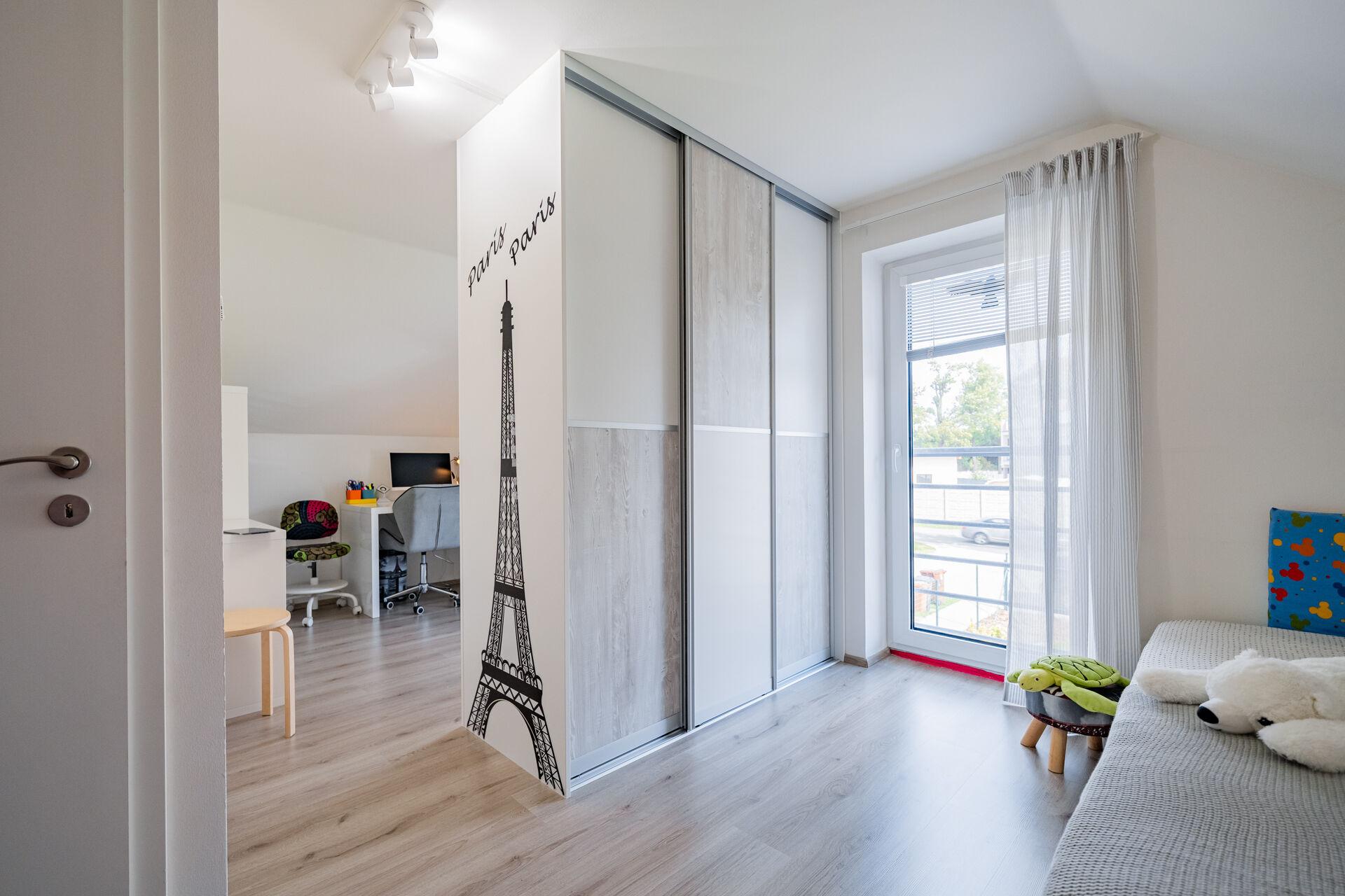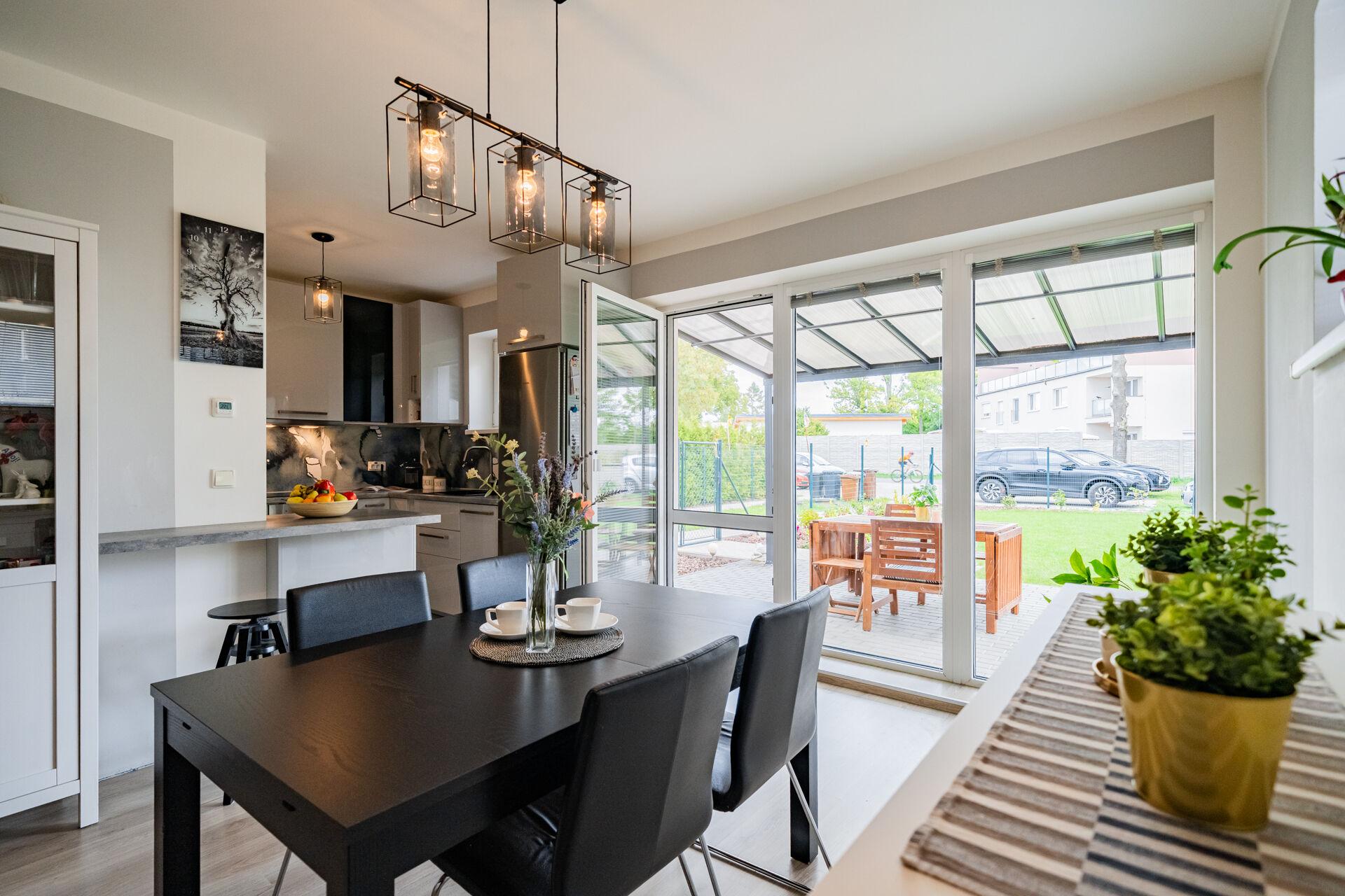 Obývací pokoj v přízemí domu s přímým vstupem na terasu a dále do zahrady, je moderně propojený s kuchyní. Ta je vybavena kuchyňskou linkou na míru se spotřebiči a je zde praktická úložná komora. V přízemí bytu je také vstupní chodba a toaleta. V patře domu jsou dva pokoje, krásná ložnice a druhý pokoj, který je v současné době rozdělen na dva, dětský pokoj a pracovnu. Koupelna je s vanou a toaletou, nechybí připojení na pračku. Topení je řešené elektrickým kotlem. Okna jsou plastová se žaluziemi. Velkou výhodou bytu je klidné bydlení, již zmiňovaná krásná, rovinatá zahrada a skvělá dostupnost Prahy či blízkých Hostivic. Parkování je pohodlné před domem.