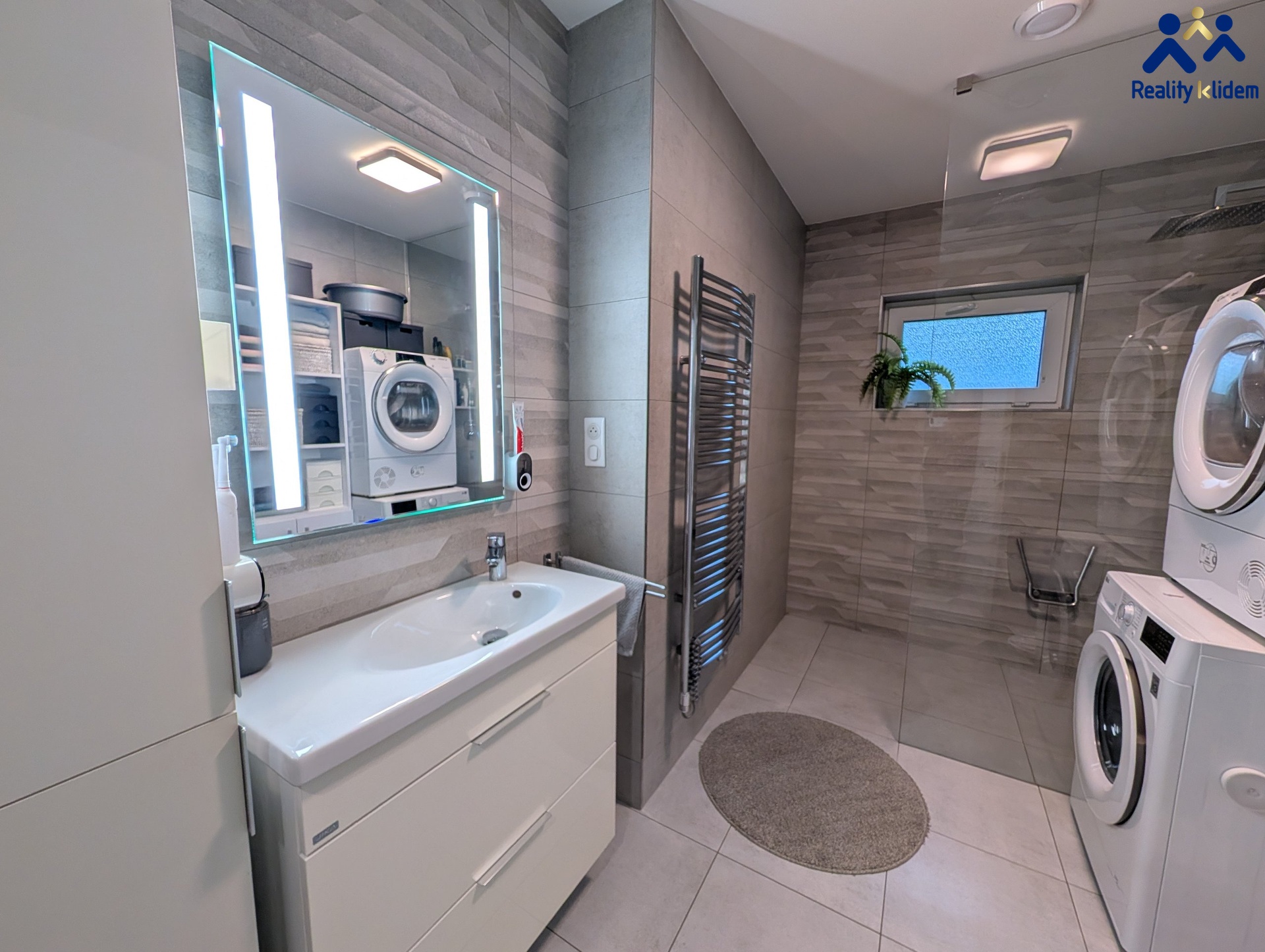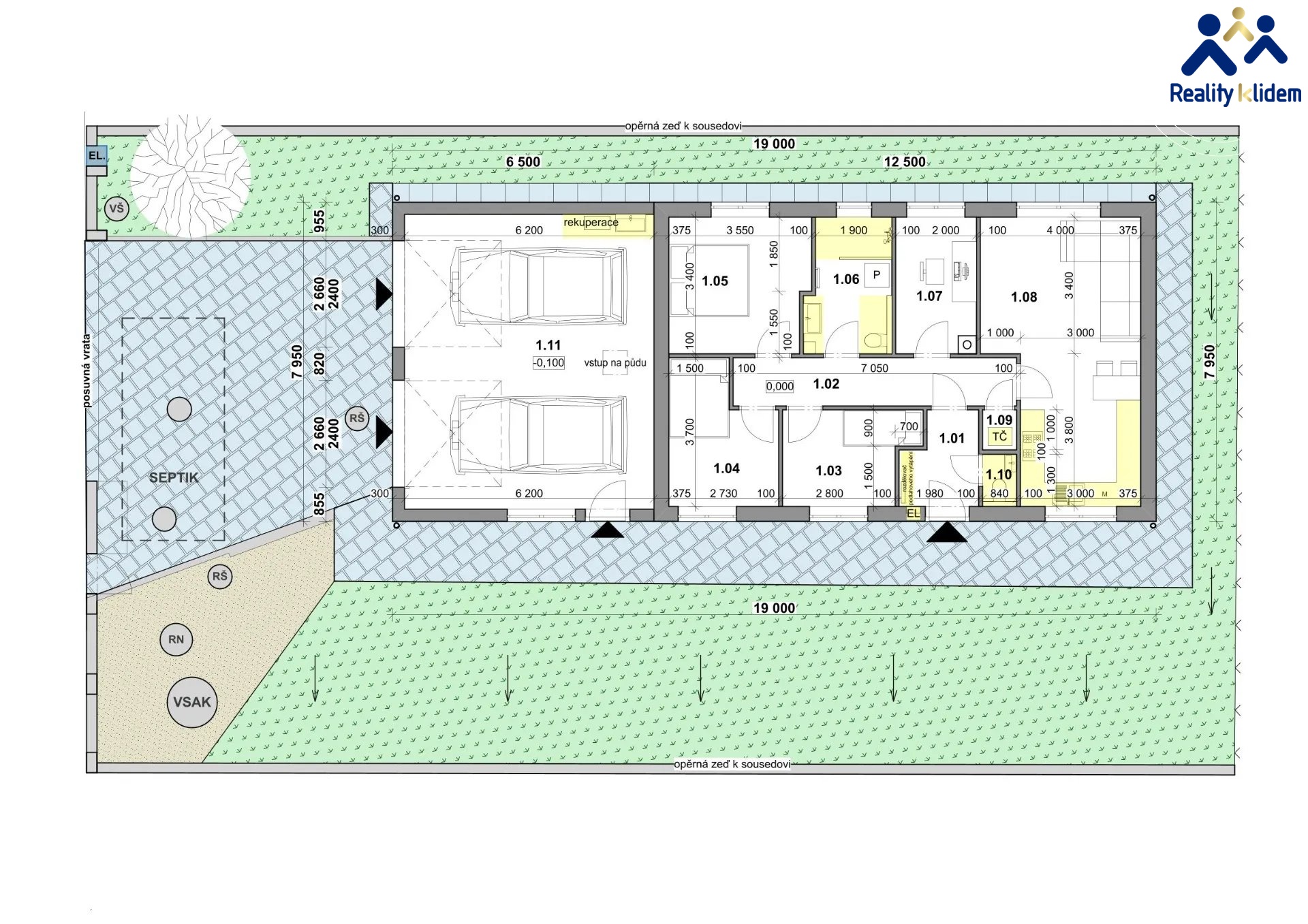 Technické zázemí tvoří zádveří s chodbou, záchod, koupelna, technická místnost a prostorná garáž 52m2