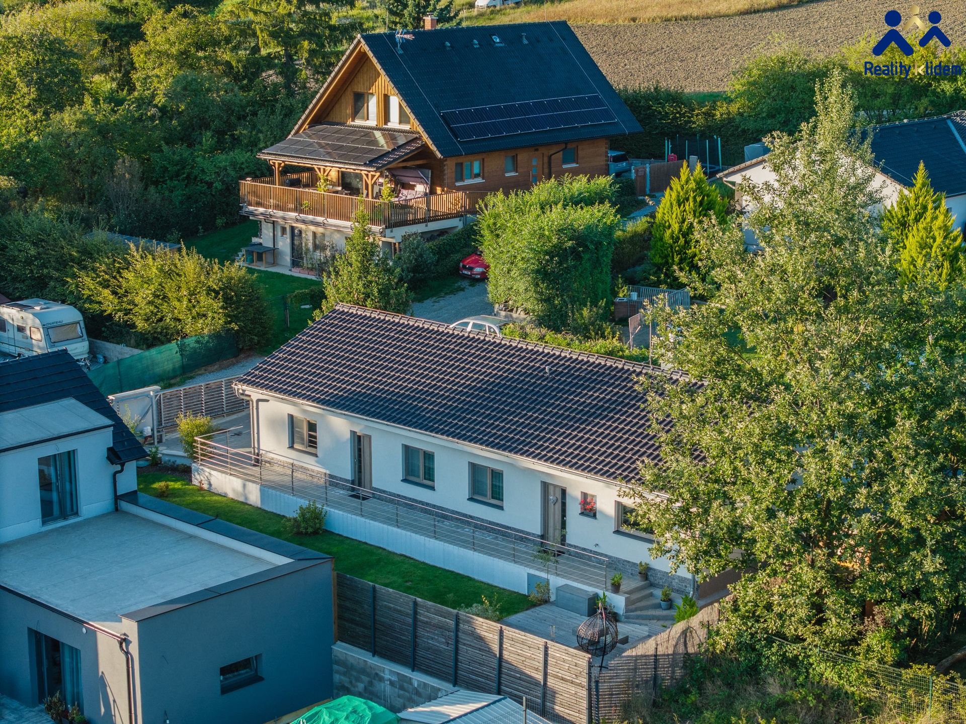 Dům o dispozici 4 pokojů a společné kuchyně s obývacím pokojem. Před domem vkusně vybudovaná terasa k odpočinku.