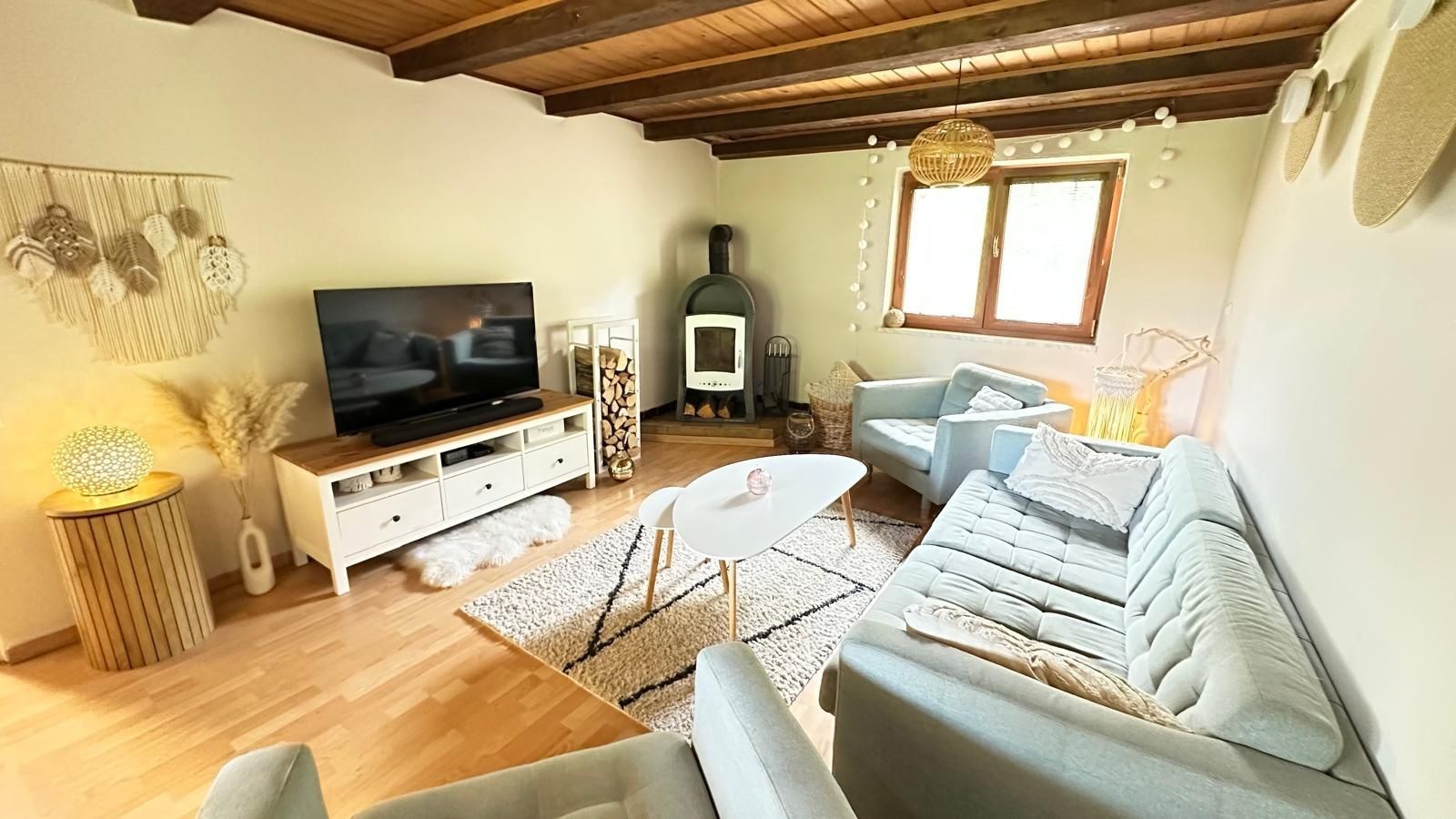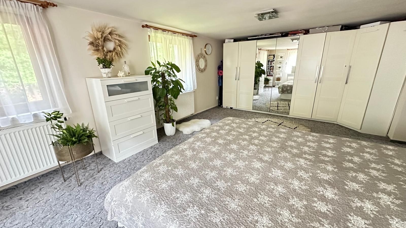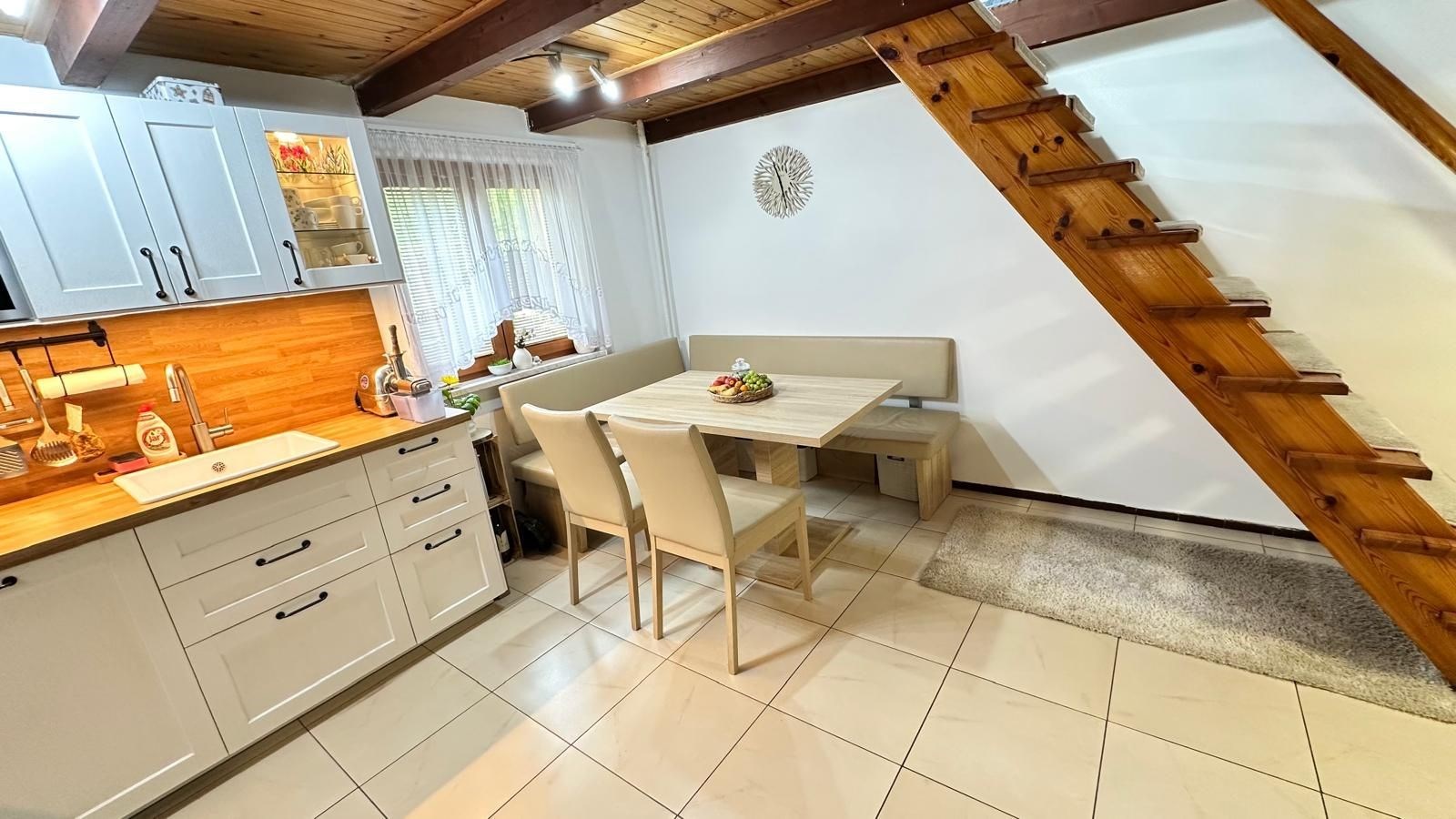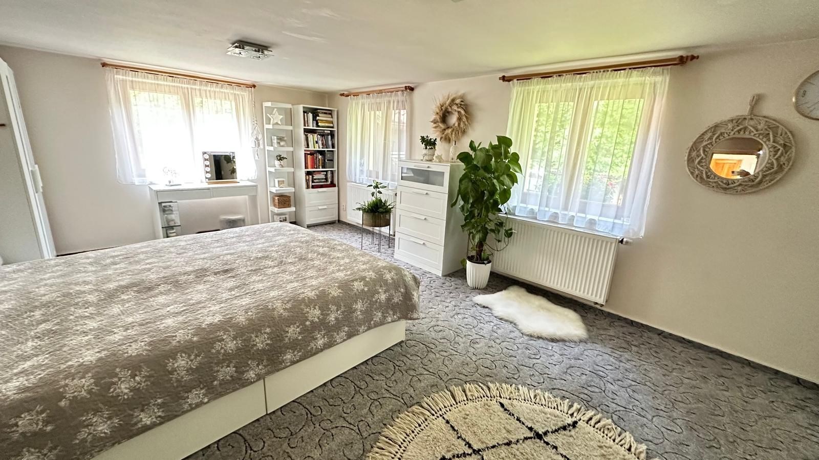 Dům má dispozici 4+1 a poskytuje dostatek místa i pro větší rodinu. V přízemí se nachází obývací pokoj s krbovými kamny s výměníkem, které spolu s elektrokotlem zajišťují ústřední vytápění celého domu, samostatná prostorná kuchyně, koupelna, toaleta a velký pokoj. V patře jsou dva pokoje a nadchne Vás prostorná terasa s dechberoucím výhledem do okolního lesa – ideální místo pro ranní kávu, večerní víno nebo relaxaci u knihy.