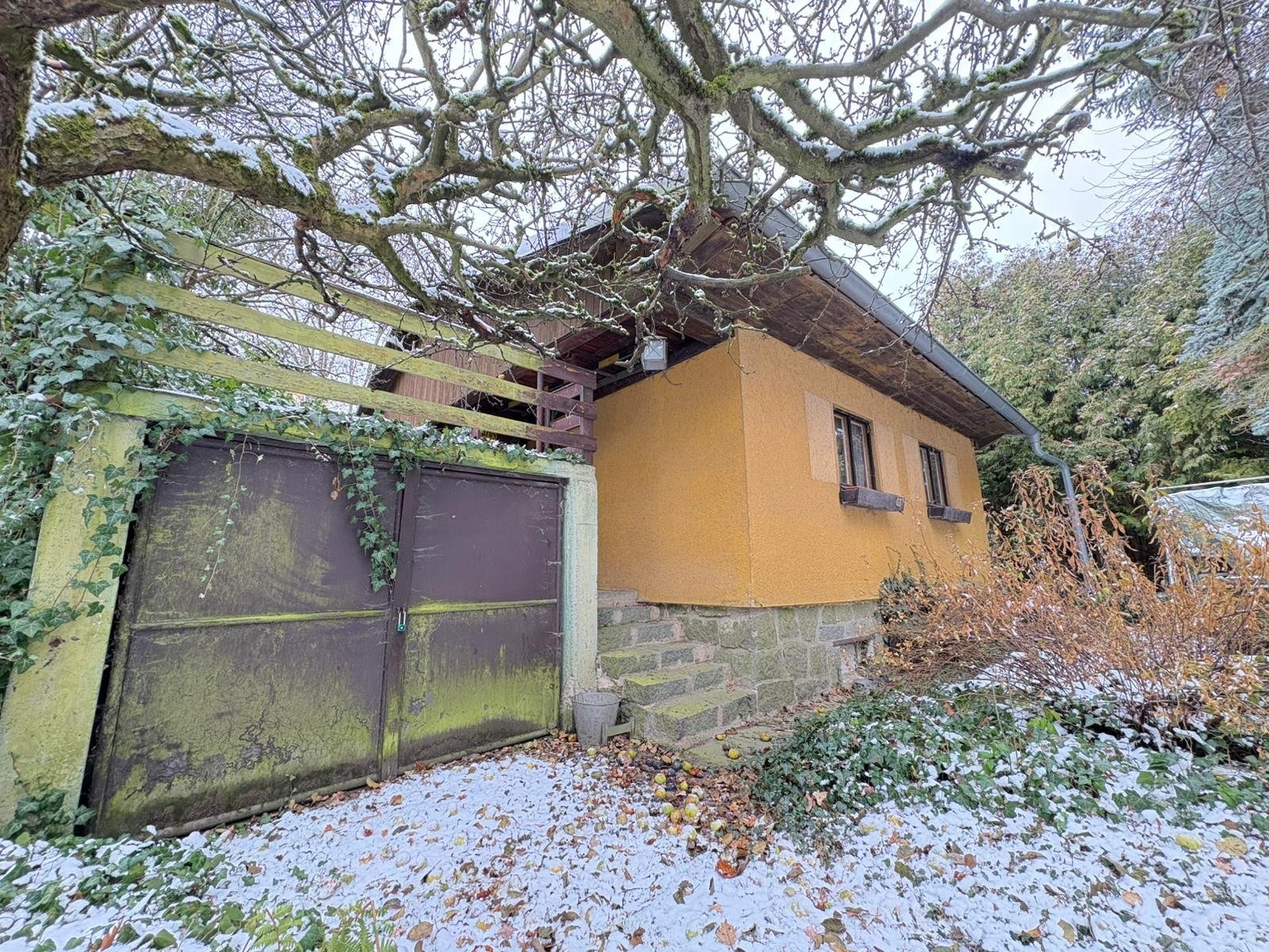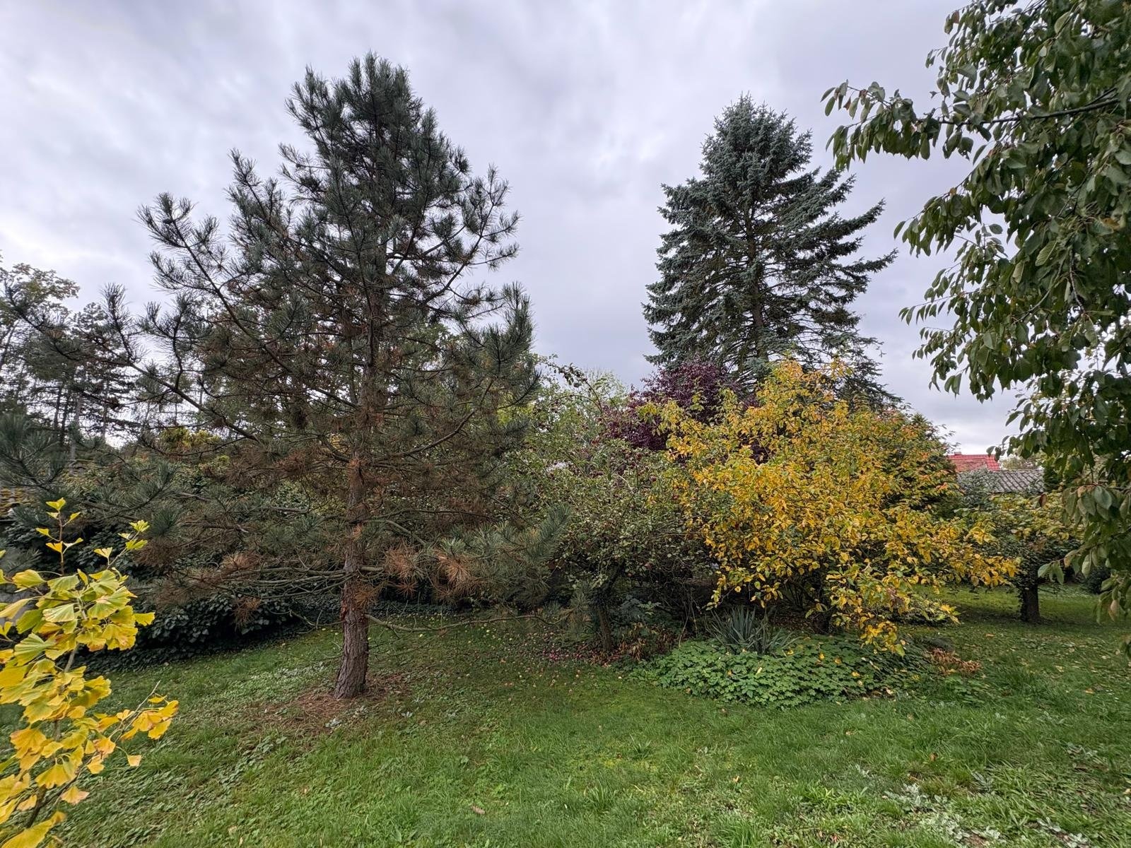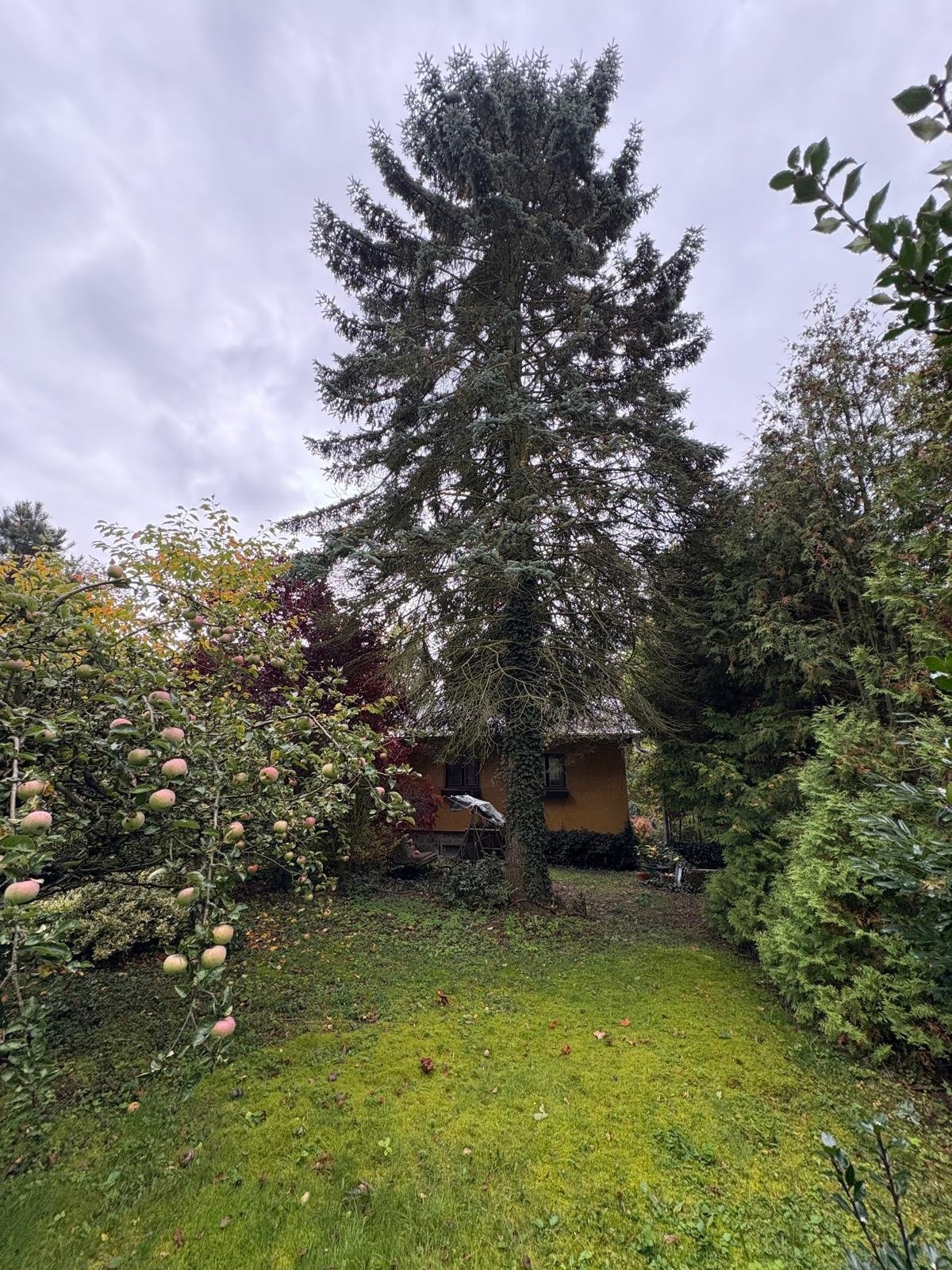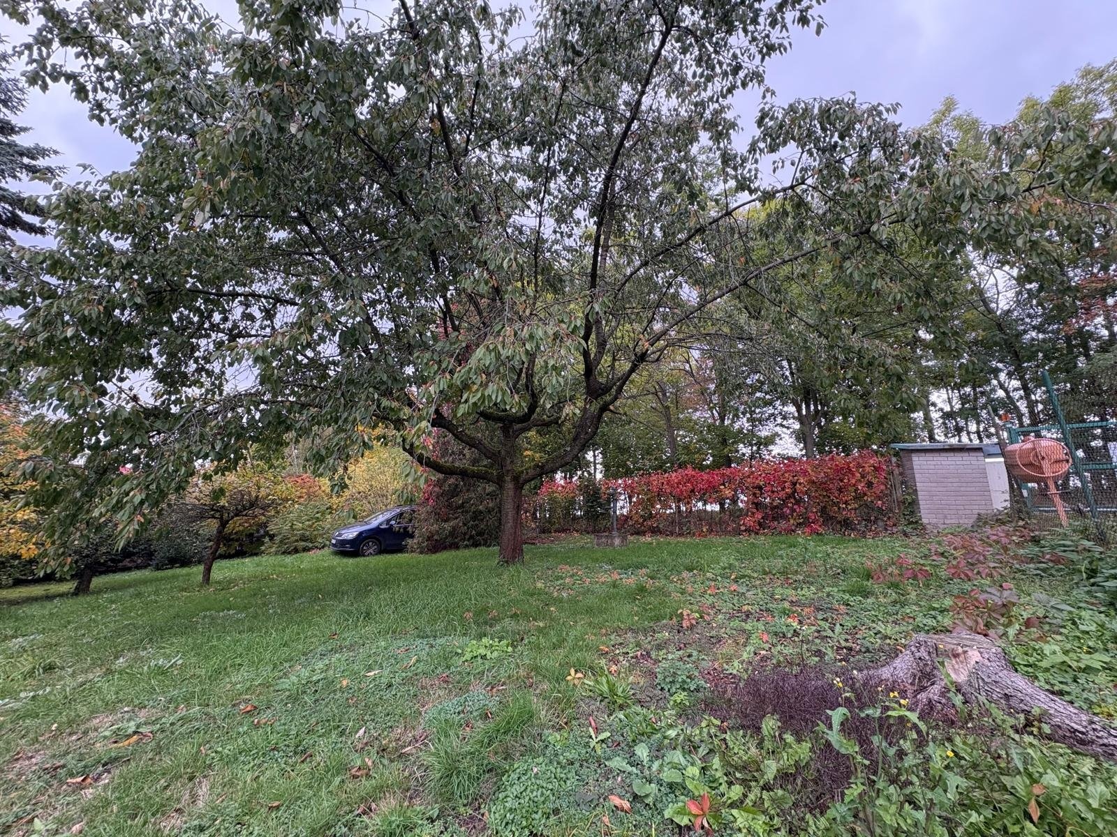 Pozemek doplňují vzrostlé ovocné stromy, túje a keře, které dotvářejí zelený charakter místa.