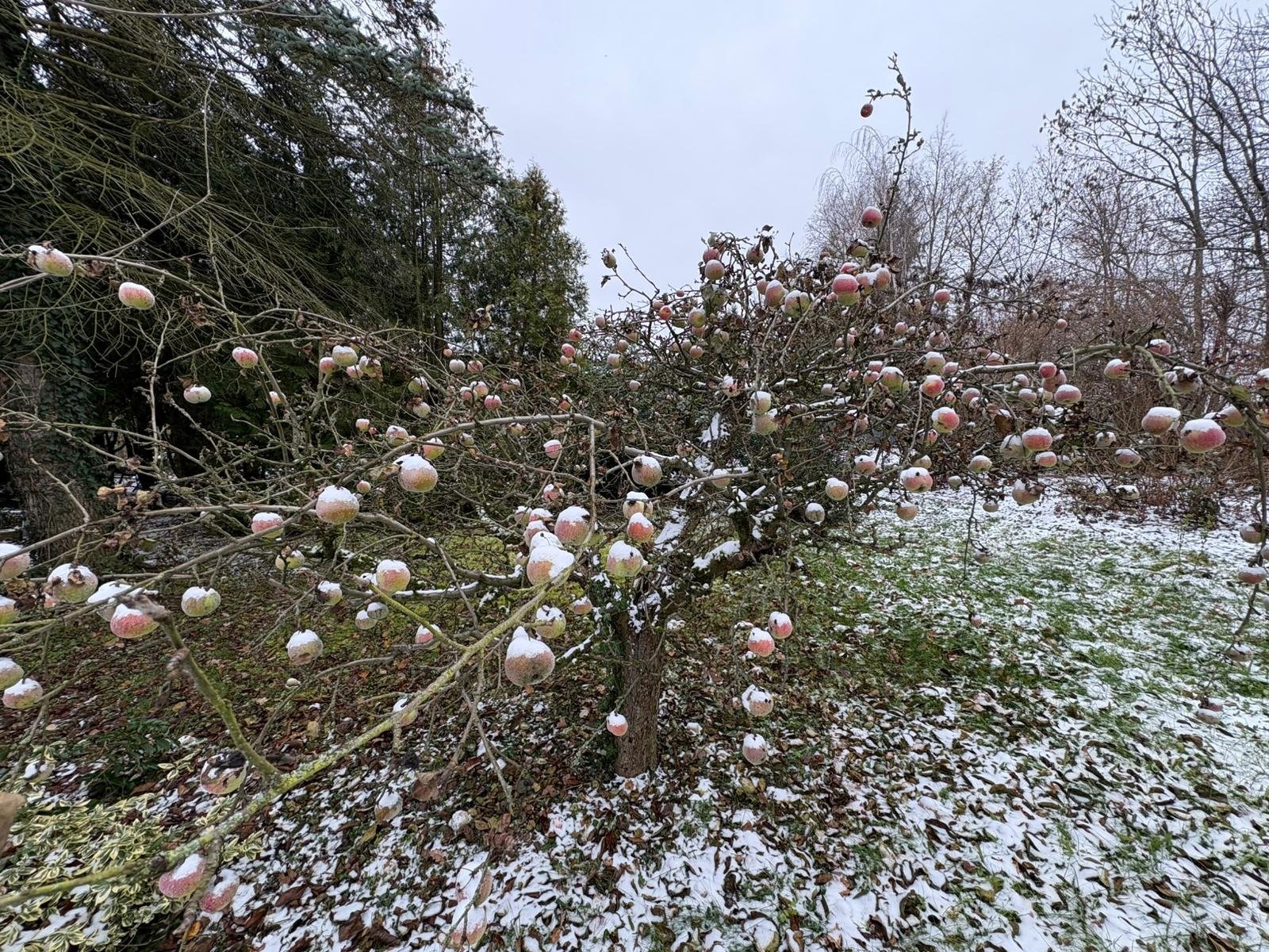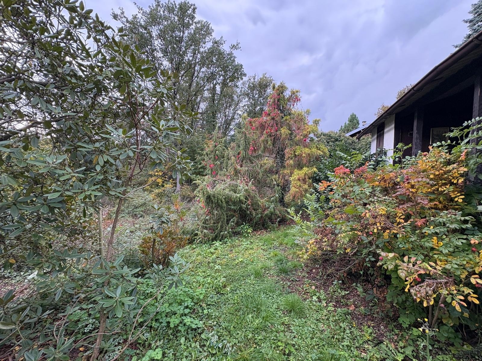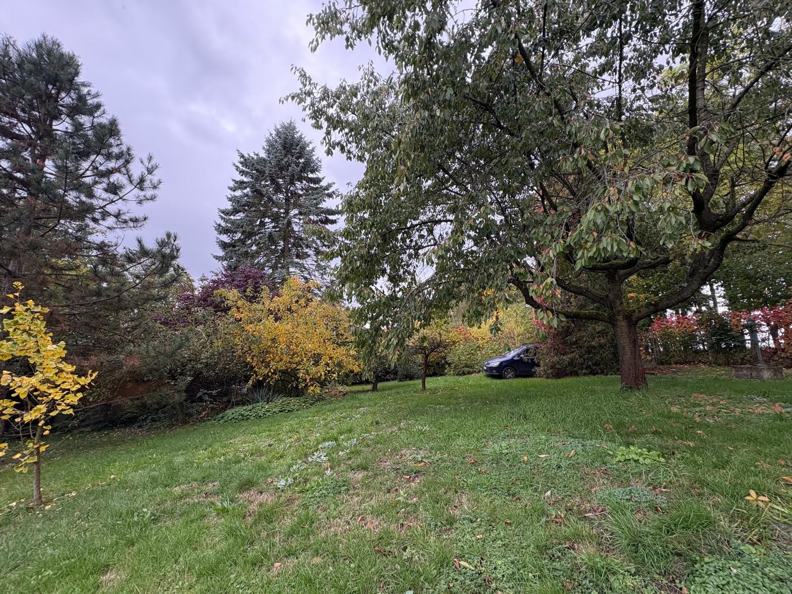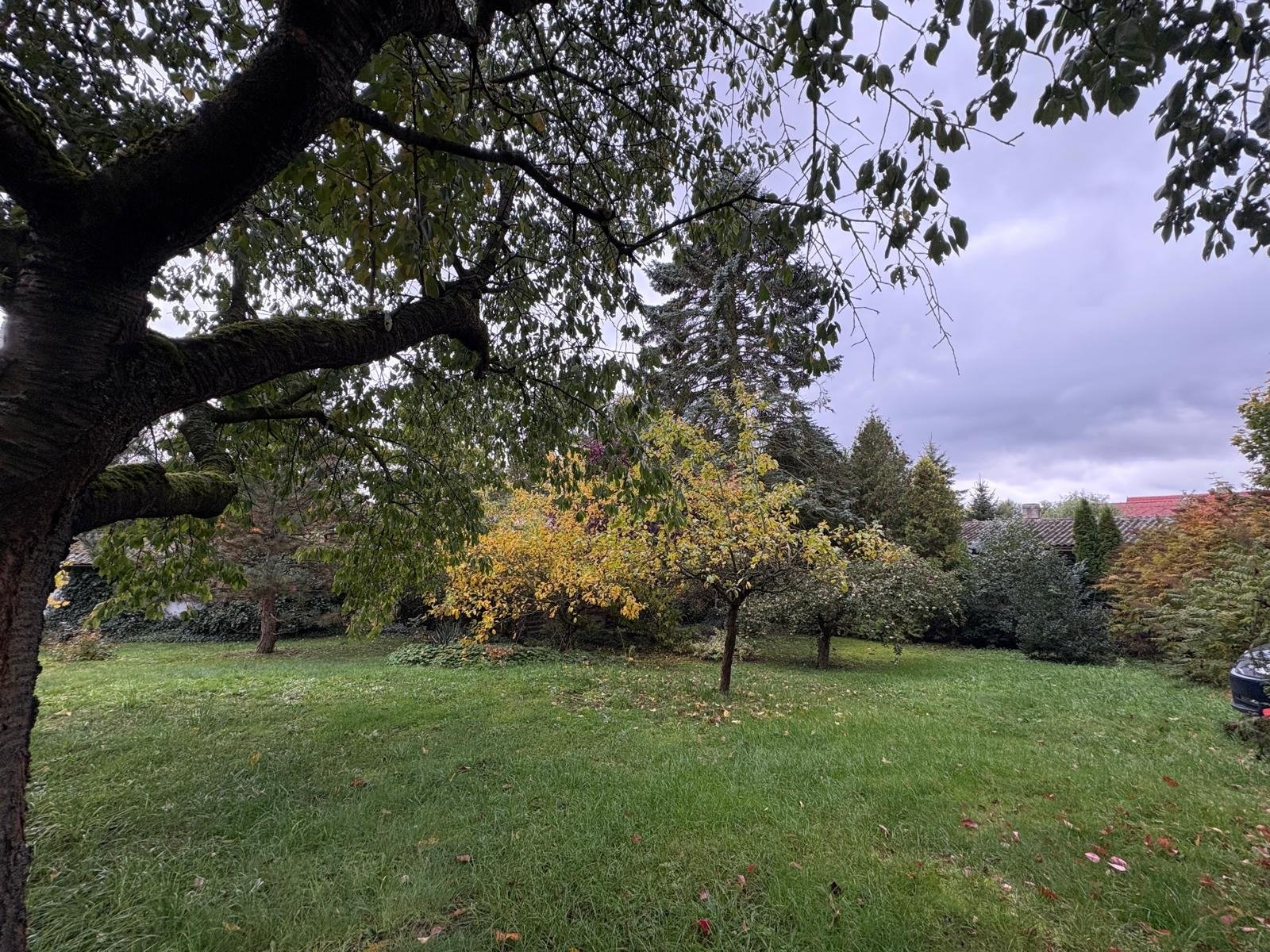 Pozemek doplňují vzrostlé ovocné stromy, túje a keře, které dotvářejí zelený charakter místa.