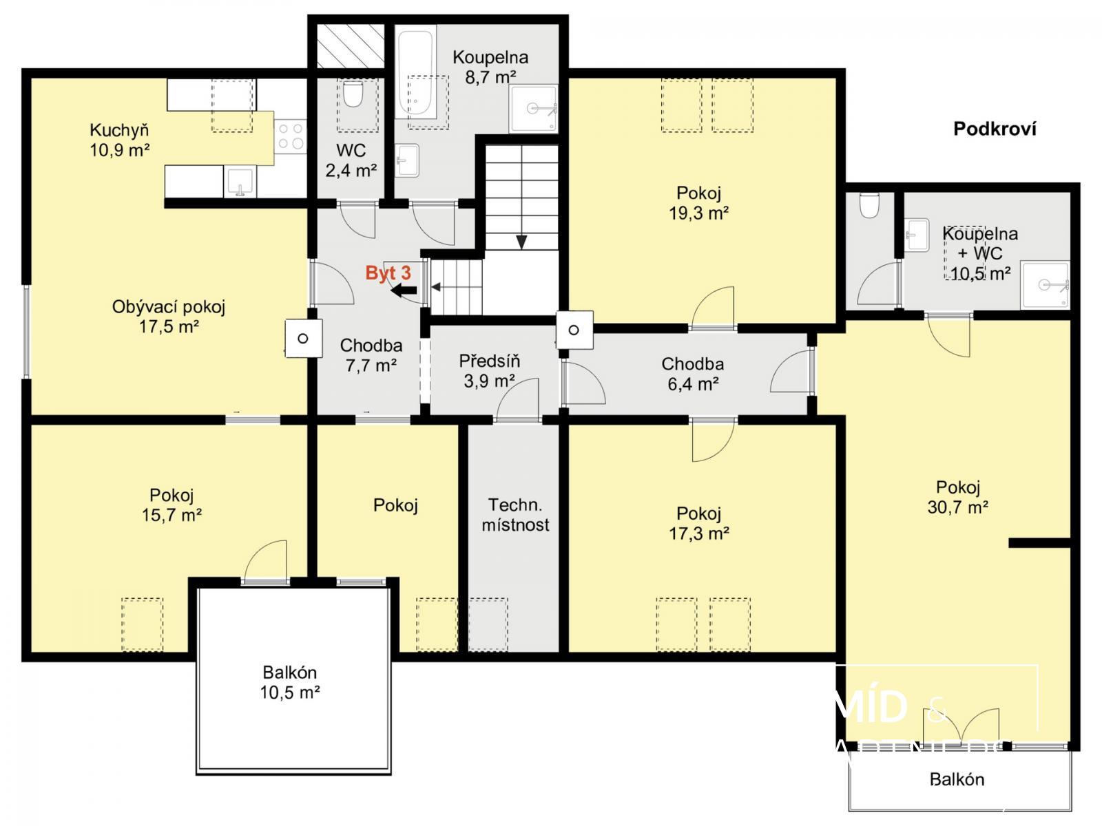 Tento byt má dispozici 6+kk s balkonem, terasou, dvěma koupelnami a technickou místností. Celá realizace podkrovního bytu proběhla ve dvou etapách, kdy první část bytu vznikla přestavbou části půdy v roce 1997 a následně v roce 2015 byla rozšířena o zbývající část podkroví. Plocha tohoto mimořádně prostorného bytu zabírá cca 166 m2 obytné plochy a k dispozici je také 10 m2 velká terasa přístupná z jedné z ložnic a balkon, kdy obojí směřuje výhledem do zahrady.