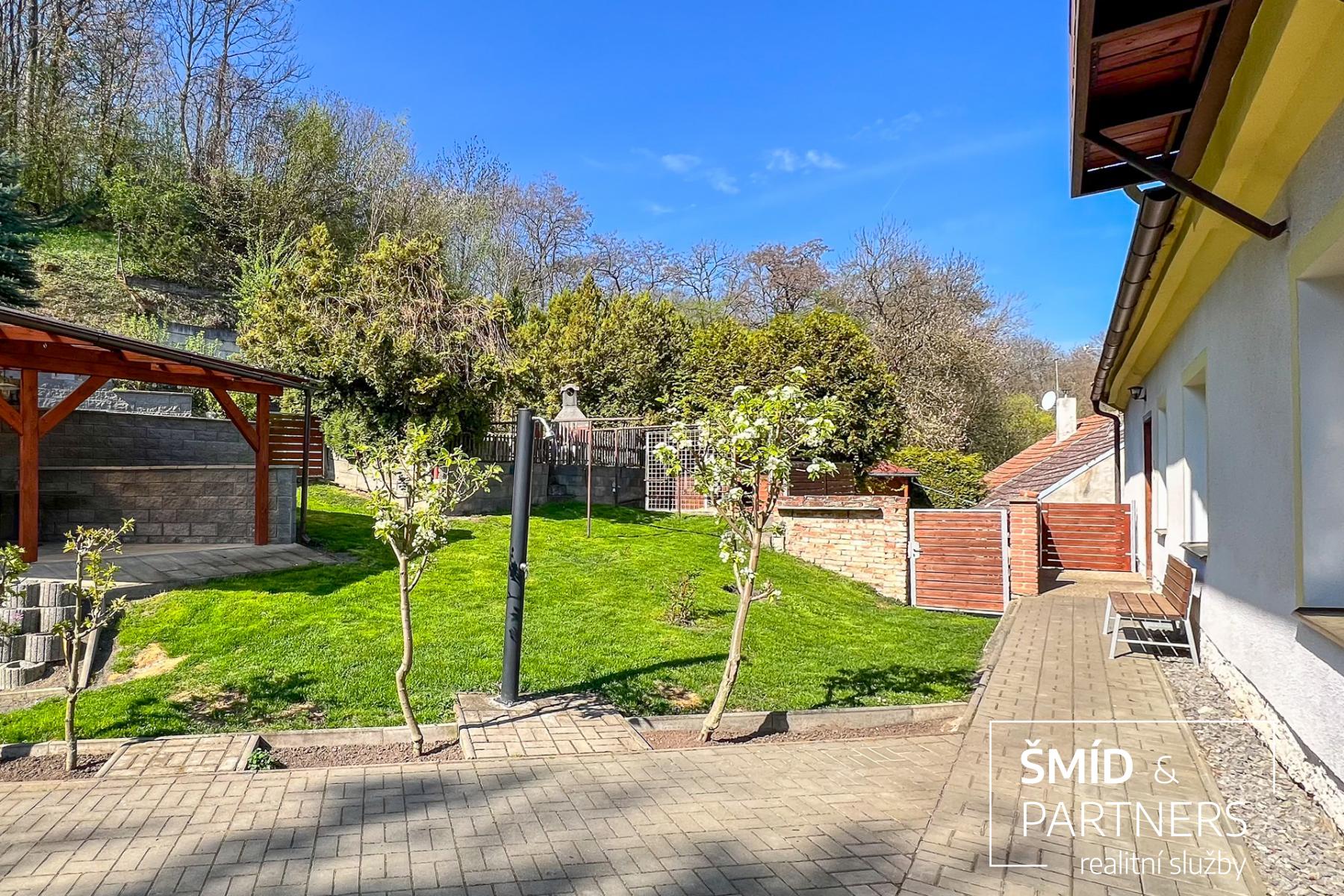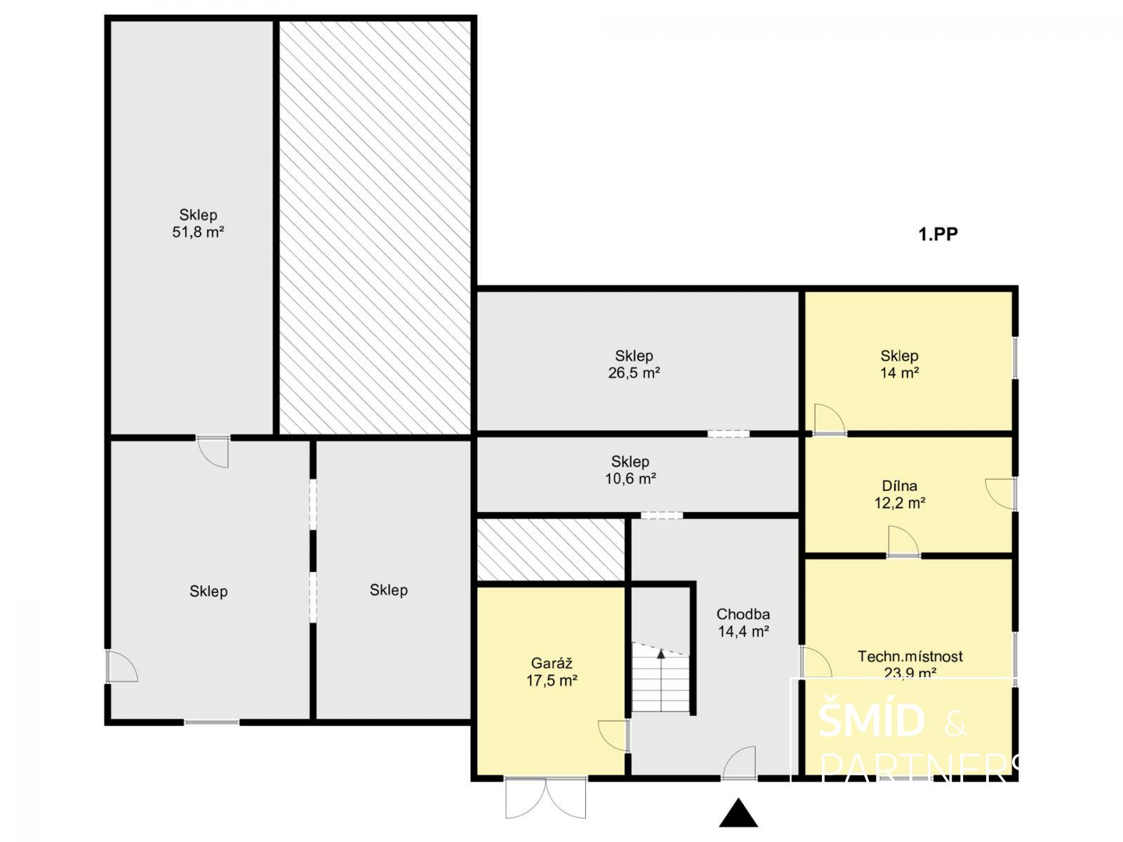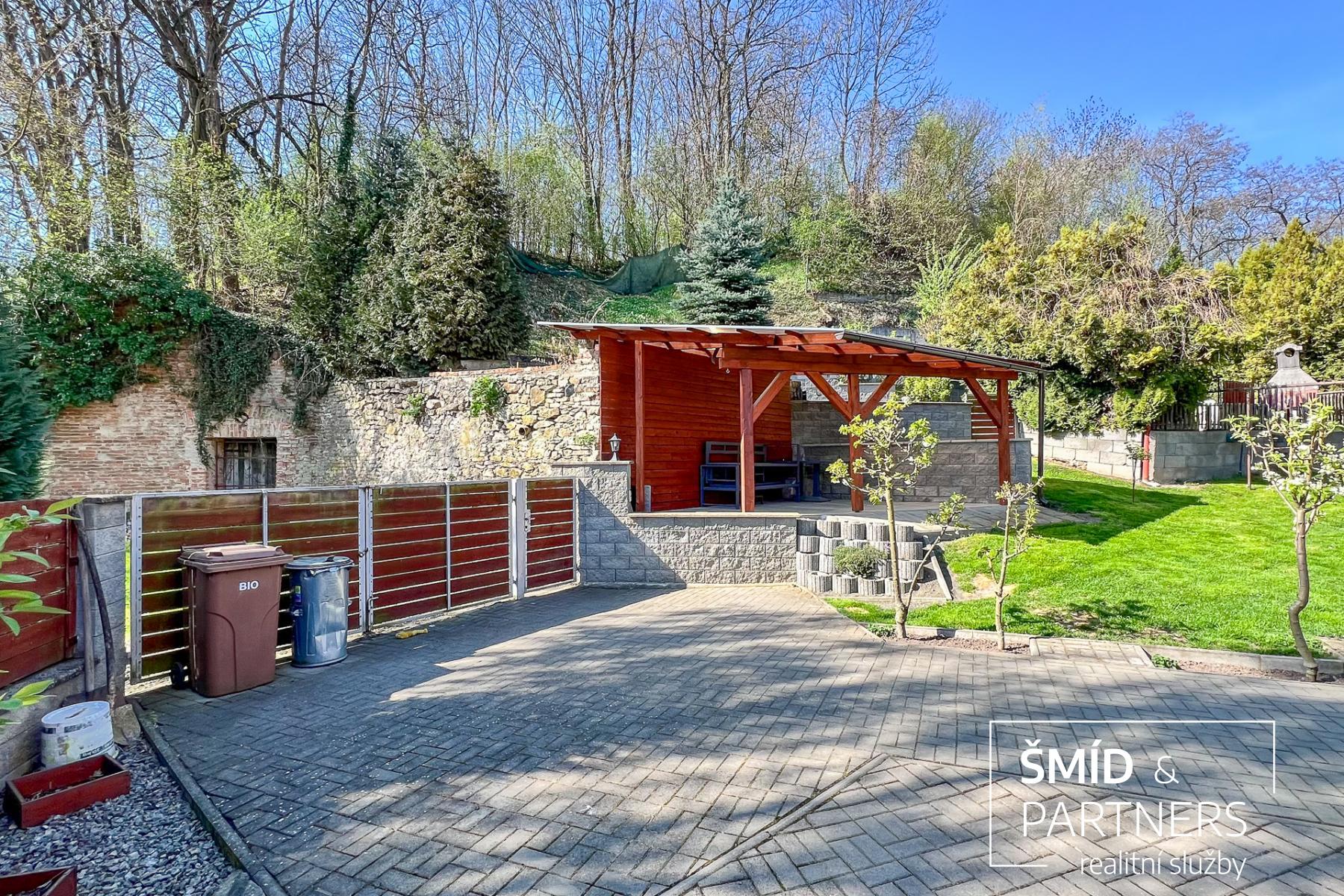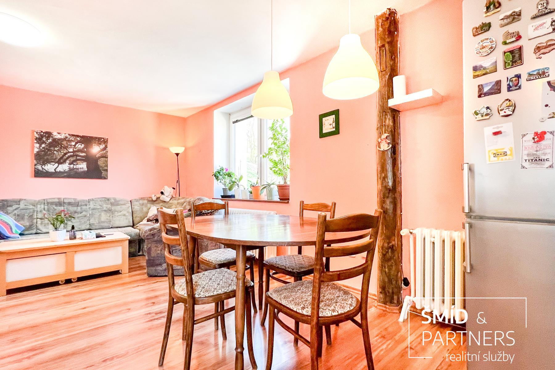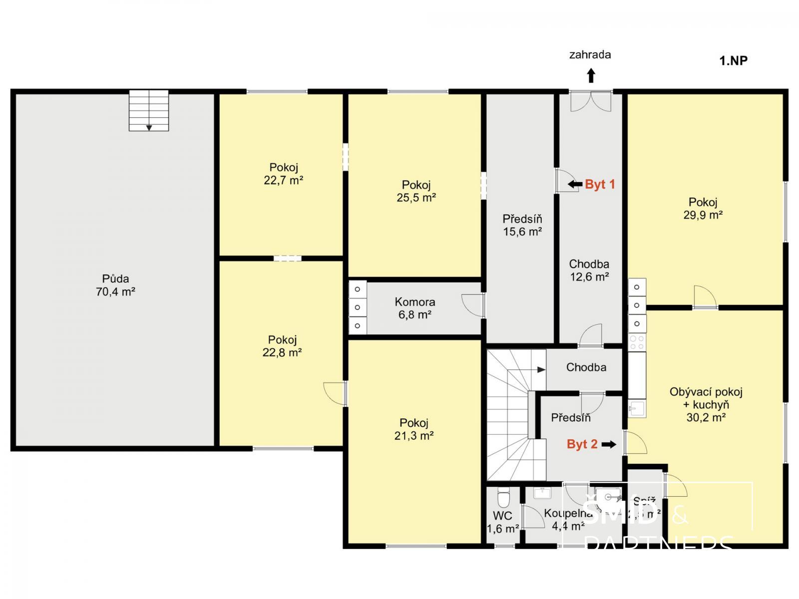 Naše kancelář nabízí k prodeji mimořádně velký venkovský rodinný dům se třemi bytovými jednotkami, zahradou, garáží a rozsáhlými sklepními prostory. Dům pochází nejspíše z první poloviny 19. století a nachází se v těsném sousedství Radimského zámku a jeho rozlehlého parku. Dům je zapuštěn do svahu, a tak je z jeho 1 NP krásný přístup přímo do zahrady, která se celou svou plochou nachází za domem. Za jedním ze vstupů do domu z klidné ulice se v jeho přízemí nachází rozsáhlé technické prostory s dílnou, garáž a masivní sklepní prostory s klenutými stropy. V této části by bylo možné v případě potřeby vybudovat další bytovou jednotku. Ta by tak disponovala i samostatným bočním vstupem a její dominantou by byly nádherné valené a křížové klenby. Z přízemí vede centrální schodiště do 1NP, kde se nacházejí dva samostatné byty. Jeden, menší, o ploše 67 m2 je v původním stavu zhruba ze 70./80. let 20. stol. a dispozičně je řešen jako 2+kk. Druhý z bytů na tomto podlaží je momentálně připraven na kompletní rekonstrukci, takzvaně na cihlu, a tedy s možností dispozičních změn. Jeho plocha činí 115 m2 a výška podlah je ve stejné úrovni jako zahrada. Úplně se zde nabízí při rekonstrukci použít francouzská okna a dodat tak tomuto bytu benefit přímého vstupu na zahradu.