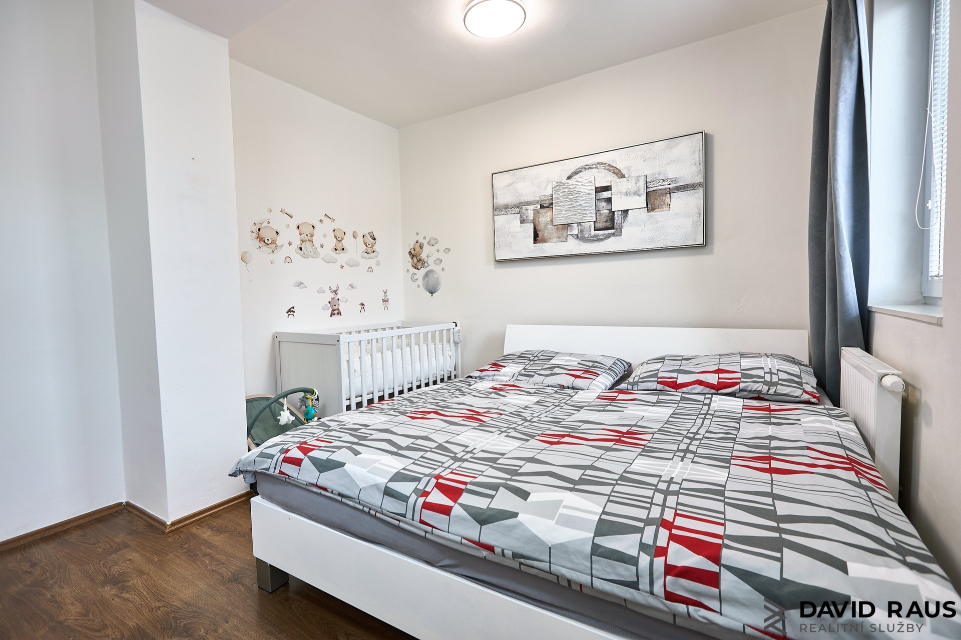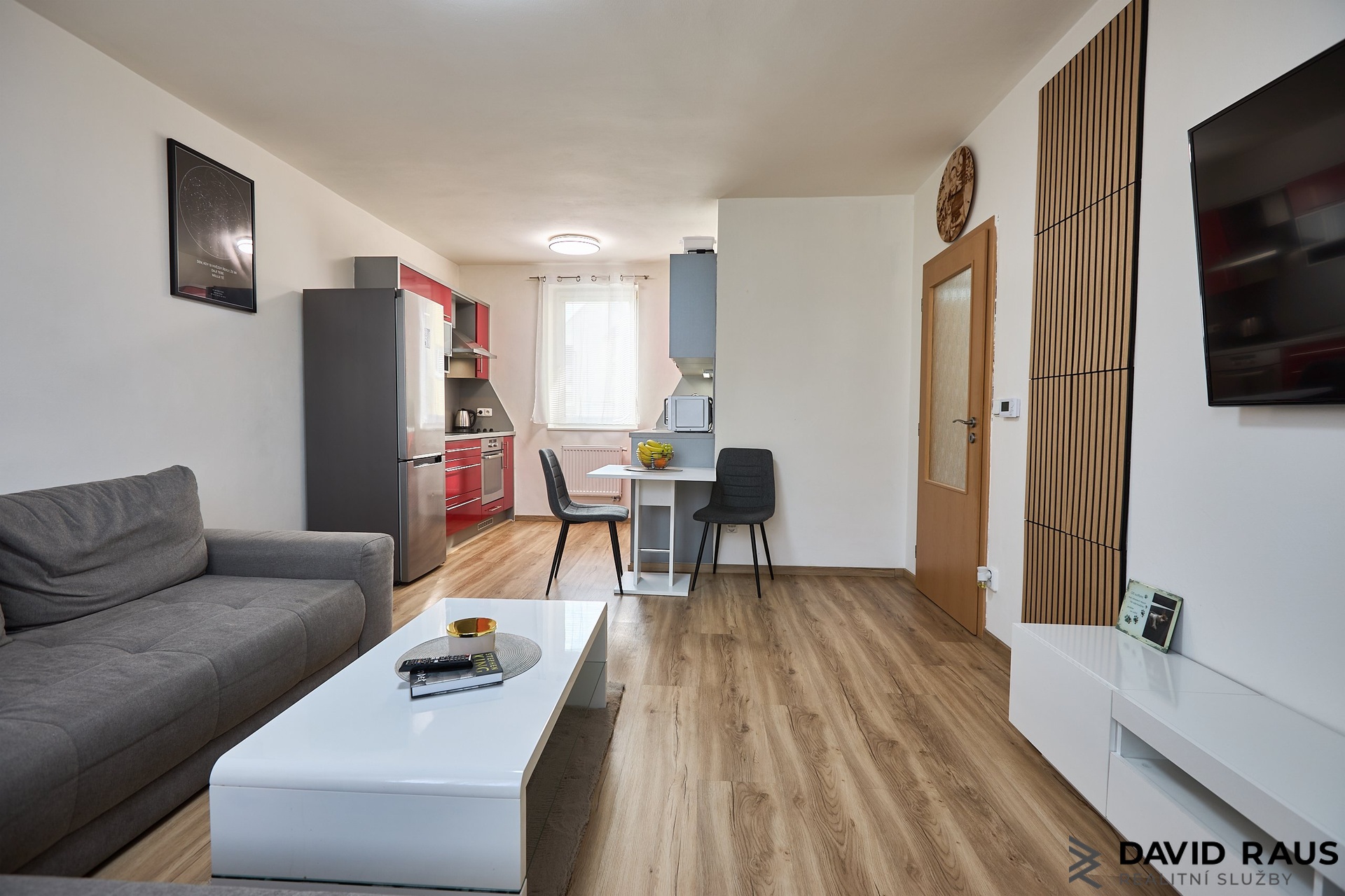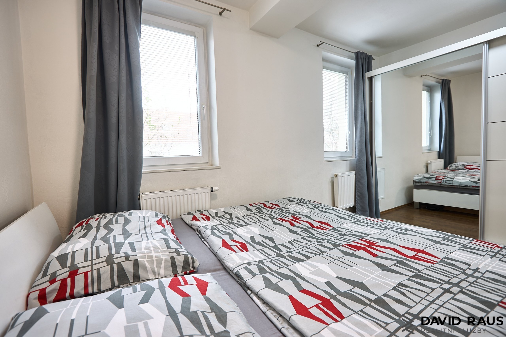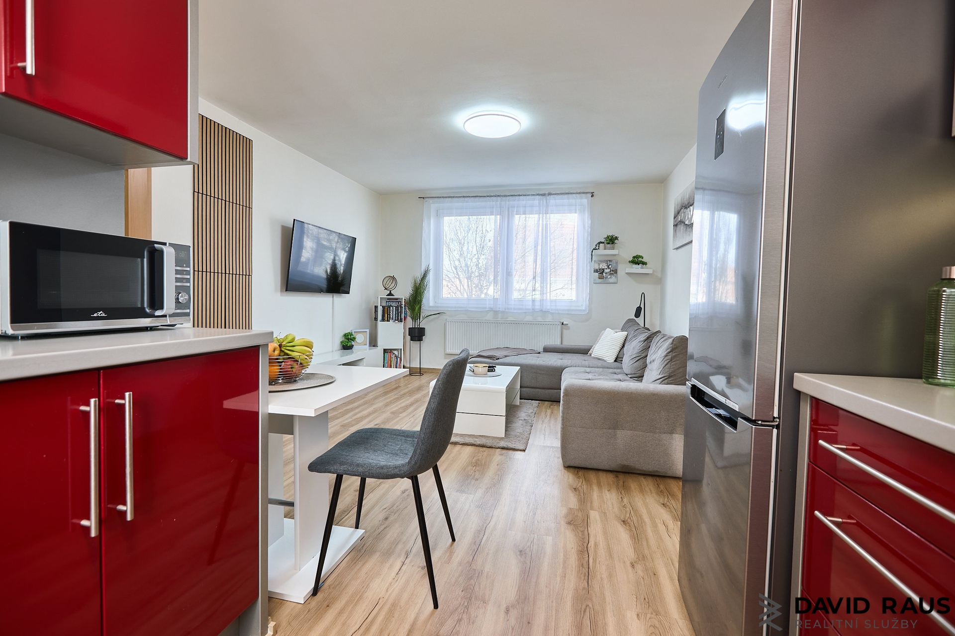 Byt je navržen s důrazem na praktické uspořádání prostoru a dostatek úložných možností. Po vstupu do bytu se ocitnete v prostorné předsíni, kde se po levé straně nachází velkorysá vestavěná skříň sahající až ke stropu, která nabízí dostatek místa pro uložení oblečení i dalších domácích potřeb. Po pravé straně předsíně je vstup do samostatného WC a koupelny. Přímo naproti koupelně se nachází samostatný pokoj, který je aktuálně využíván jako ložnice. Prostor je dostatečně velký nejen pro manželskou postel, ale také například pro dětskou postýlku či další úložný nábytek, což z něj činí velmi flexibilní místnost vhodnou pro různé životní situace. Z chodby dále vstoupíte do obývacího pokoje s kuchyňským koutem, který tvoří přirozené centrum celého bytu a nabízí dostatek prostoru pro každodenní život i odpočinek.