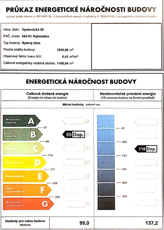 Bytový dům je realizovaný jako nízkoenergetický vč. rekuperace vzduchu, zateplení, tepelně izolační trojskla v oknech atp. = příznivé náklady na vytápění. Celý objekt je kompletně zabezpečen kamerovým systémem.