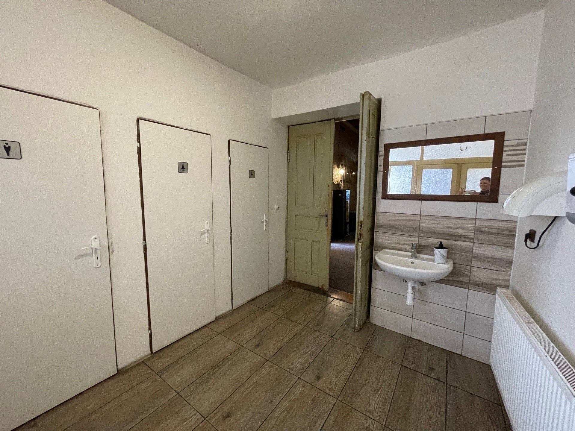 Dispozičně: hlavní místnost s výčepem /30 míst/ (43 m2) + kavárna - salónek /20 míst/ (22 m2) a dálší místnost - salónek, kde je prostor na další posezení a taneční vyžití (48 m2), kuchyně (12 m2), 2 sklady, kancelář, technická místnost, zrekonstruované sociální zázemí a chladící sklep, průjezd (40 m2).