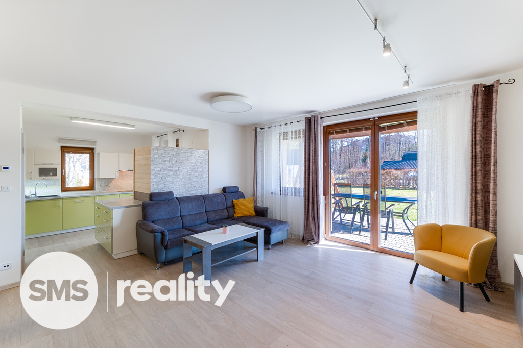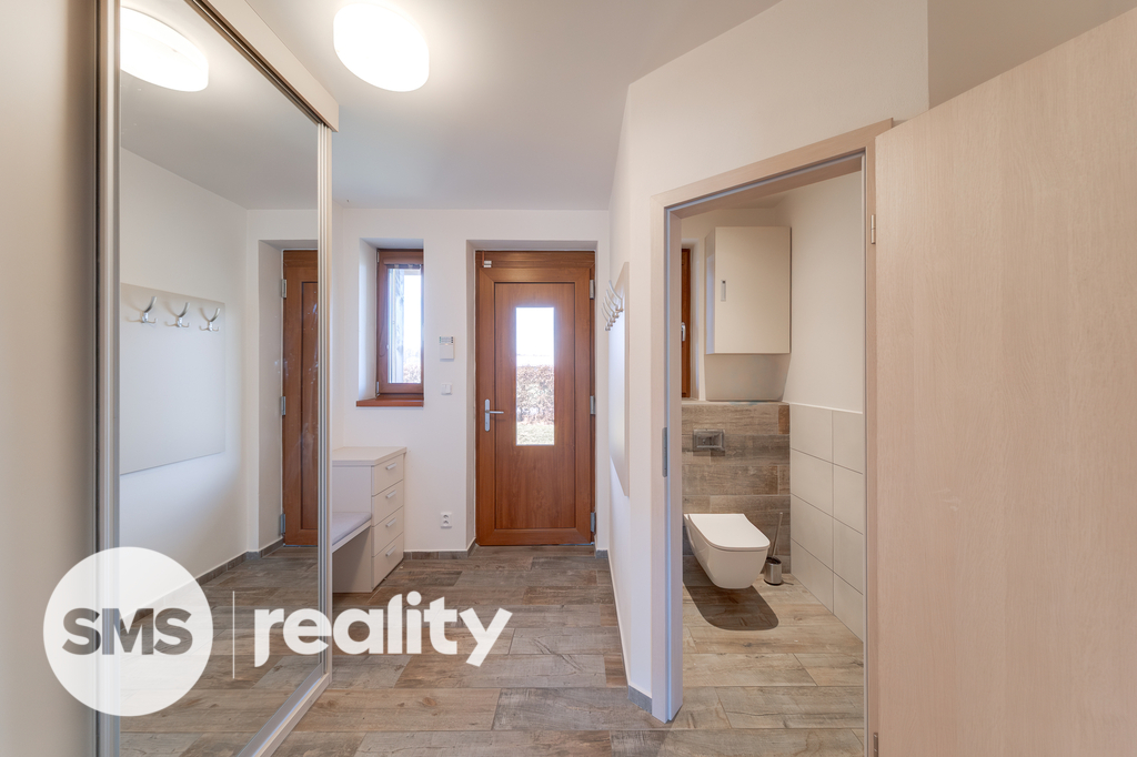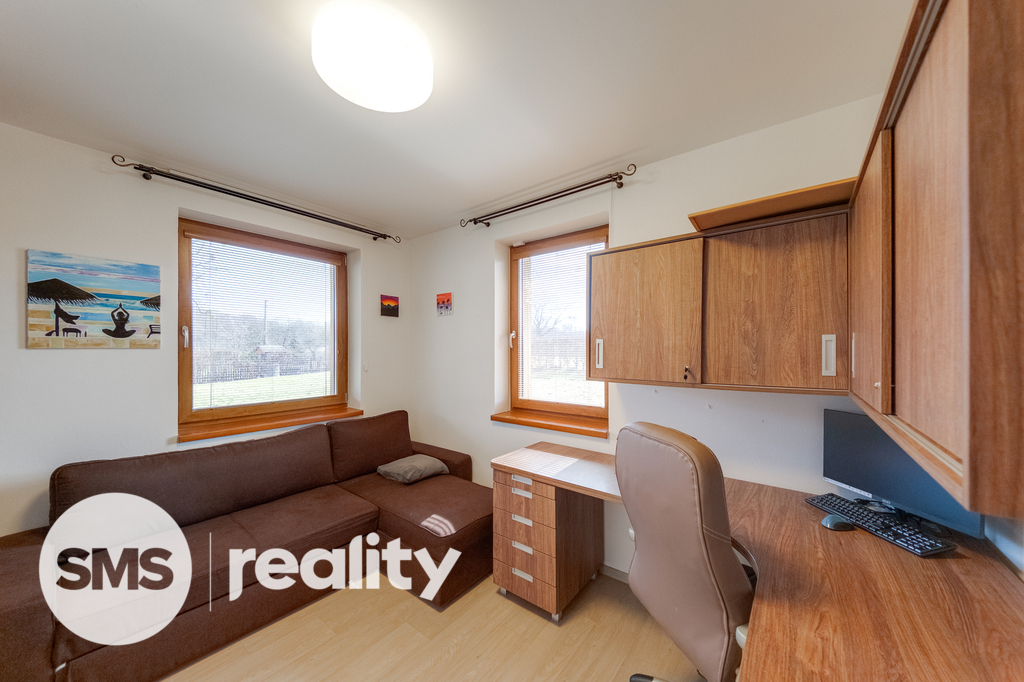 Dům je částečně vybaven. Vnitřní dispozice zahrnuje obývací pokoj s krbem, který navozuje příjemnou atmosféru. Vnitřní součástí je také infra sauna. Nemovitost disponuje dvěma koupelnami - jednou se sprchou a druhou s vanou a WC, navíc je ještě jedno samostatné WC.