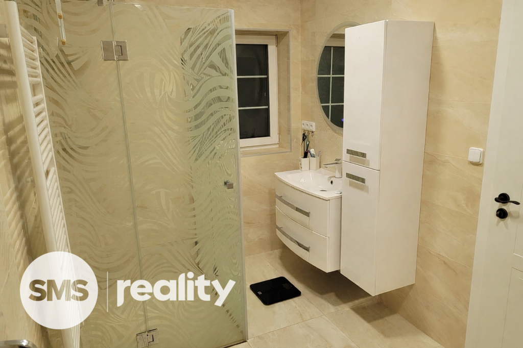 Dům se pyšní dvěma koupelnami, obě vybavené vanou, sprchou a WC, dále se zde nachází samostatné WC a prádelna s kotlem. Vytápění je řešeno tepelným čerpadlem typu země-voda a v obývacím pokoji jsou instalována kachlová kamna, což zajišťuje příjemnou atmosféru během chladných měsíců. Dům je vybaven podlahovým vytápěním, což přispívá k energetické efektivitě a pohodlí. Součástí domu je vlastní čistírna odpadních vod a retenční nádrž. Nemovitost je navržena jako bezbariérová, vhodná i pro osoby se sníženou pohyblivostí.
