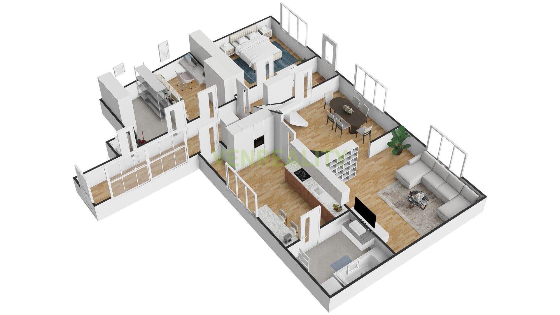 Současnou dispozici domu lze v přízemí rozšířit ještě o dvě místnosti, a to adaptací dvou místností, kterou již současný majitel nerealizoval, vzniknout zde měla pracovna/pokoj pro hosty a technická místnost (viz. 3D půdorys). Tyto dvě místnosti v součtu o výměře cca 17 m2 jsou již započtené do užitné plochy domu.