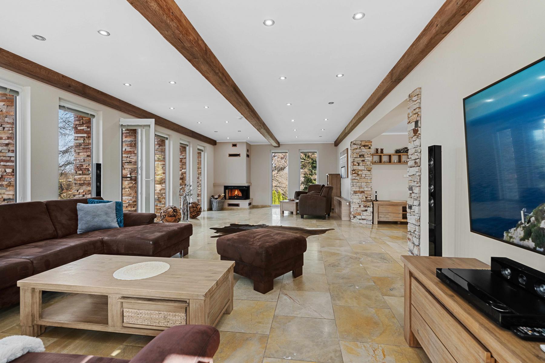 Dominantou domu je prostorná hlavní obývací místnost s krbem a kuchyňský kout s otočným krbem. Celý prostor je prosvětlen velkoformátovými okny a přirozeně propojuje interiér místností se zahradou. Zázemí domu je navržené tak, aby bylo dosaženo plnohodnotného komfortu: