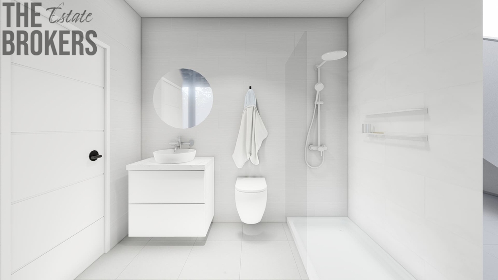 Ložnice a koupelny: Každá nemovitost má čtyři ložnice a tři koupelny se závěsnými toaletami, umyvadlovými skříňkami, zrcadly s osvětlením a sprchami s „dešťovým efektem“.