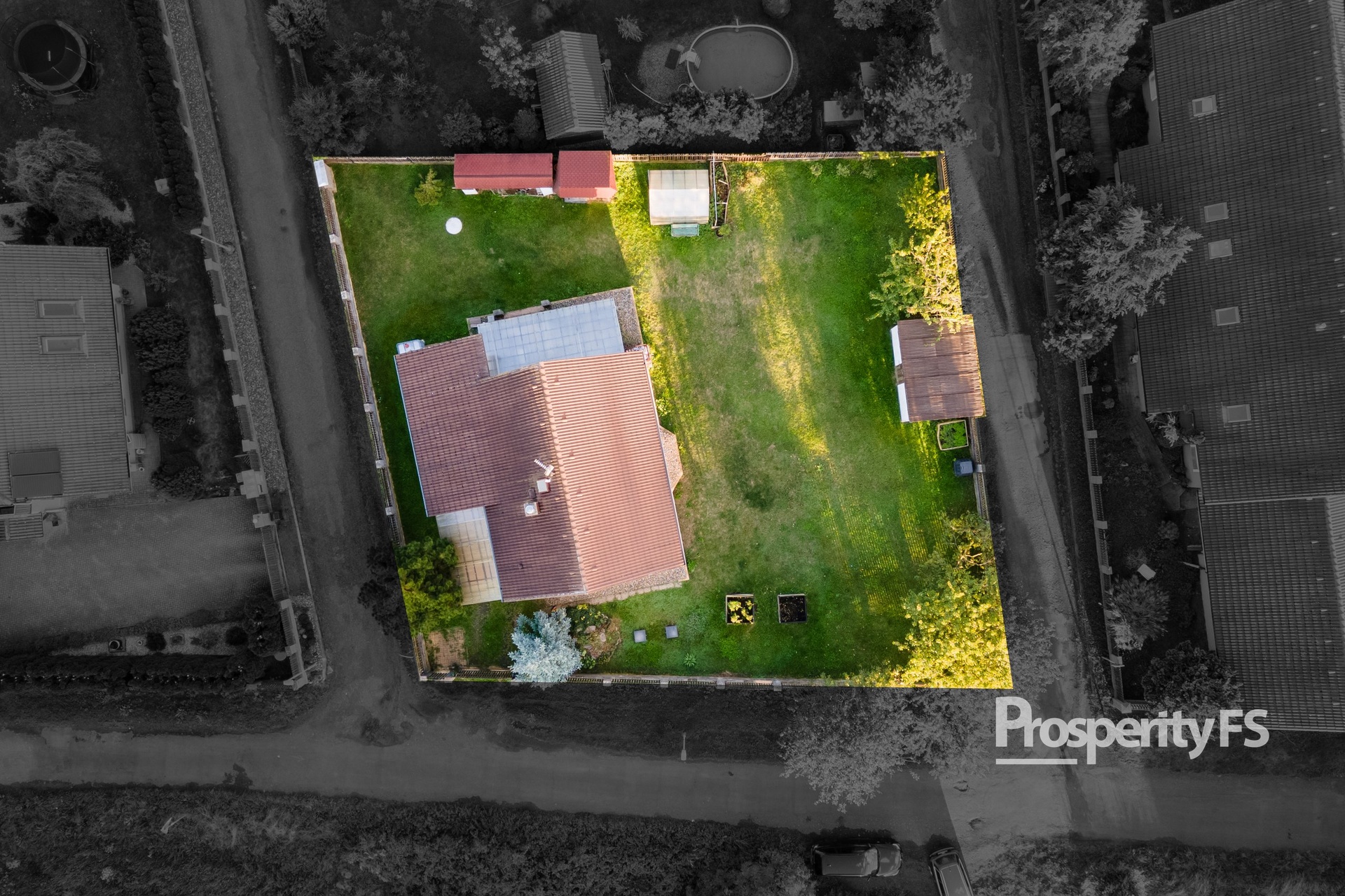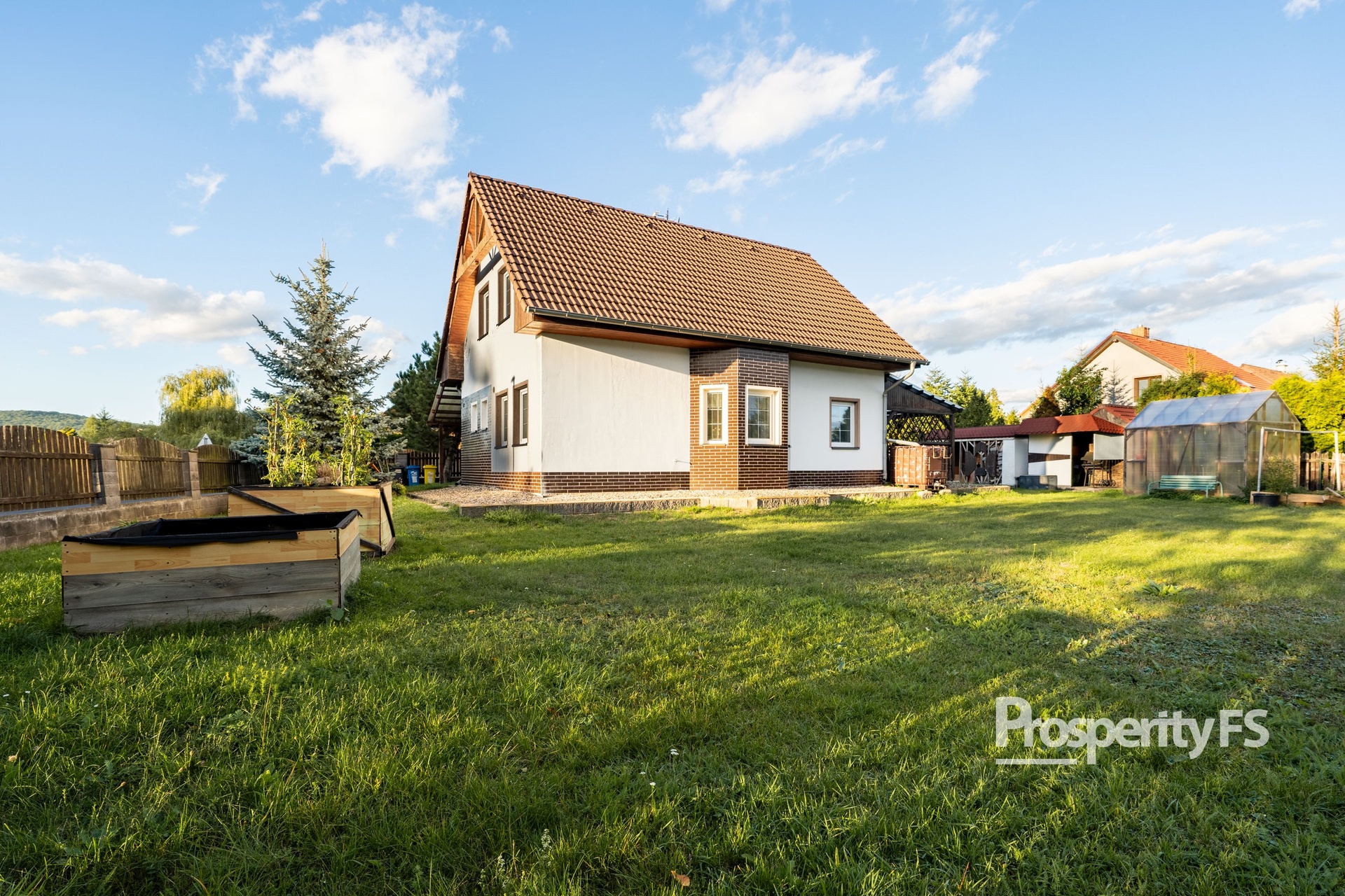Celková výměra pozemku je cca 960 m². Na zahradě najdete nejen dostatek prostoru pro hry dětí, ale i skleník, dílnu a zahradní domek. Milovníci pěstování ocení připravené záhony a skleník, kutilové zase vlastní dílnu.