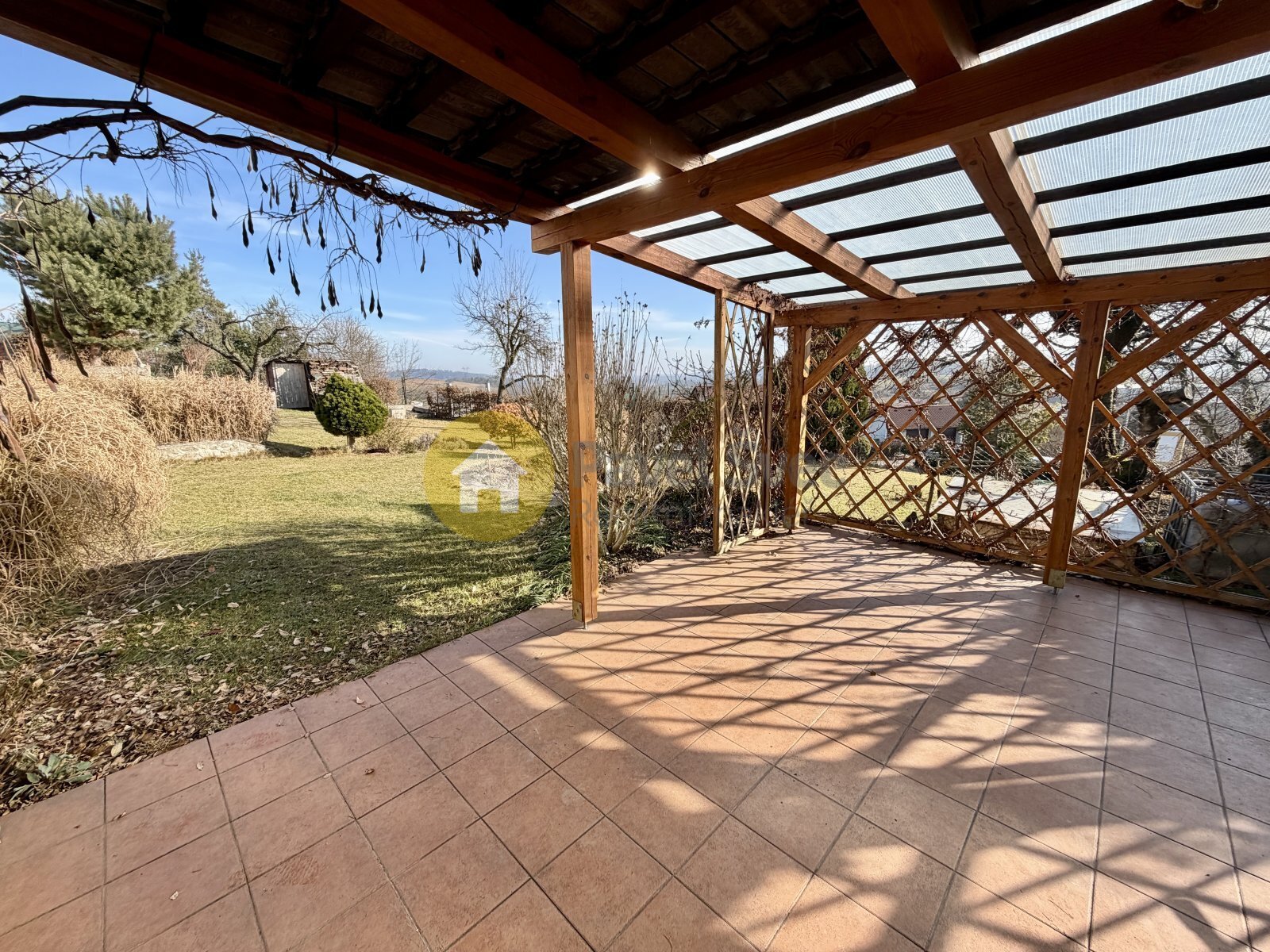 Na udržované zahradě je místo na kouzelné kryté posezení s ohništěm a navazující udírnou (přivedena voda, odpad a elektřina).
