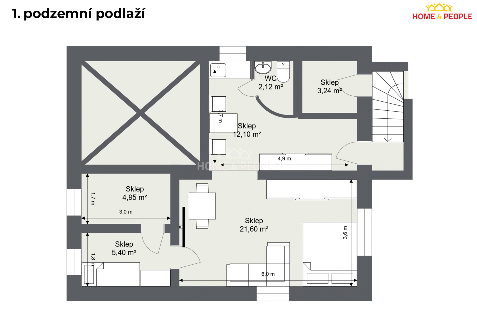 V suterénu se nalézá prostor v dispozici 2+1, který má vlastní vstup a obsahuje i koupelnu se sprchou a WC, kuchyni i technickou místnost. Jsou zde samostatné měřáky elektřiny i vody a může sloužit k mnoha účelům - klubovna, kuřárna, dílna...