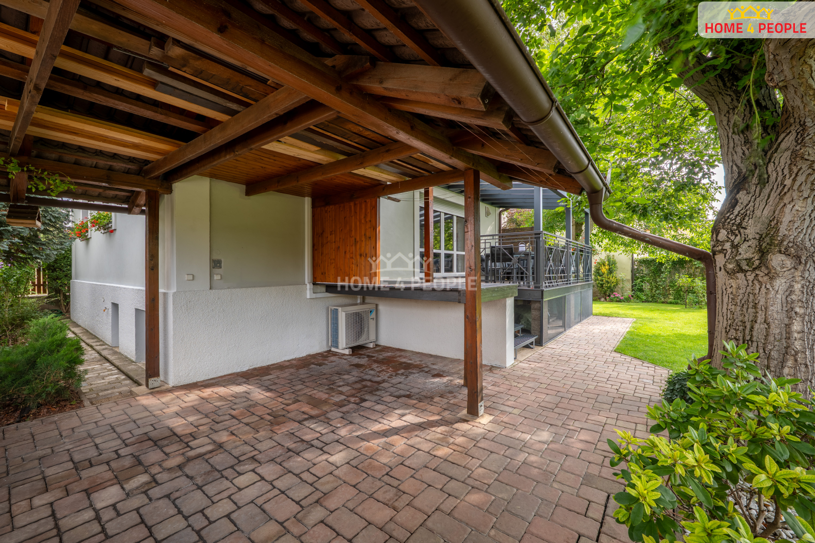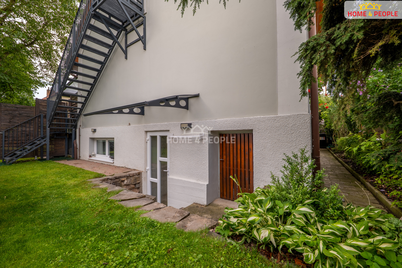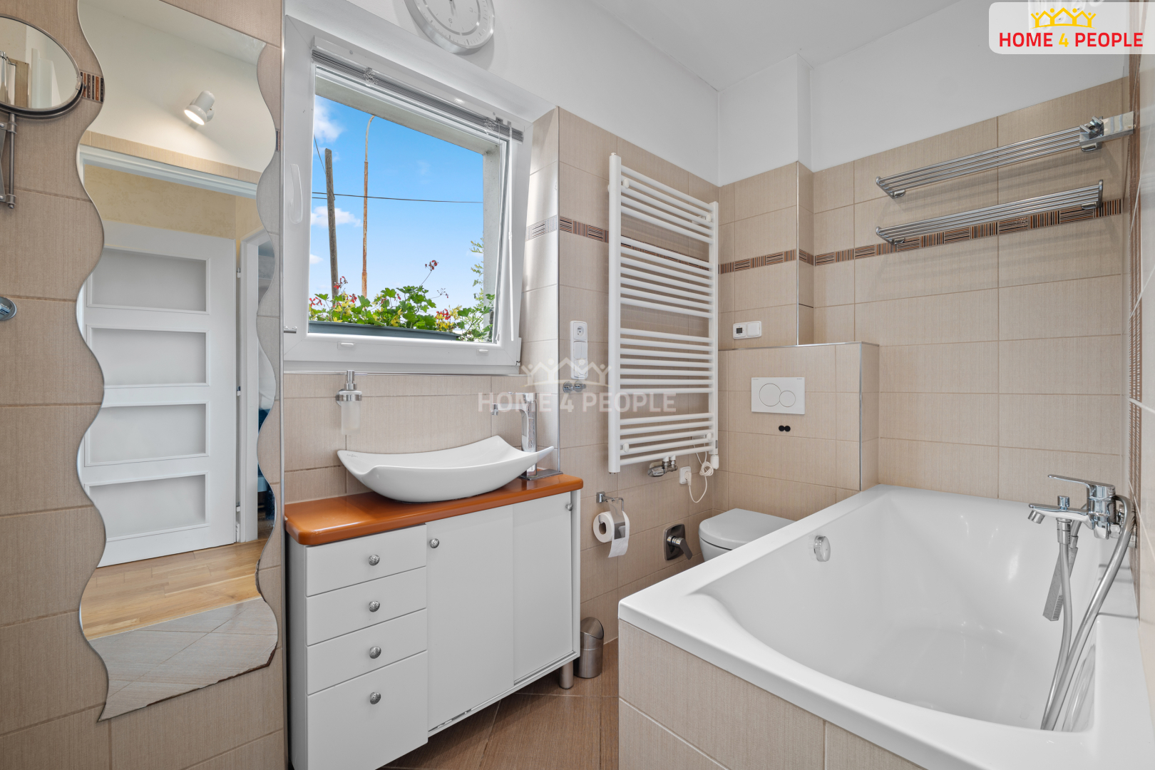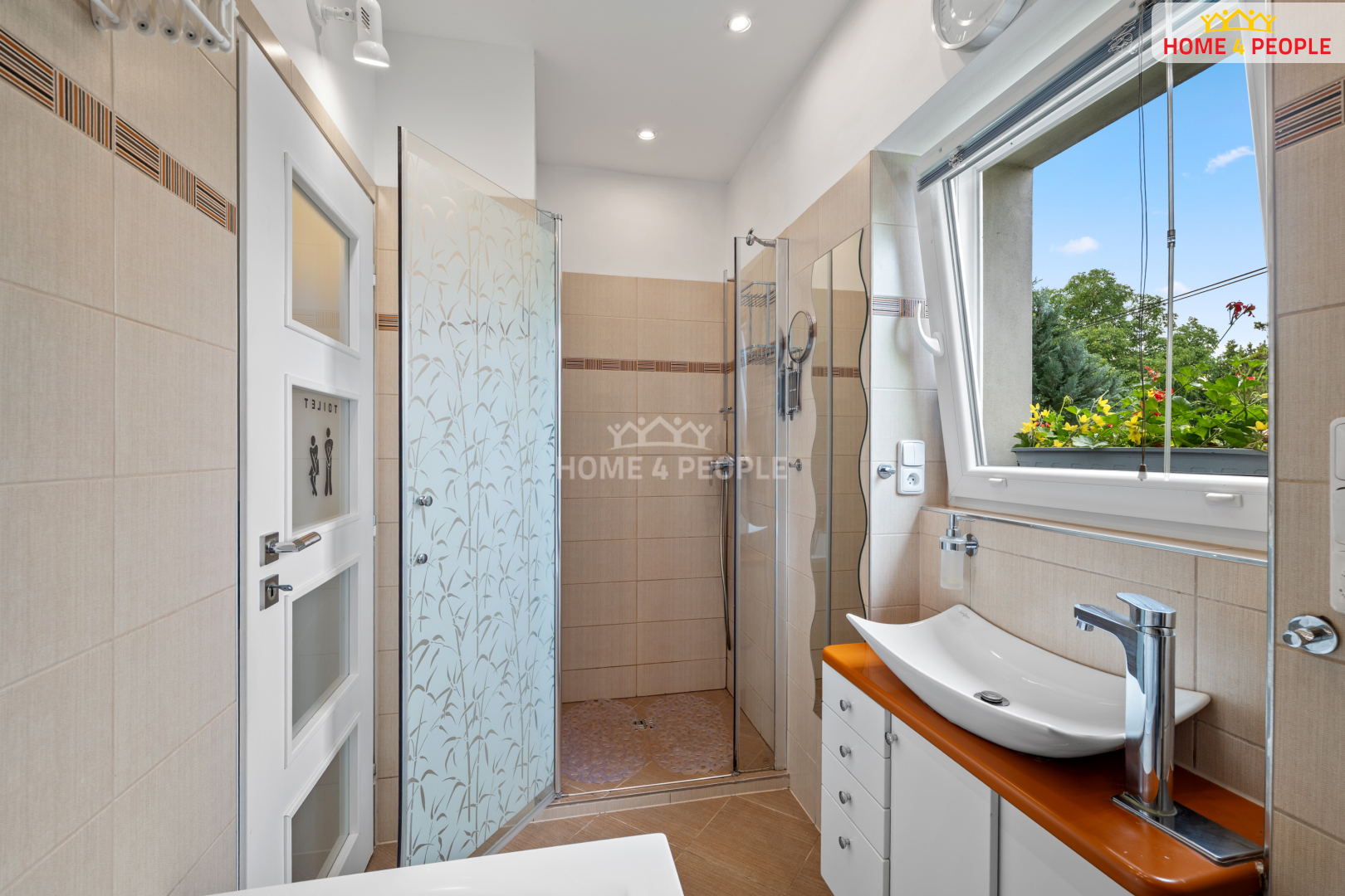 V přízemí se nachází hlavní bytová jednotka v dispozici 3+1, 64 m², s mimořádně pěkným výhledem i vstupem dělenými francouzkými okny na hliníkovou 25 m² pergolu, předokenní roletou a podlahovým konvektorem. Posezení, které si užijete značnou část roku, ať teple i chladnějším období s něčím na zahřátí. Za vstupními dveřmi se nachází zádveří a možnost i pro vstup do podkroví. Vzhledná kuchyně se spotřebiči, v pokojích protihluková okna s trojskly, klimatizace, koupelna s vyhřívanou podlahou, vanou i sprchovým koutem a WC bidetem 2v1. V chodbě plynový kondenzační kotel Vailant ecoTecpro 2018.