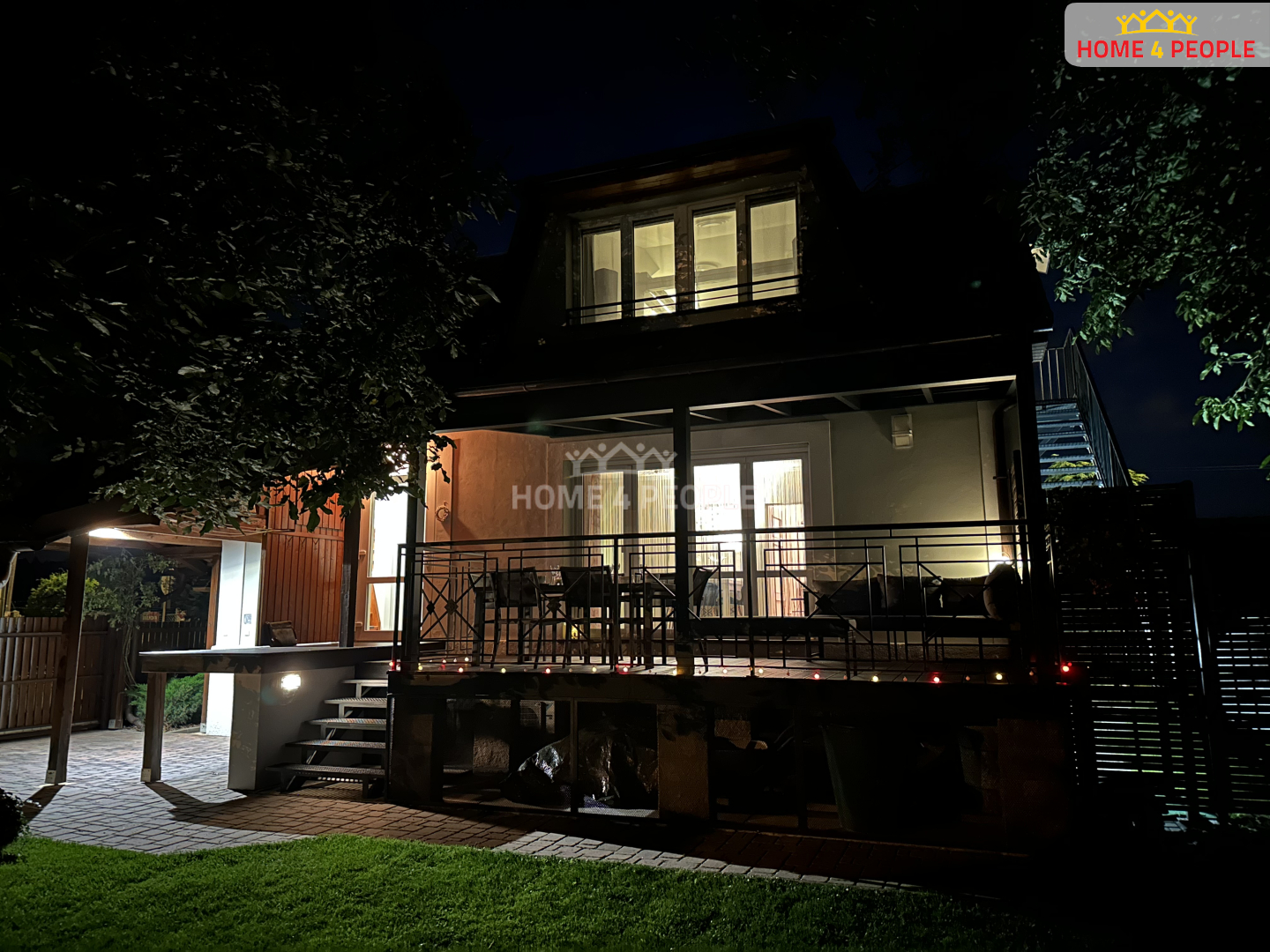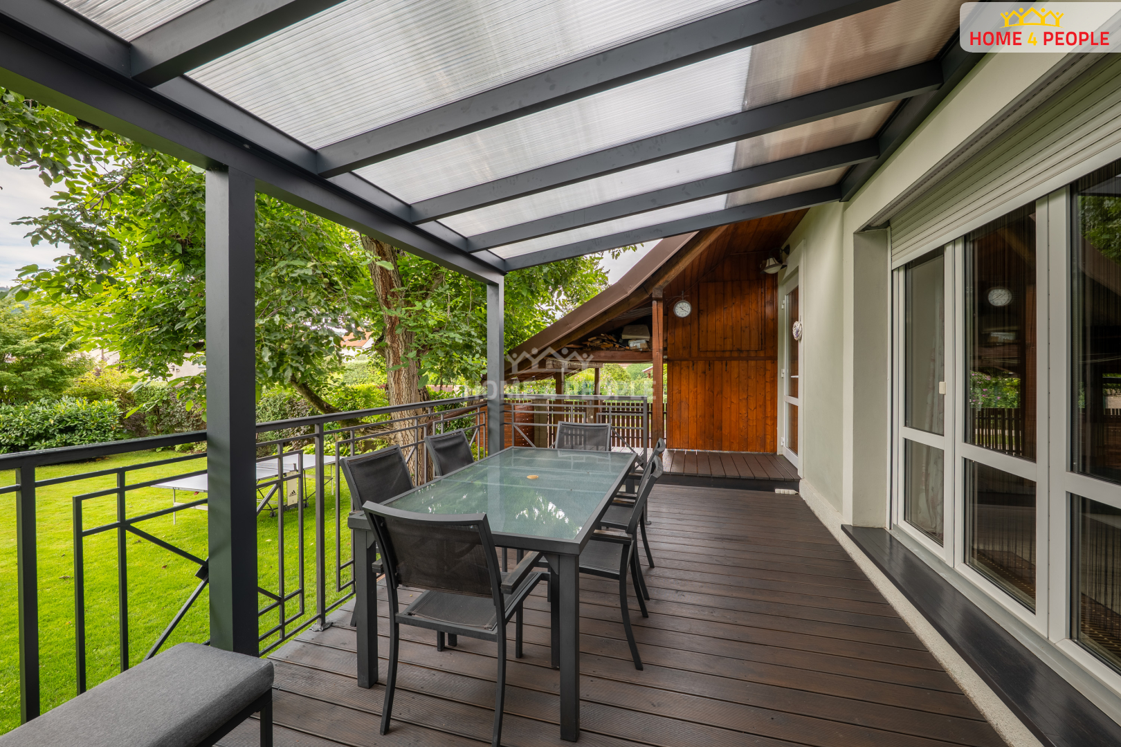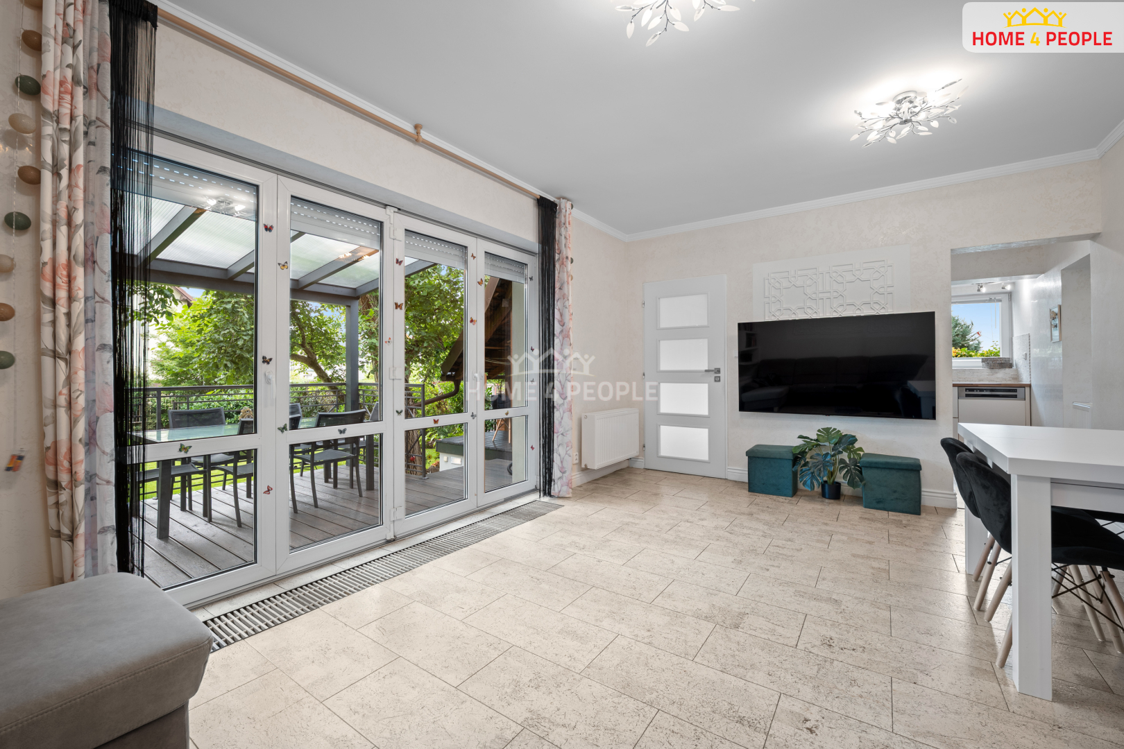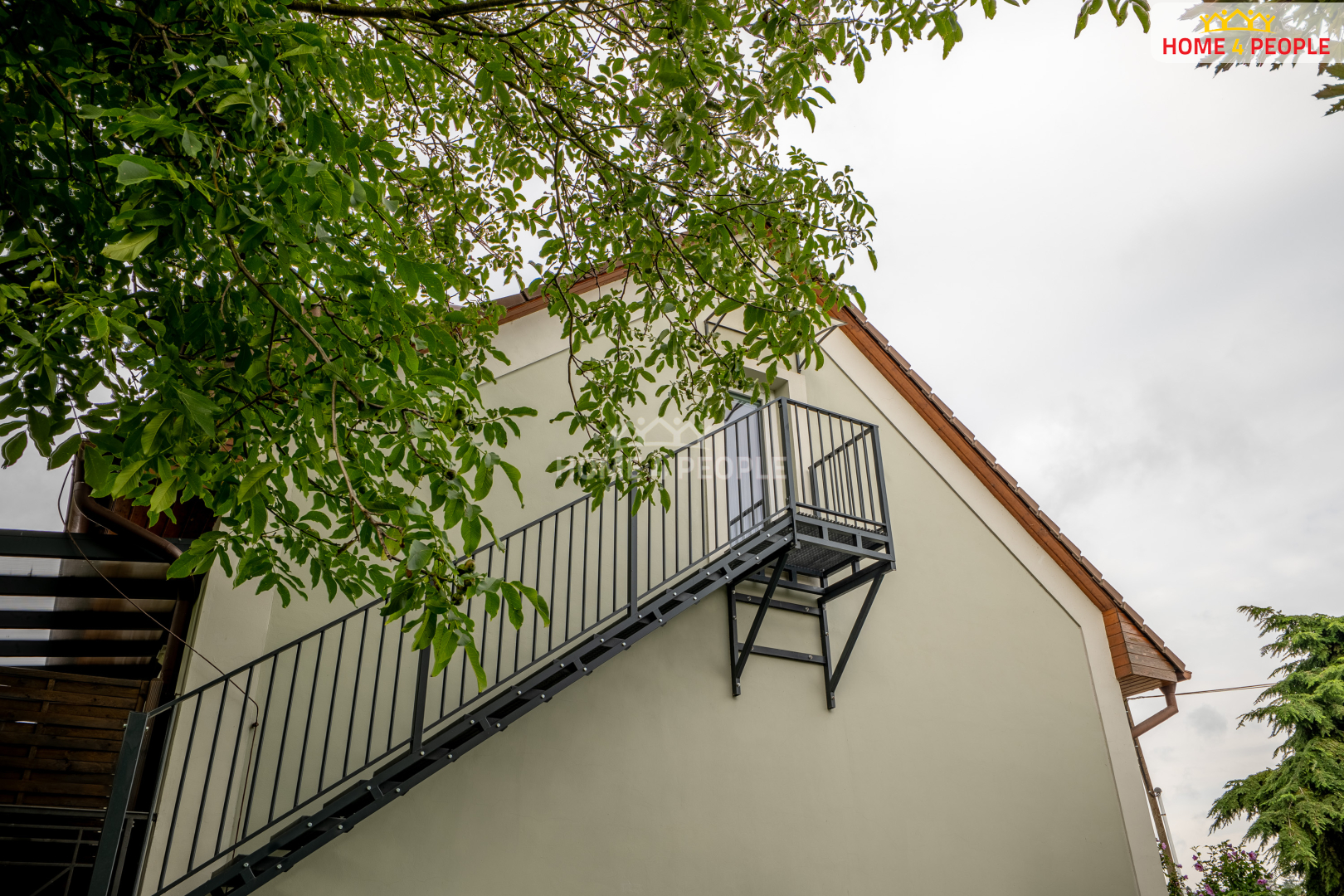 V přízemí se nachází hlavní bytová jednotka v dispozici 3+1, 64 m², s mimořádně pěkným výhledem i vstupem dělenými francouzkými okny na hliníkovou 25 m² pergolu, předokenní roletou a podlahovým konvektorem. Posezení, které si užijete značnou část roku, ať teple i chladnějším období s něčím na zahřátí. Za vstupními dveřmi se nachází zádveří a možnost i pro vstup do podkroví. Vzhledná kuchyně se spotřebiči, v pokojích protihluková okna s trojskly, klimatizace, koupelna s vyhřívanou podlahou, vanou i sprchovým koutem a WC bidetem 2v1. V chodbě plynový kondenzační kotel Vailant ecoTecpro 2018.