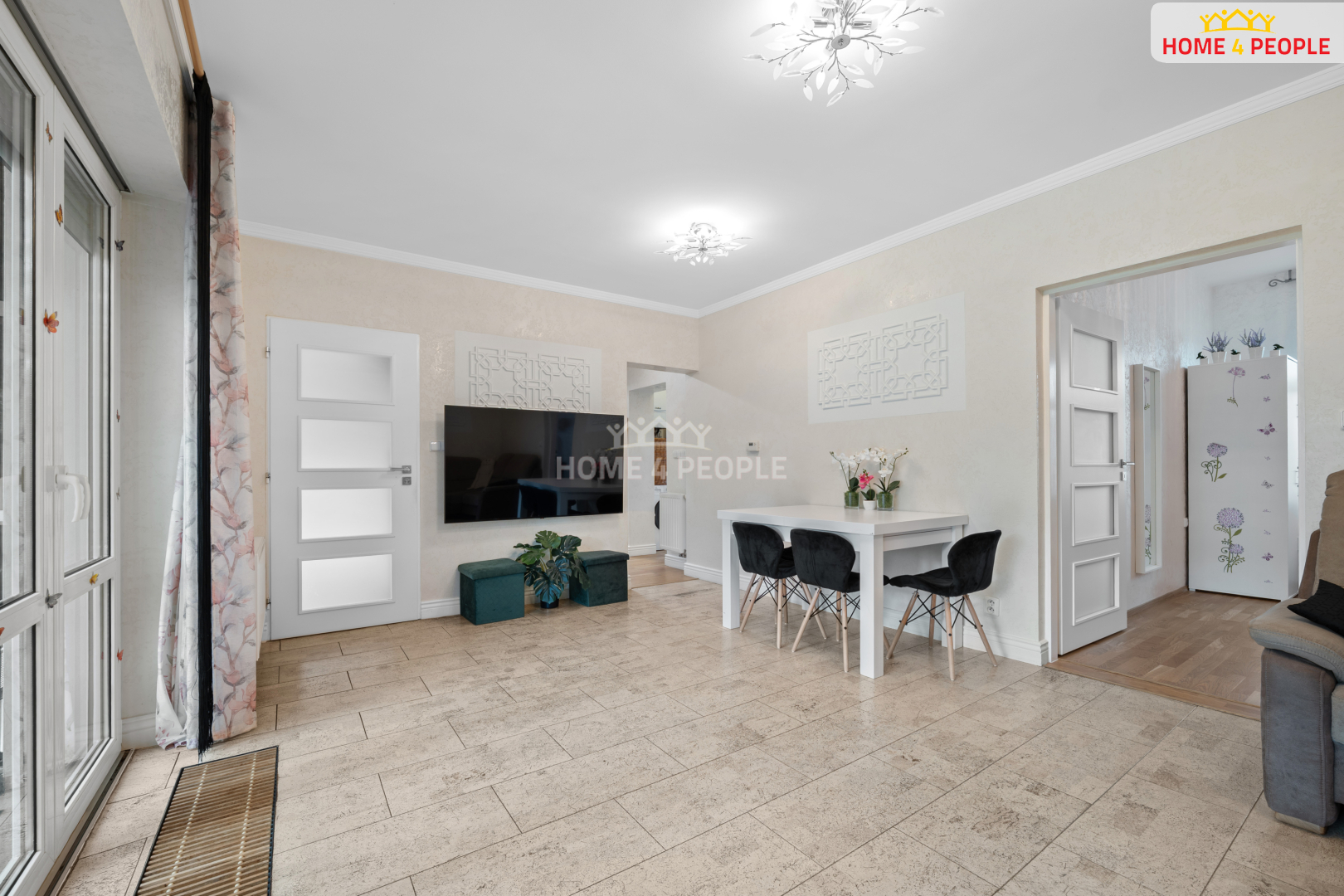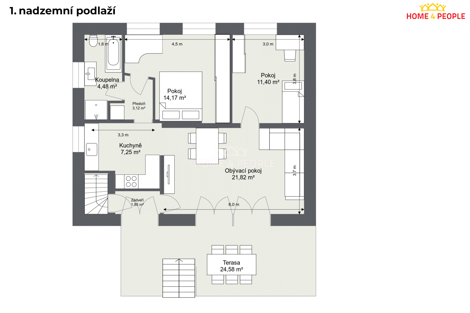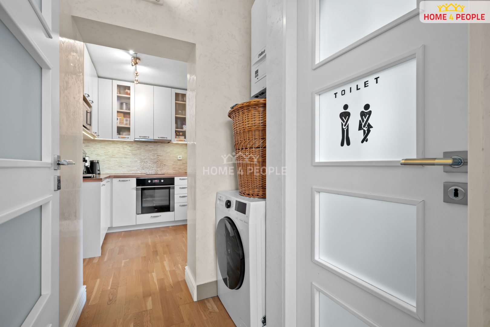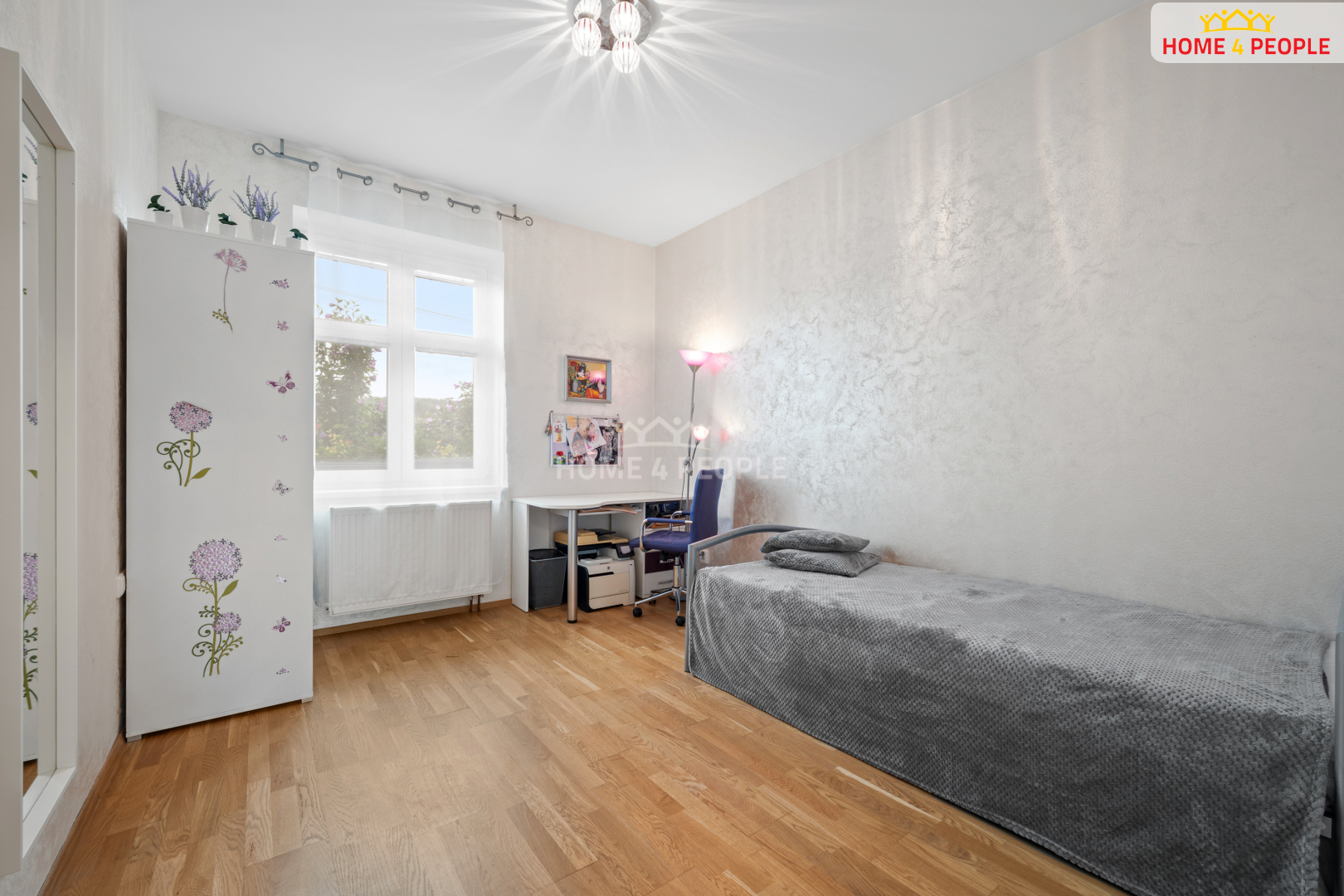 V přízemí se nachází hlavní bytová jednotka v dispozici 3+1, 64 m², s mimořádně pěkným výhledem i vstupem dělenými francouzkými okny na hliníkovou 25 m² pergolu, předokenní roletou a podlahovým konvektorem. Posezení, které si užijete značnou část roku, ať teple i chladnějším období s něčím na zahřátí. Za vstupními dveřmi se nachází zádveří a možnost i pro vstup do podkroví. Vzhledná kuchyně se spotřebiči, v pokojích protihluková okna s trojskly, klimatizace, koupelna s vyhřívanou podlahou, vanou i sprchovým koutem a WC bidetem 2v1. V chodbě plynový kondenzační kotel Vailant ecoTecpro 2018.