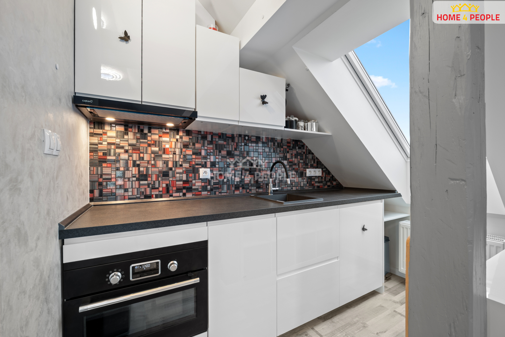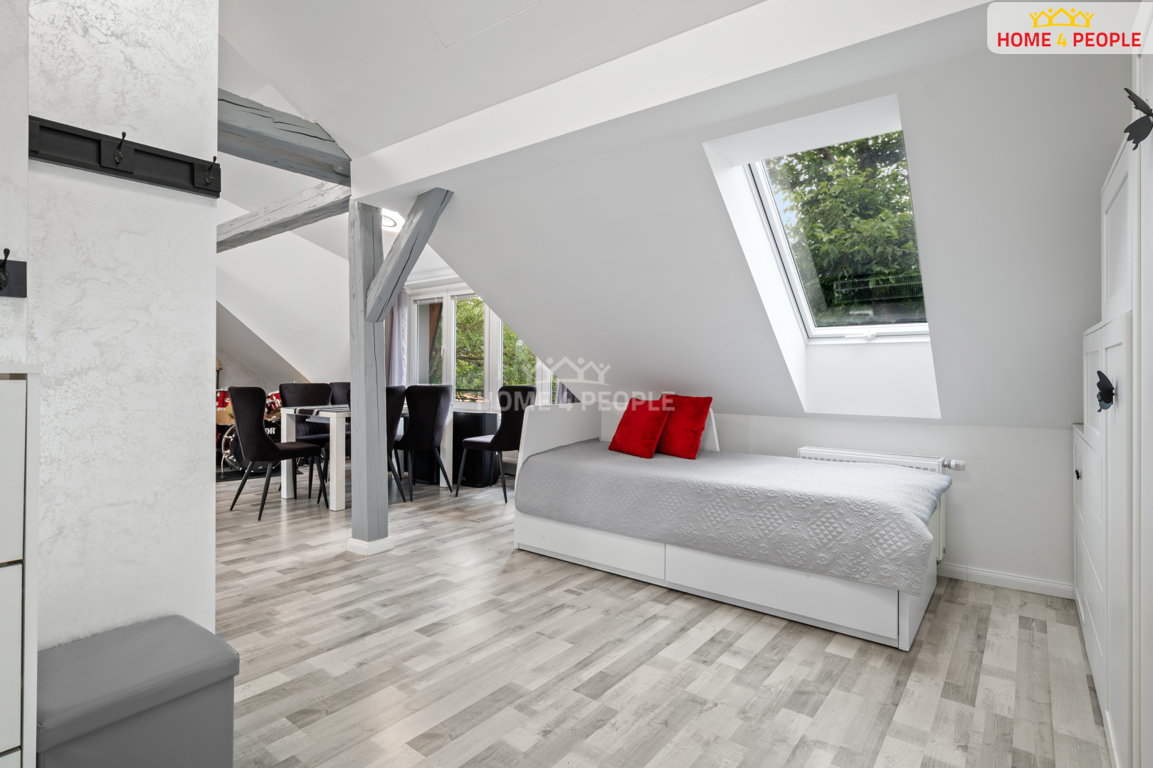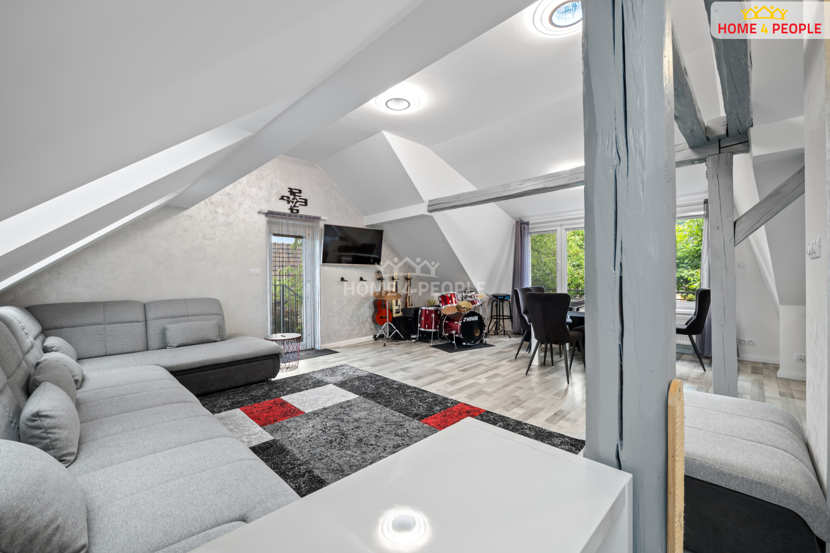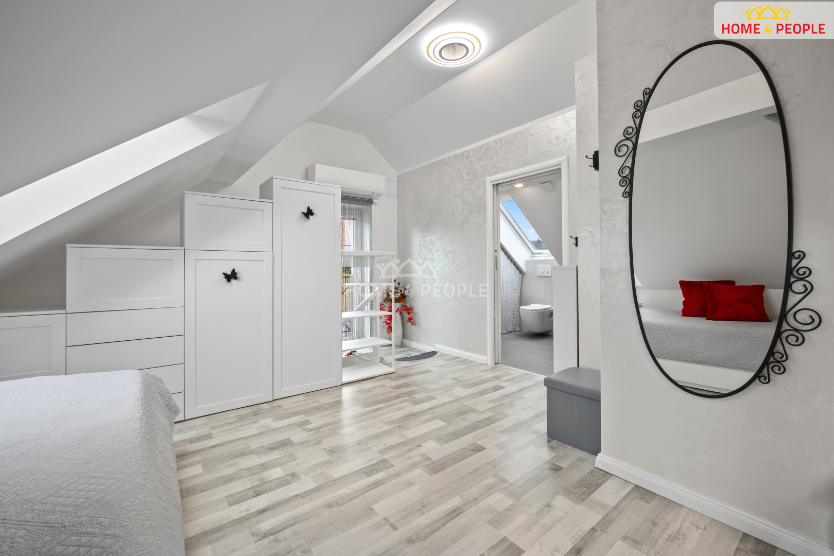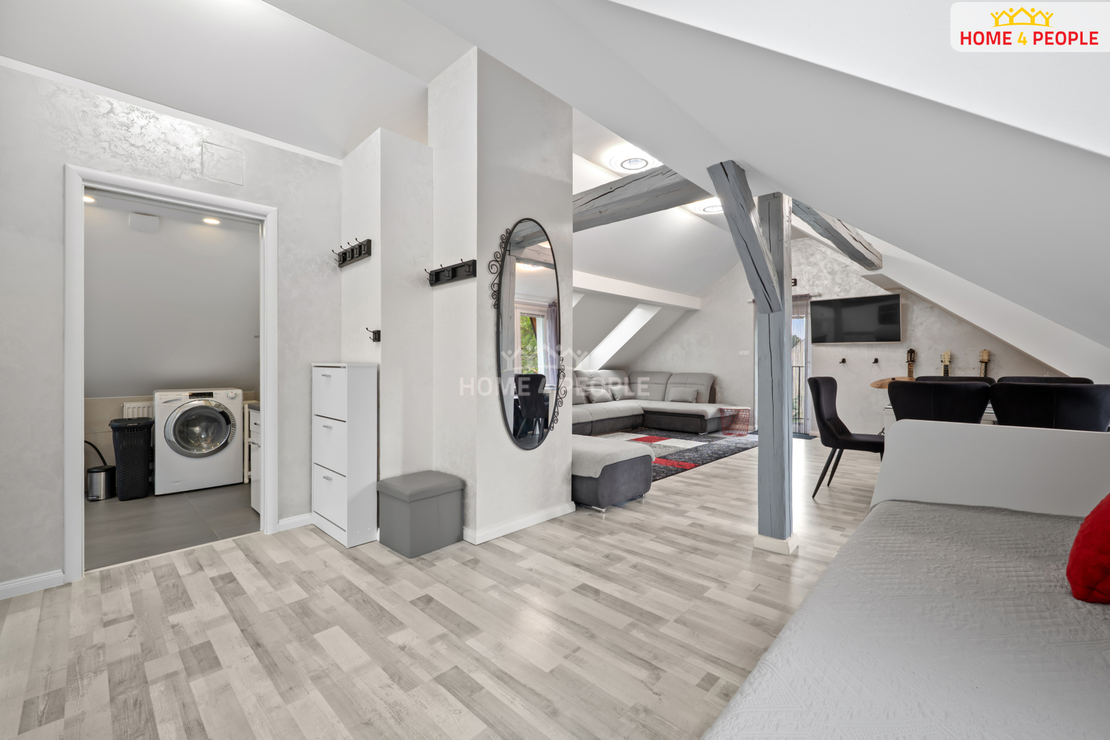 V nově postaveném podkroví (r. 2022) se nalézá velký otevřený apartmán 45 m² s výhledem na Brdy i Berounku, který má 2 vstupy, hlavním vchodem nebo kovovým schodištěm z boční strany. Zahrnuje kuchyňskou linku s vestavěnými spotřebiči (myčka nádobí, lednice, mikrovlná i elektrická trouba), samostatnou koupelnou s el. vyhřívanou podlahou, sprchovým koutem a WC bidetem 2v1. Součástí je i klimatizační jednotka a speciální protihlukové trojsklo okno, tepelná izolace střechy ISOVER 28cm a střešní okna Rotto umístěné mezi střešními betonovými taškami a samostatné měřáky pro el. a vodu.
