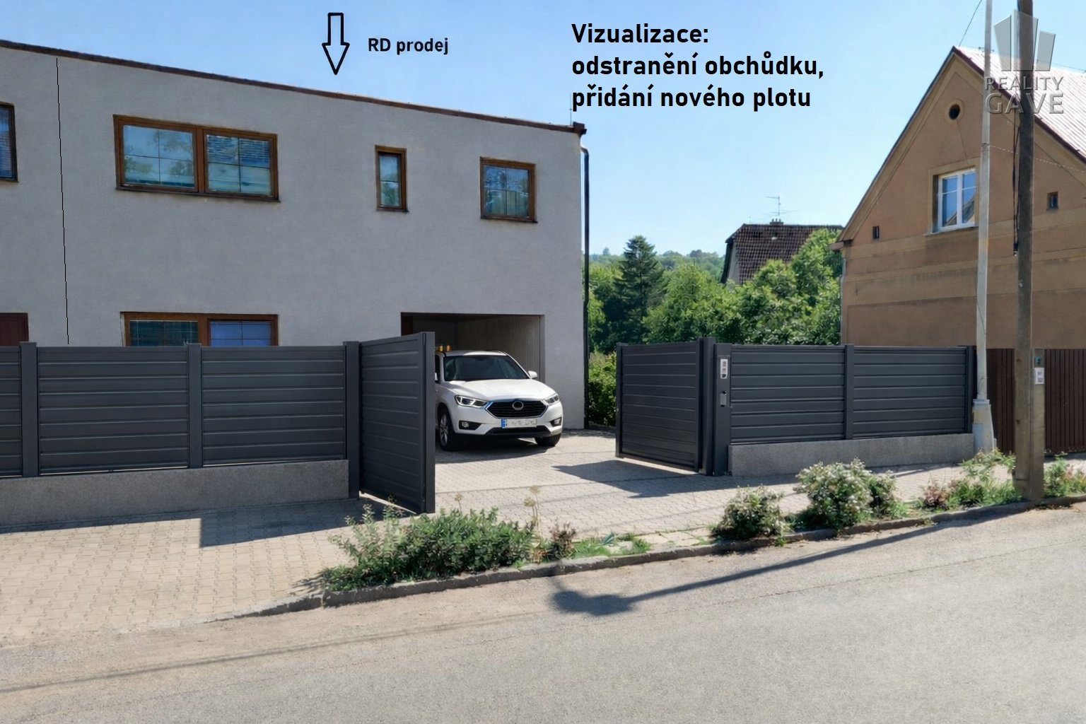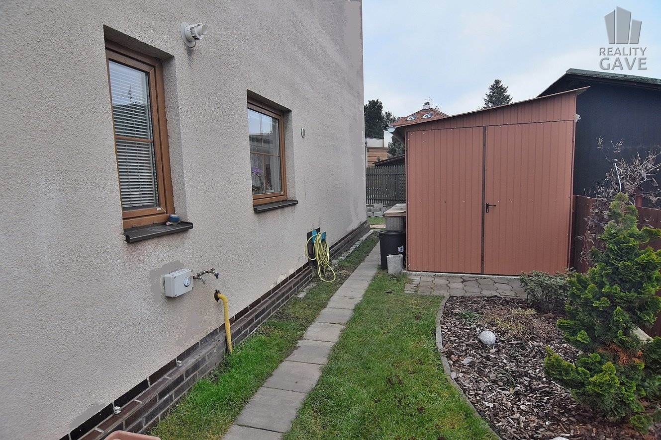 Zahrada: Není veliká a je spíše pro relaxaci než dřinu. Před francouzskými dveřmi z obývacího pokoje s východem na zahradu je dostatečný prostor na terasu s posezením, ideálně krytý před deštěm horním balkonem. Na pozemku zahrady je dále umístěna nová plechová buňka pro potřeby údržby zahrady a domu.