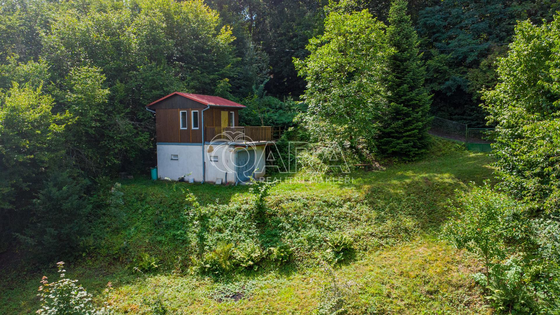 K rekreaci či jako zázemí pro budoucí stavbu lze využít zděnou chatku s garáží.