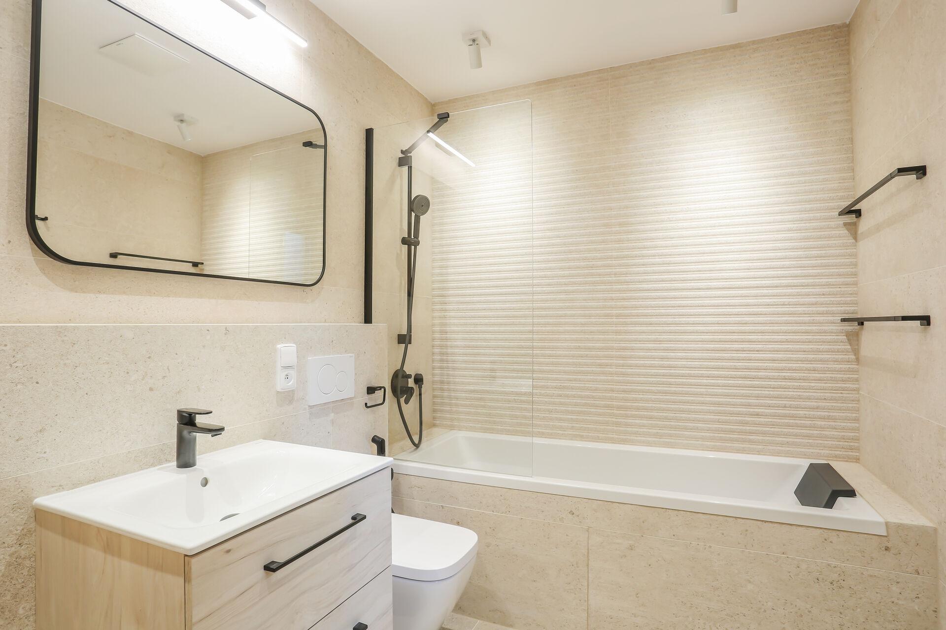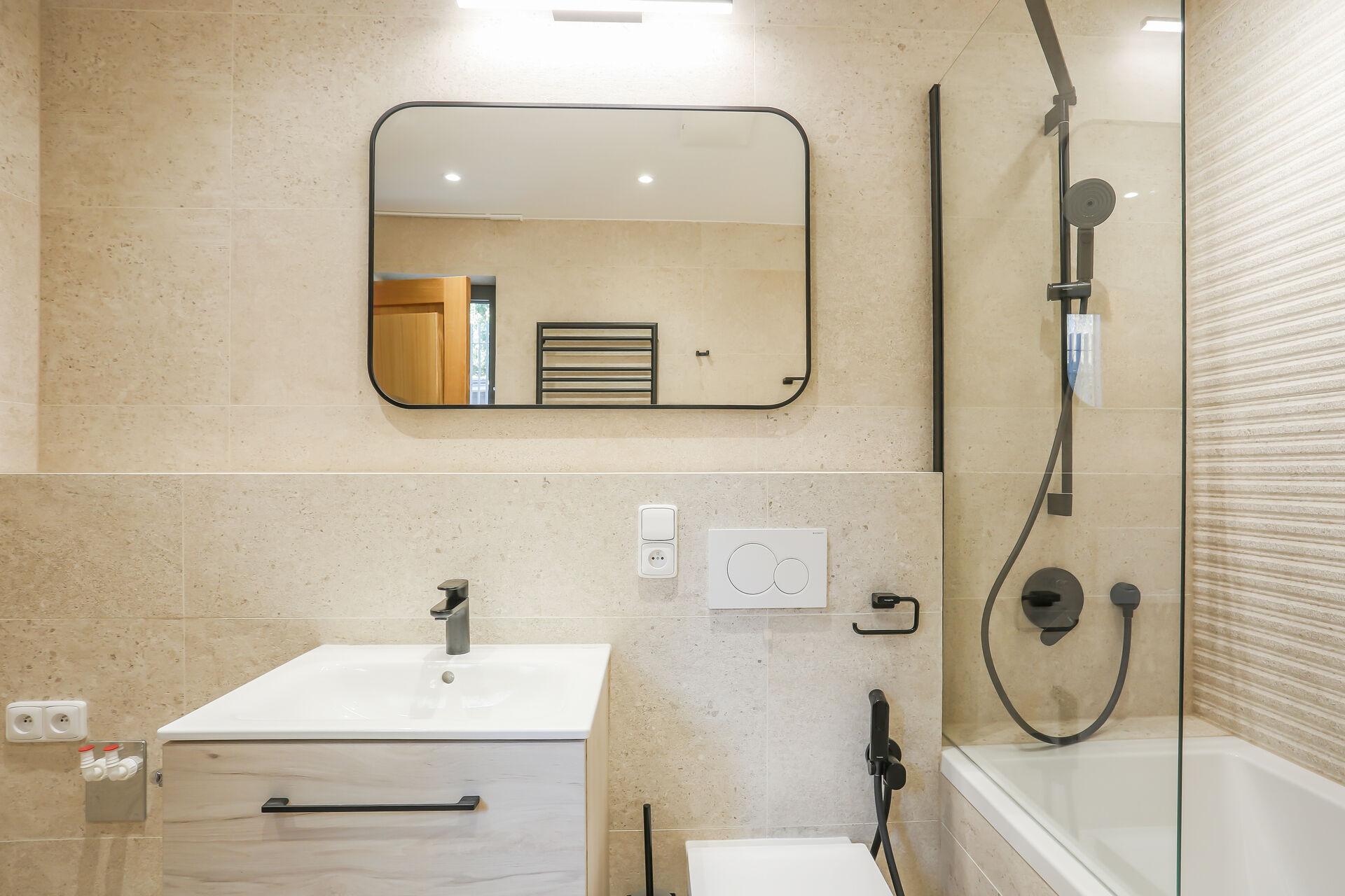 - designová koupelna zařízená vanou s podhlavníkem, vanovou zástěnou pro sprchování, multifunkční sprchou, umyvadlem s umyvadlovou skříňkou, zrcadlem, otopným žebříkem, závěsnou toaletou s bidetovou sprchou, ventilátorem s přímým odtahem zápachu z toalety, luxusní španělskou velkoformátovou kamennou dlažbou s kamenickými rohy, příprava na připojení pračky a separátní sušičky