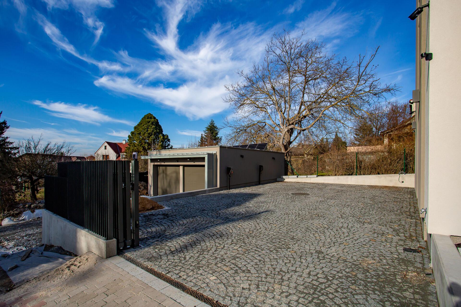 K domu náleží 4 venkovní parkovací stání na uzavřeném parkovišti s možností pronájmu za částku 1.500,-Kč/stání. K dispozici jsou také 2 venkovní nabíjecí stanice pro elektromobily.