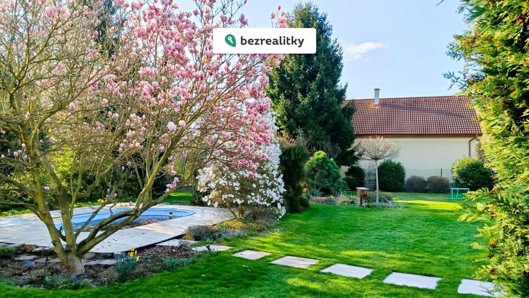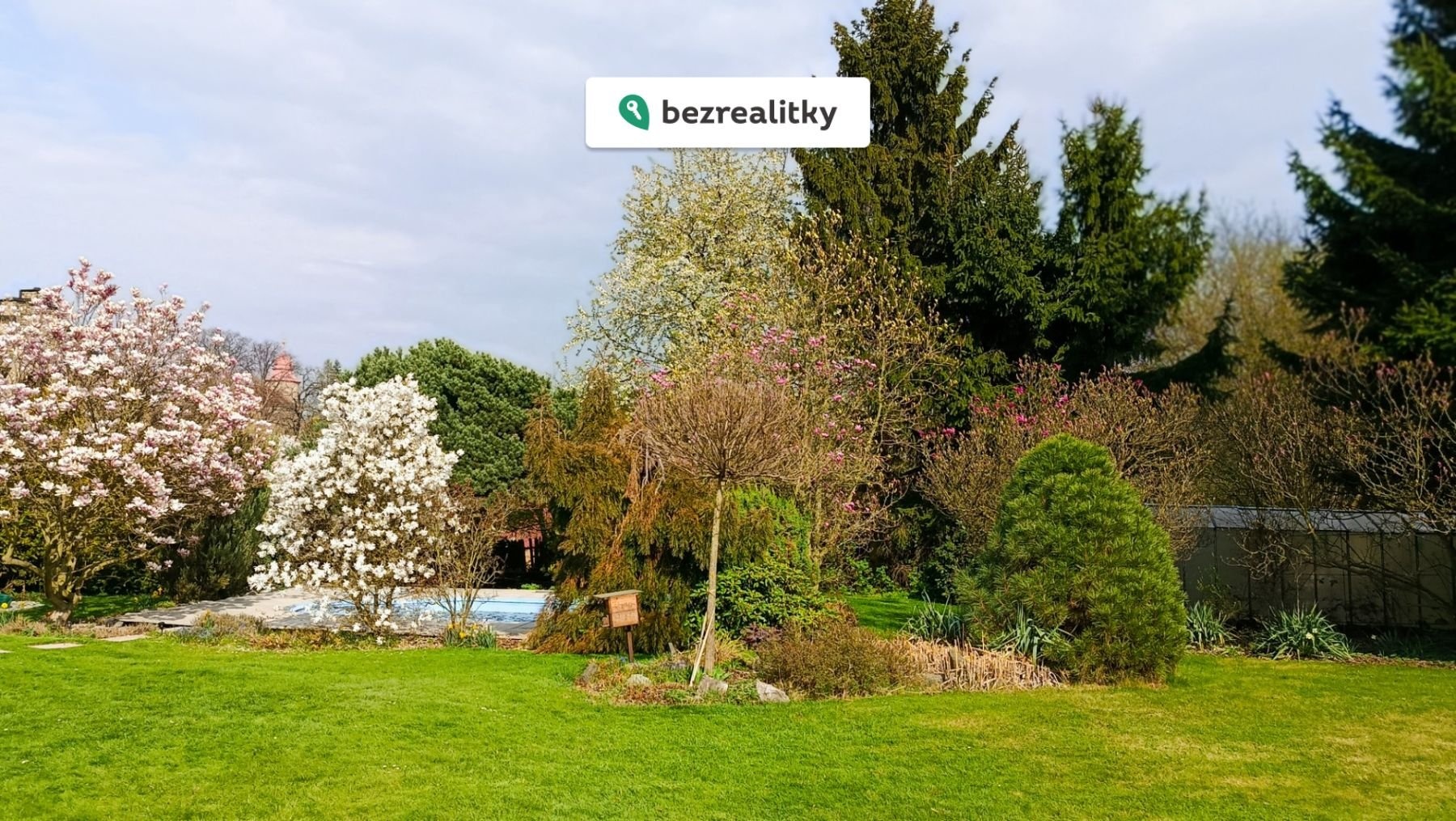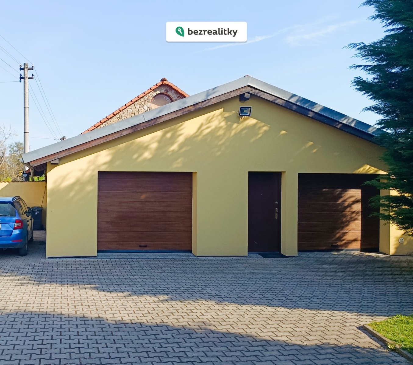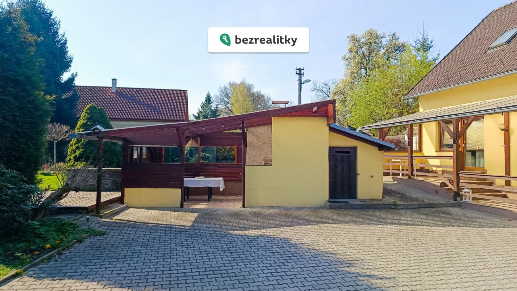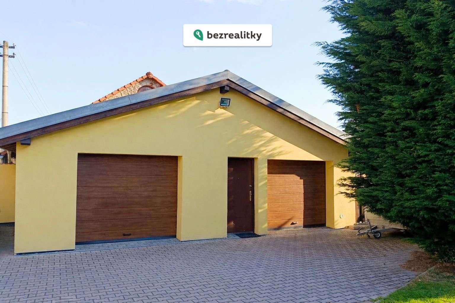K domu dále náleží sklep cca 30 m² se samostatným vstupem, dvougaráž o výměře 64 m², krytá terasa cca 30 m², uzavřená dřevěná pergola s krbem, bazén, skleník a zahradní domek. Vjezd na pozemek je zajištěn dvoudílnými vraty s dálkovým elektrickým ovládáním. Právní přístup k nemovitosti je plně zajištěn.