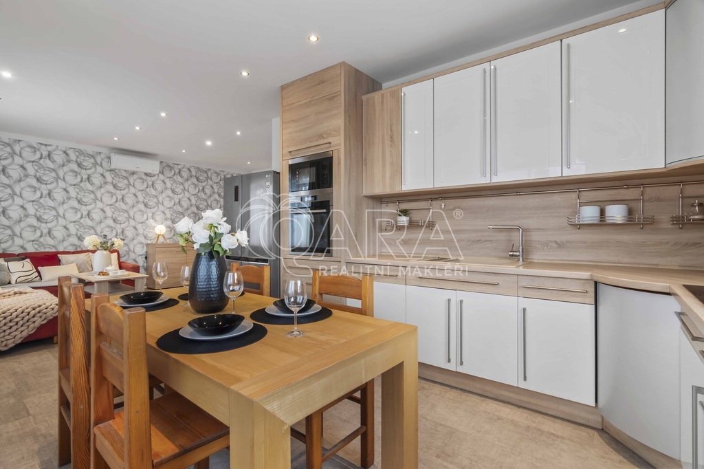 První nadzemní podlaží tvoří předsíň se šatnou (10 m2), prostorný obývací pokoj s kuchyňským koutem (cca 41 m2), koupelna s vanou (3 m2) a samostatná toaleta (1,3 m2). Moderní kuchyňská linka je vybavena vestavnými spotřebiči.