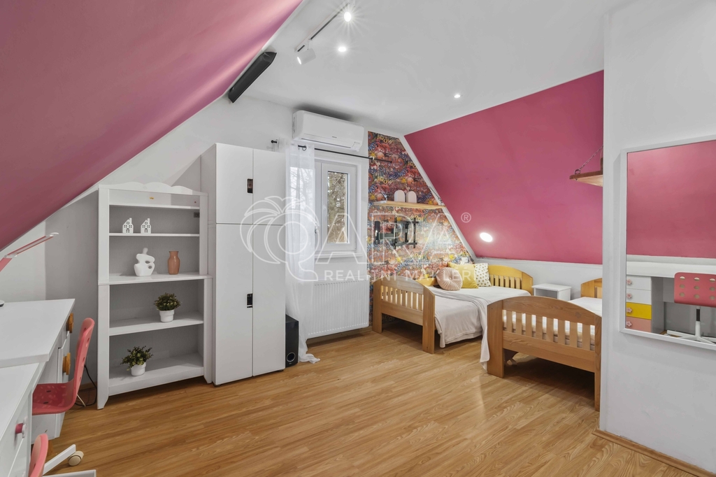Druhé nadzemní podlaží sestává z chodby, dětského pokoje (cca 21 m2), ložnice (cca 12 m2) a koupelny se sprchovým koutem a toaletou (3,2 m2). V půdním prostoru (cca 18 m2) je pak možnost uložení dalších věcí. V suterénu domu se nachází technická místnost s dílnou (cca 17,6 m2).