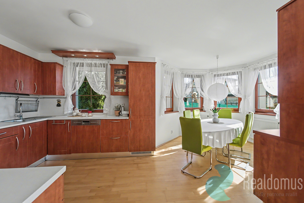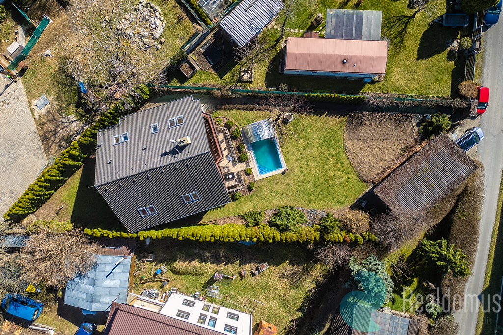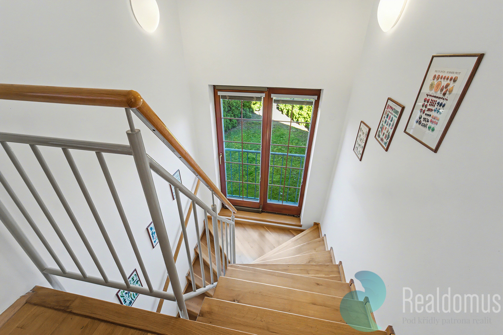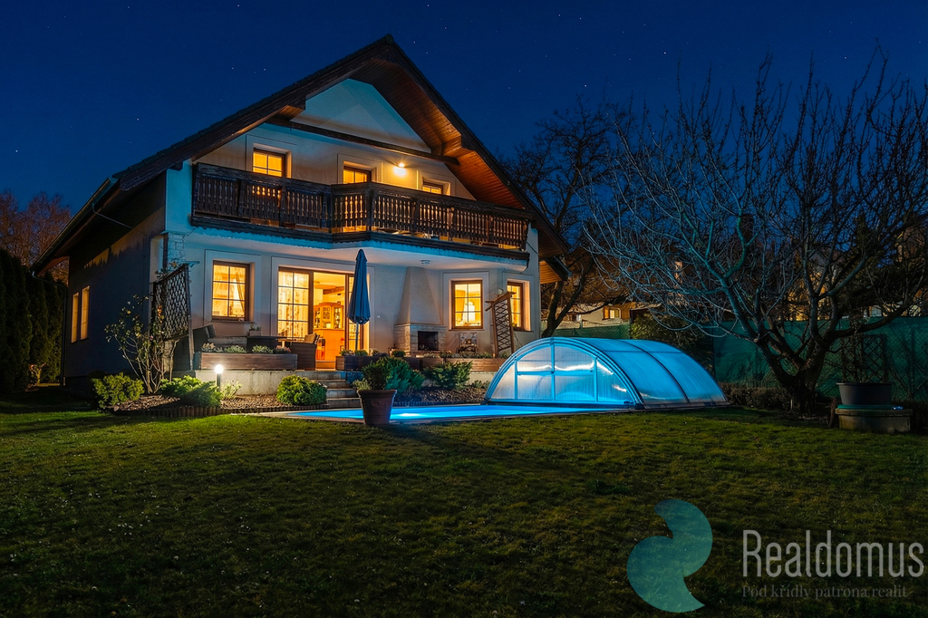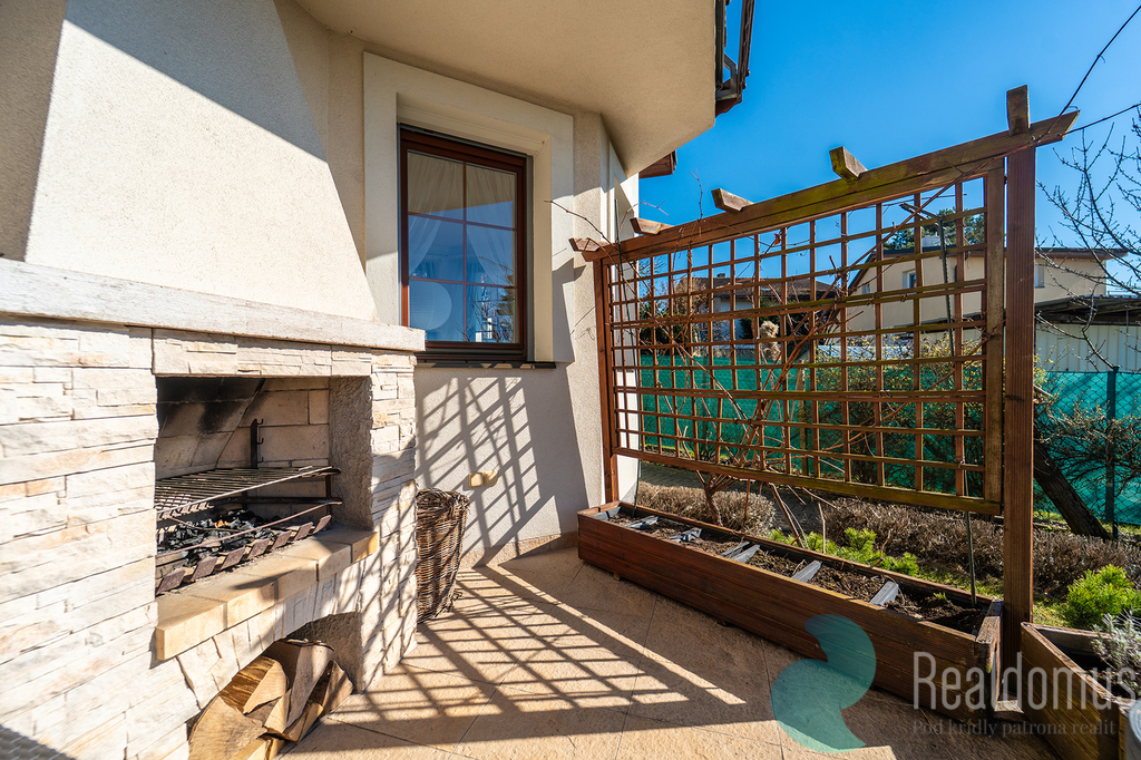 Dominantou domu je velkorysá terasa s krbem (25 m²), která plynule propojuje interiér se zahradou a krytým vyhřívaným bazénem (25 m²). V letních měsících terasa poskytuje plnohodnotný obytný prostor pro odpočinek, rodinná setkání i večery s přáteli. Z balkonu v patře i z terasy v přízemí se navíc otevírá krásný výhled do širokého okolí, jakých v Říčanech mnoho nenajdete.