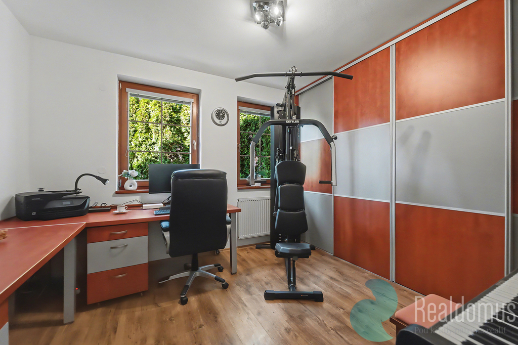 • přízemí: obývací pokoj s krbem, kuchyně, jídelna, pracovna, koupelna, technická místnost, předsíň, spíž
