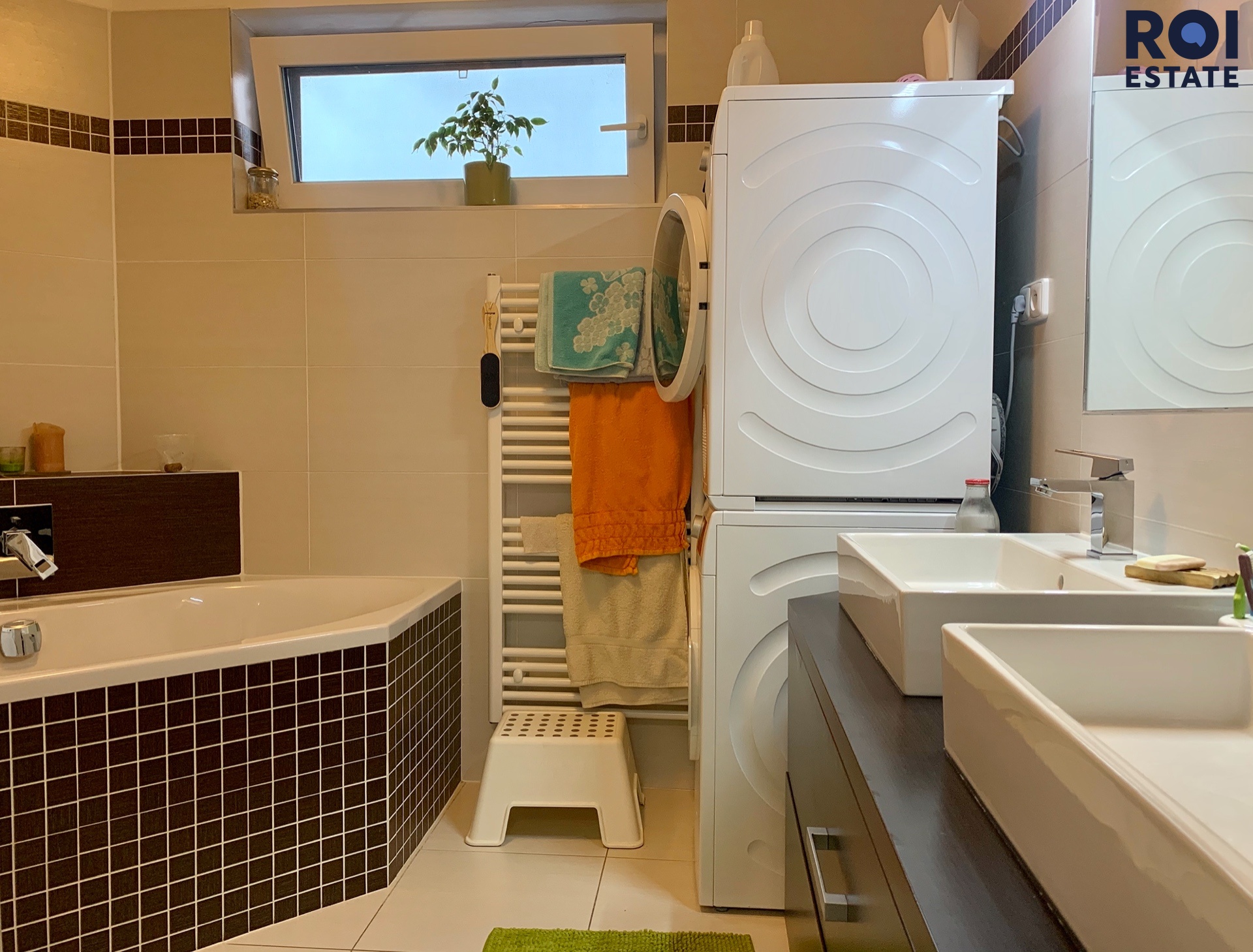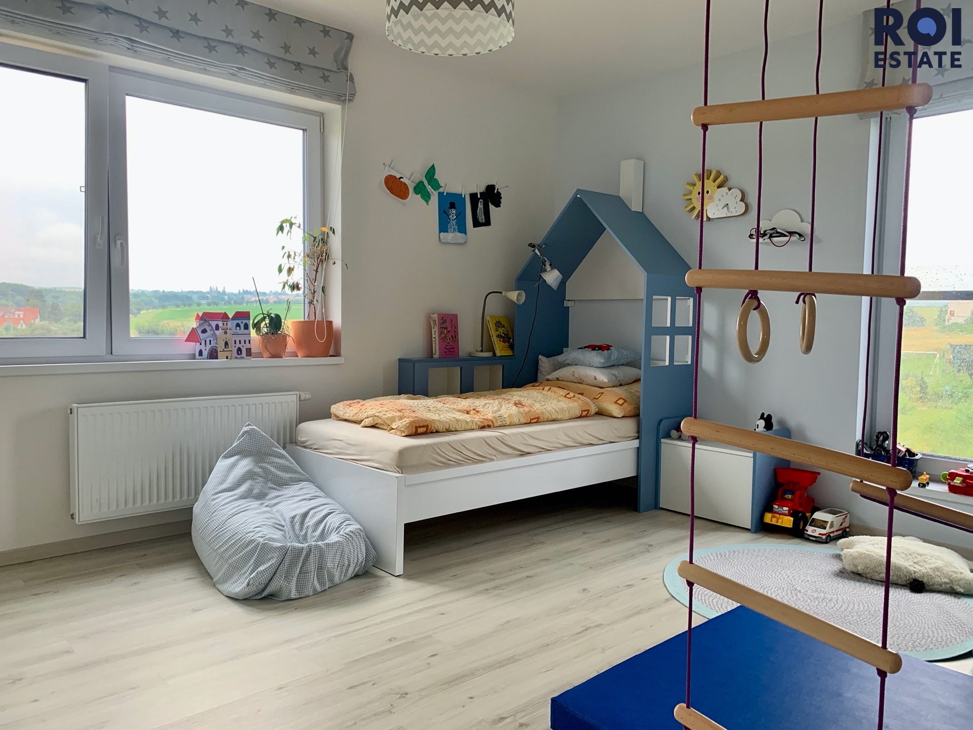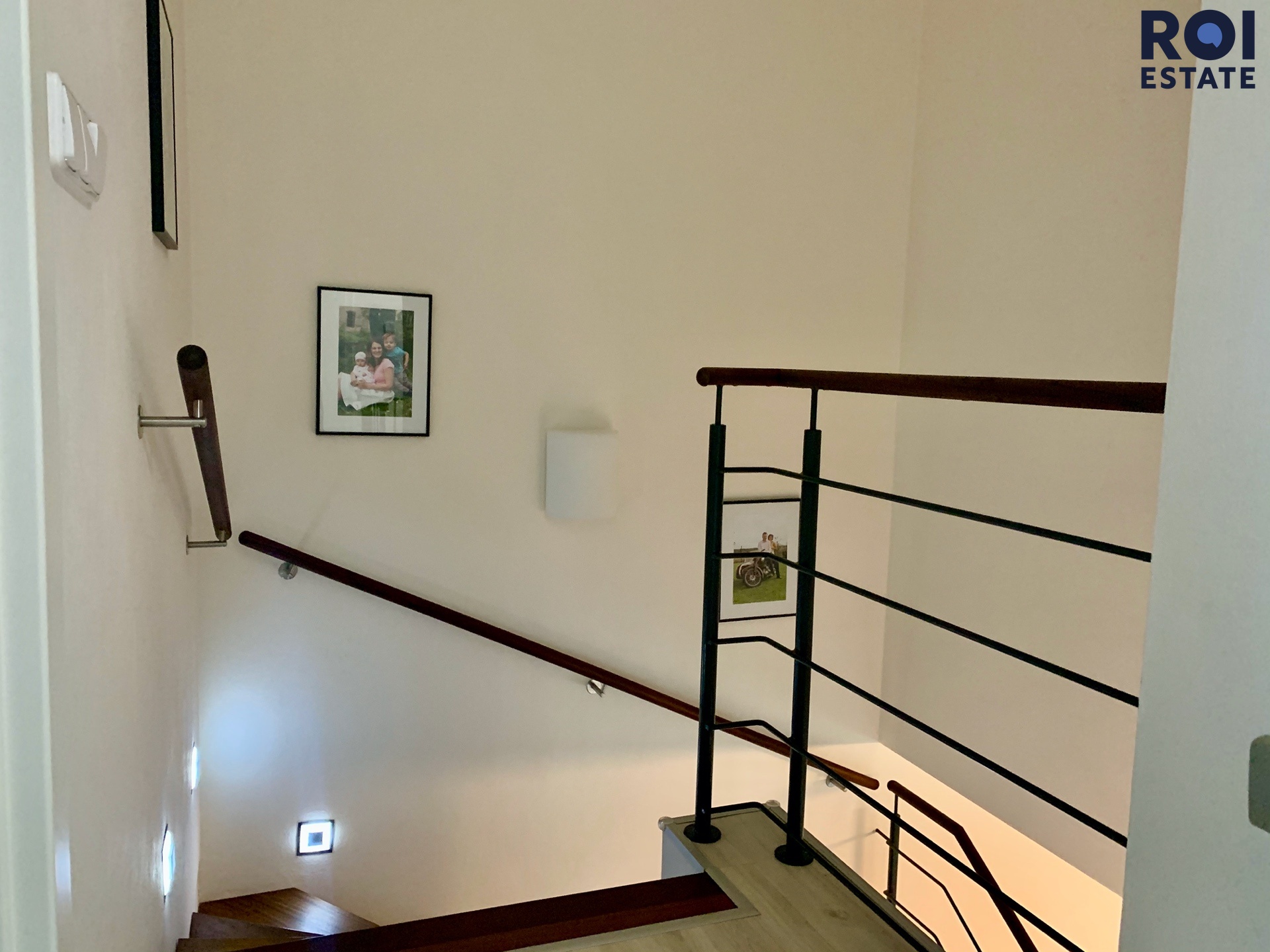 Koupelna nabízí jak vanu, tak sprchový kout, samozřejmostí je i samostatná toaleta. Do druhého patra vede elegantní dřevěné schodiště, které dodává interiéru charakter a útulnost. V horním patře se nacházejí čtyři samostatné pokoje, které lze využít jako ložnice, dětské pokoje nebo pracovny.
