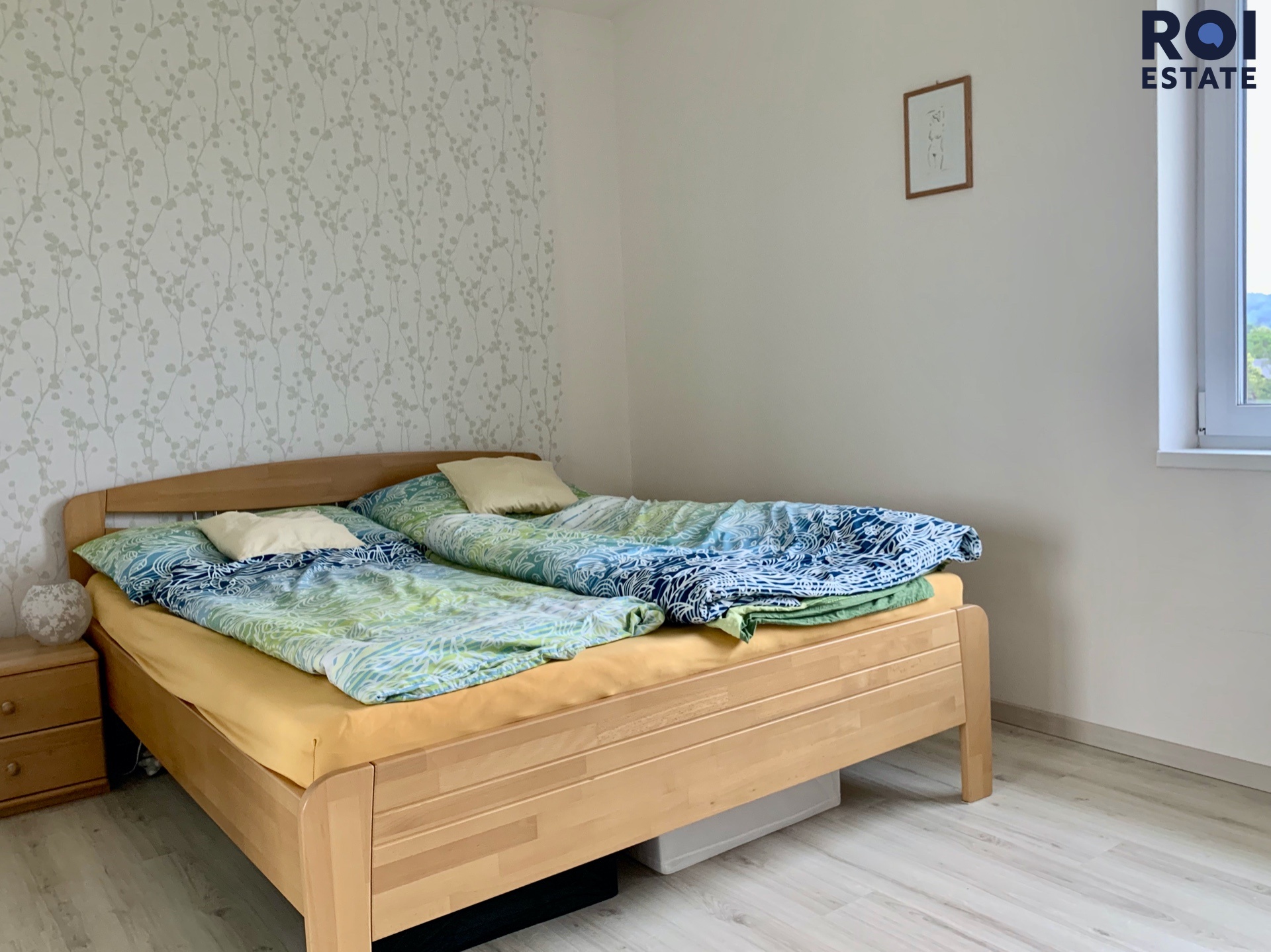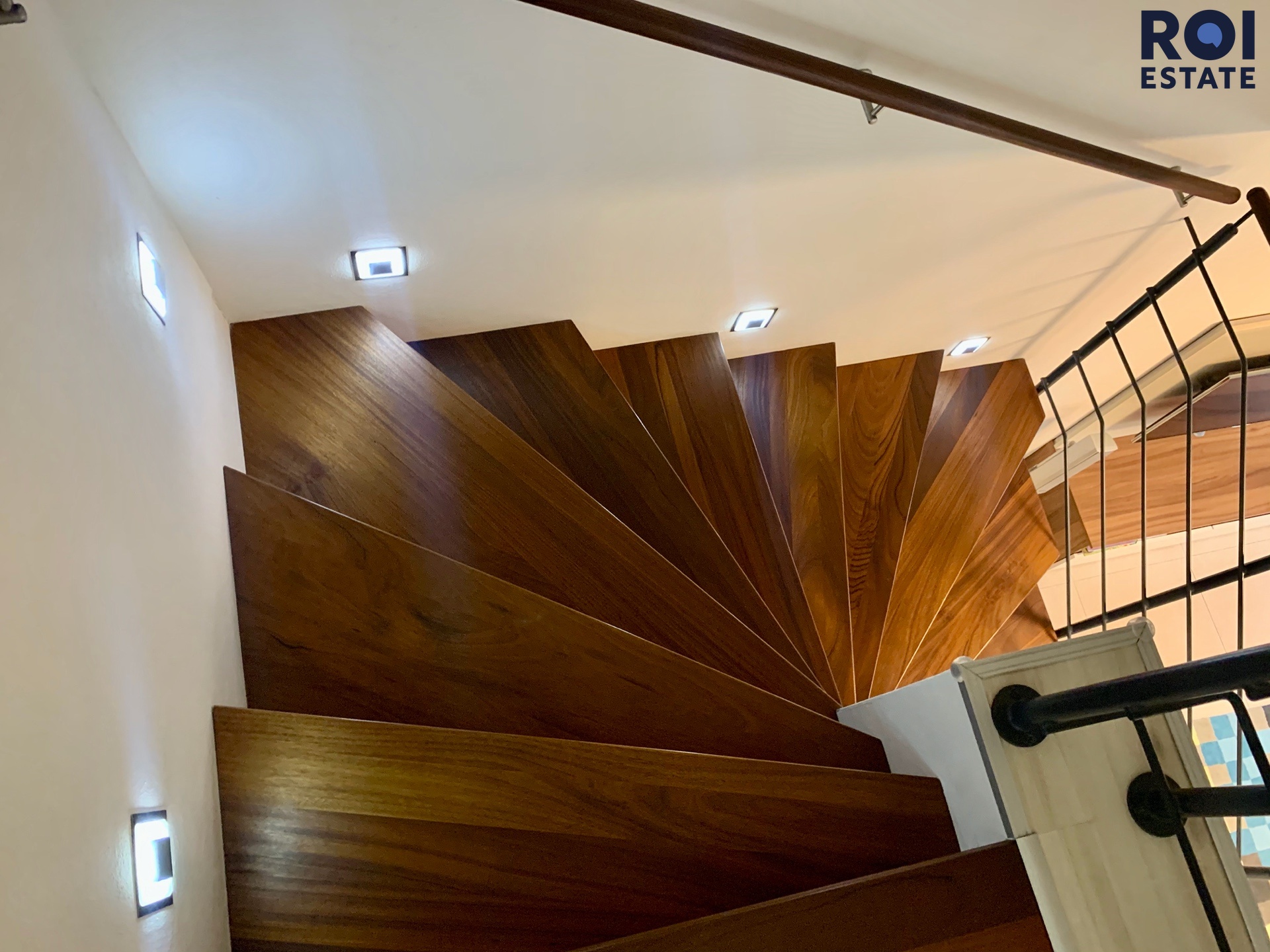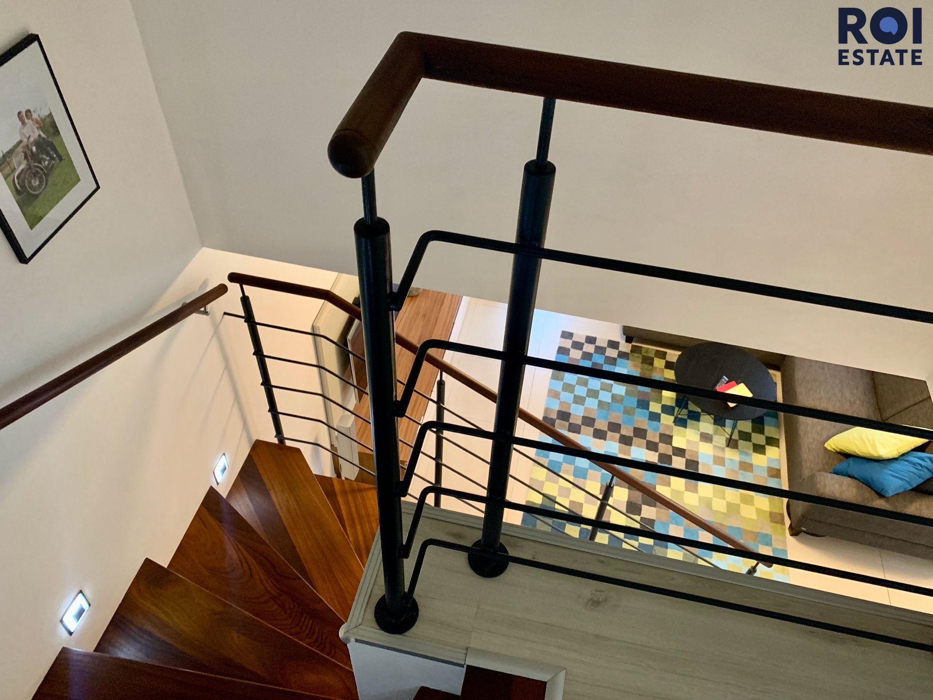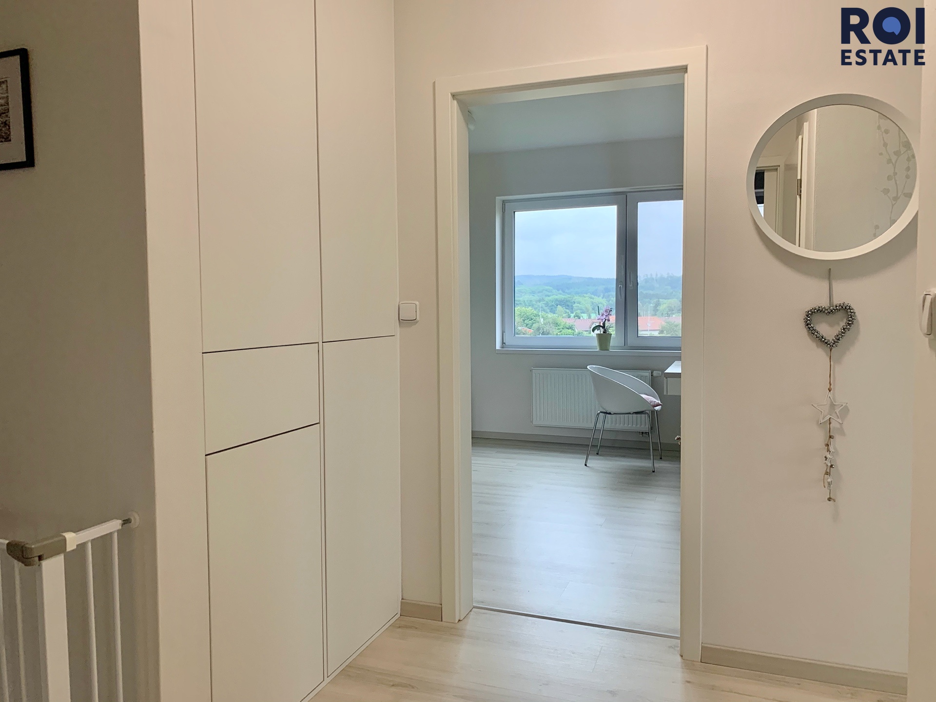 Koupelna nabízí jak vanu, tak sprchový kout, samozřejmostí je i samostatná toaleta. Do druhého patra vede elegantní dřevěné schodiště, které dodává interiéru charakter a útulnost. V horním patře se nacházejí čtyři samostatné pokoje, které lze využít jako ložnice, dětské pokoje nebo pracovny.