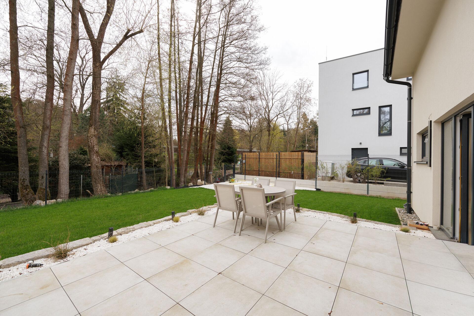 Z obývacího pokoje je vstup terasu a na zahradu s krásným trávníkem. Na konci pozemku protéká potok Rokytka, který svým šumem jen umocní ten pravý požitek při relaxu. Z druhé strany domu se nachází neprůchozí garáž využívaná jako sklad.